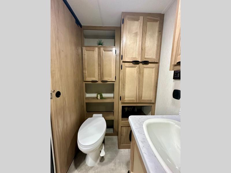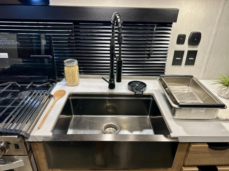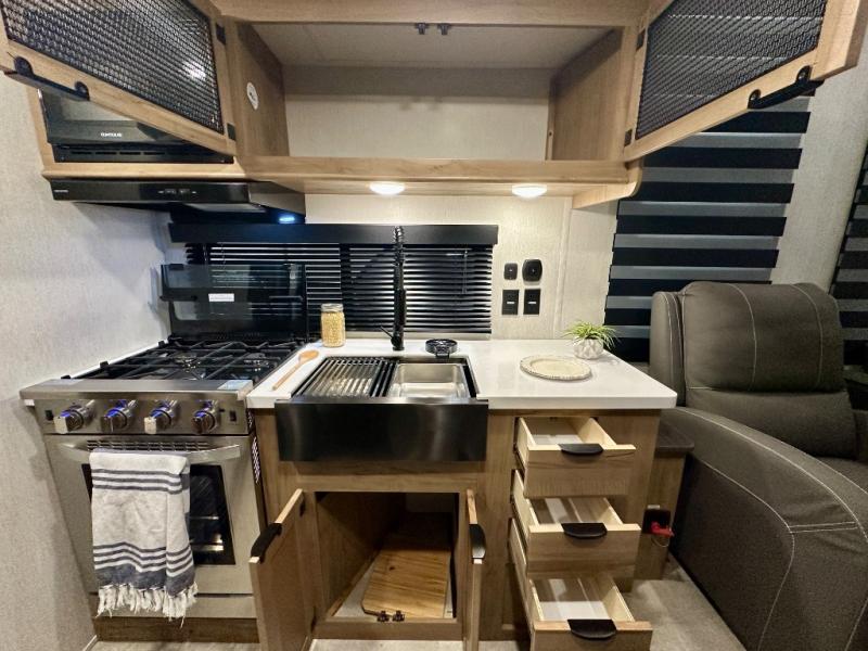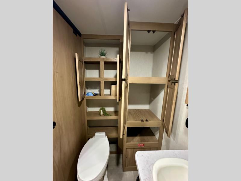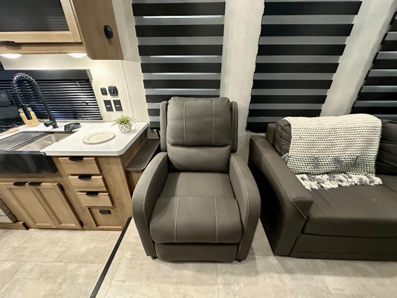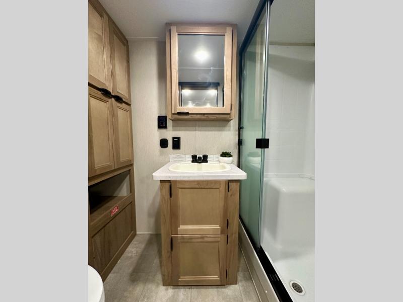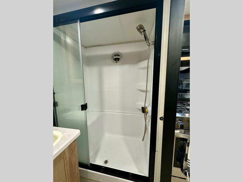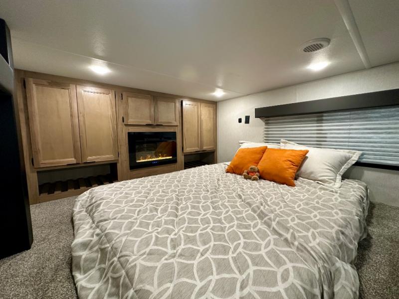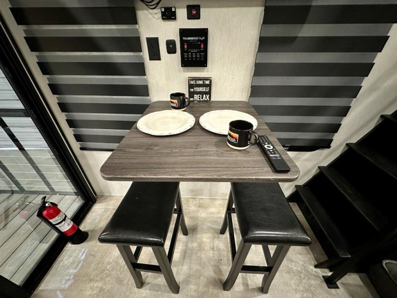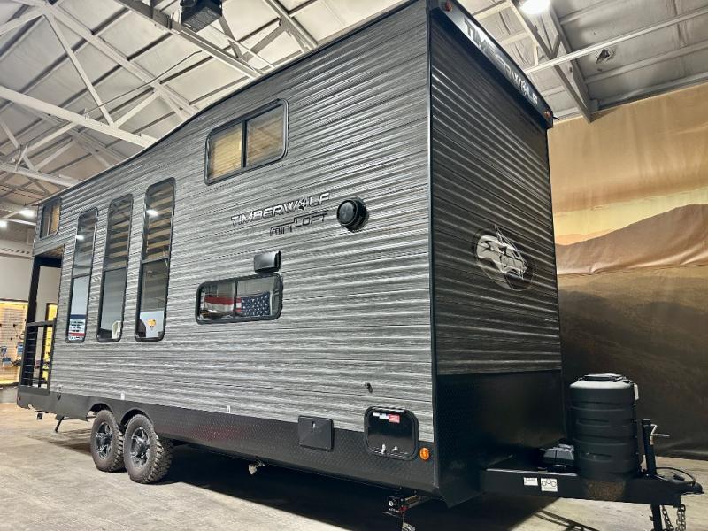 Enjoy comforts of home wherever you decide to roam in a Timberwolf destination trailer by Forest River. The seamless roofing membrane with heat reflectivity and power gear frame technology provide a durable foundation to your RV. You will also appreciate the exclusive solar thermo controlled reflective tinted safety glass windows, tire pressure monitors, and an on-demand tankless water heater to make extended stays easier than ever. Inside, the night shades will provide your crew with privacy, while the LED lights illuminate your space. There are also light filtering sheer shading premium zebra blinds, along with a premium bedding ensemble and comforter, USB charging stations, a supersized central A/C unit, and many more comforts!