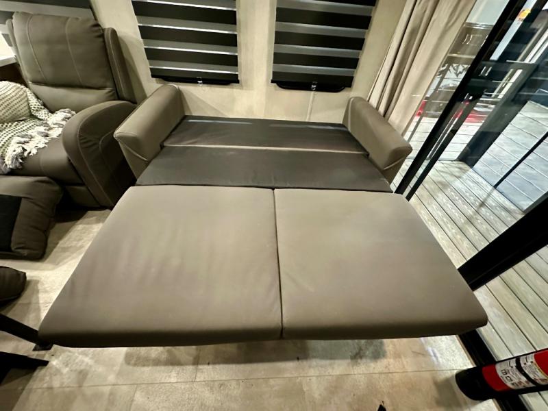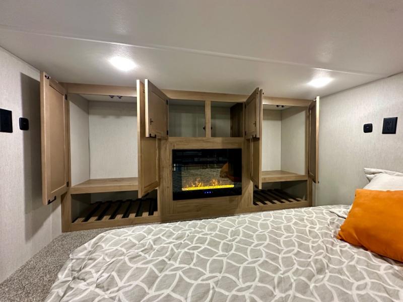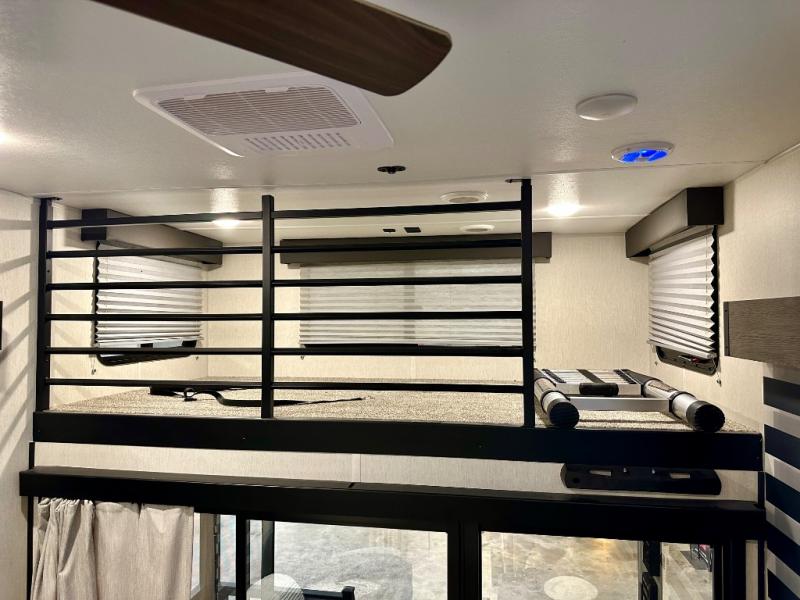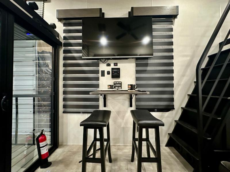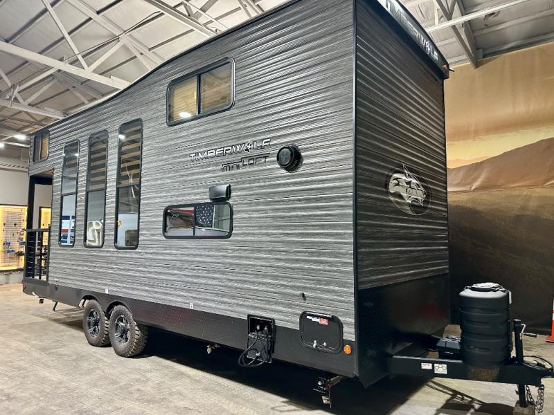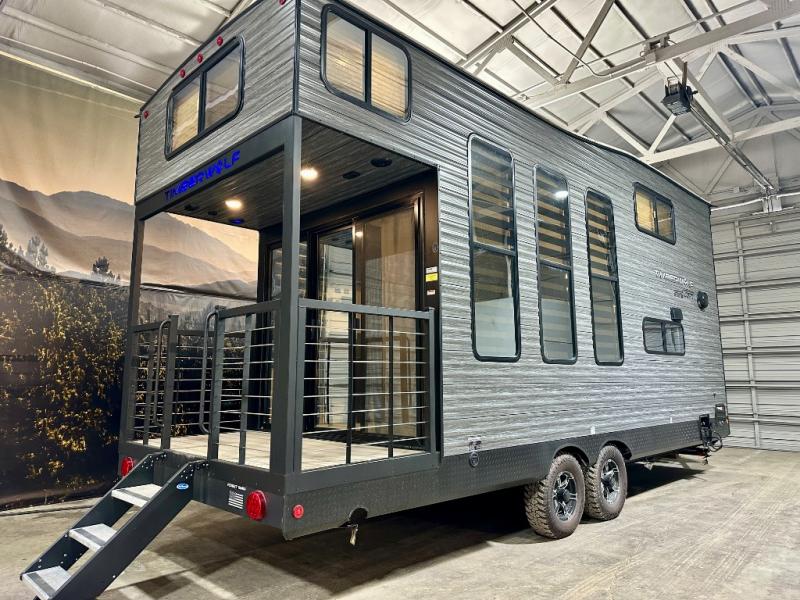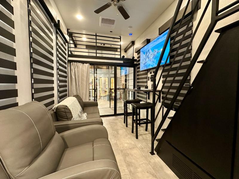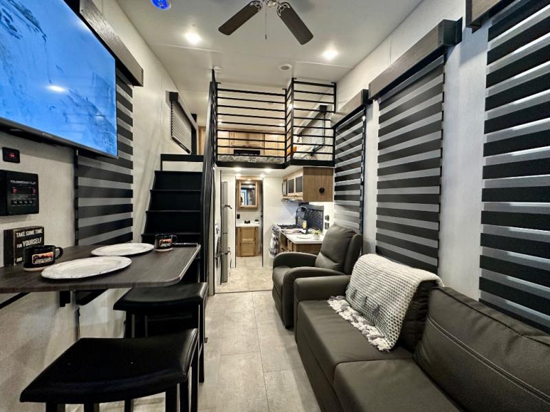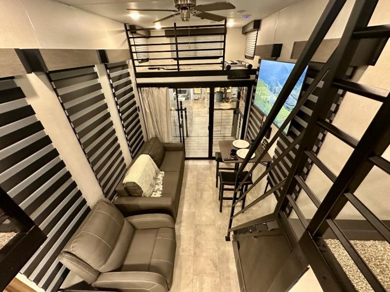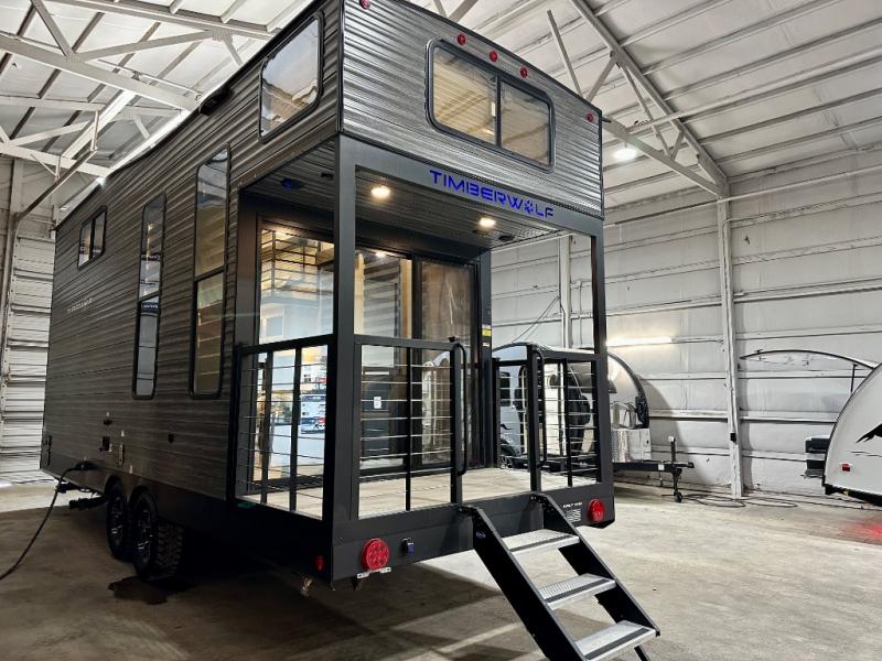 You will fall in love with this mini-loft Timberwolf that will feel more like a tiny home. There are steps leading up to the loft with a queen bed, cabinets, and even a fireplace! The kitchen includes a cooktop and a microwave oven to prepare meals, plus a refrigerator to keep perishables fresh. You'll enjoy relaxing on the 58" sofa, dining at the high top table, or reading a book on the lounge chair. There is also a rear deck with patio doors where you can spend your evenings together, and there is even a second loft above the deck for added sleeping or storage space!