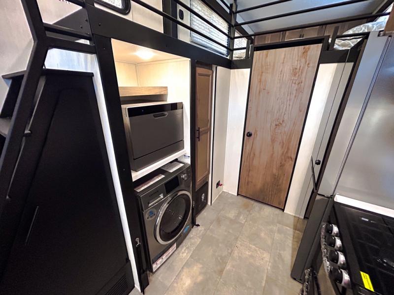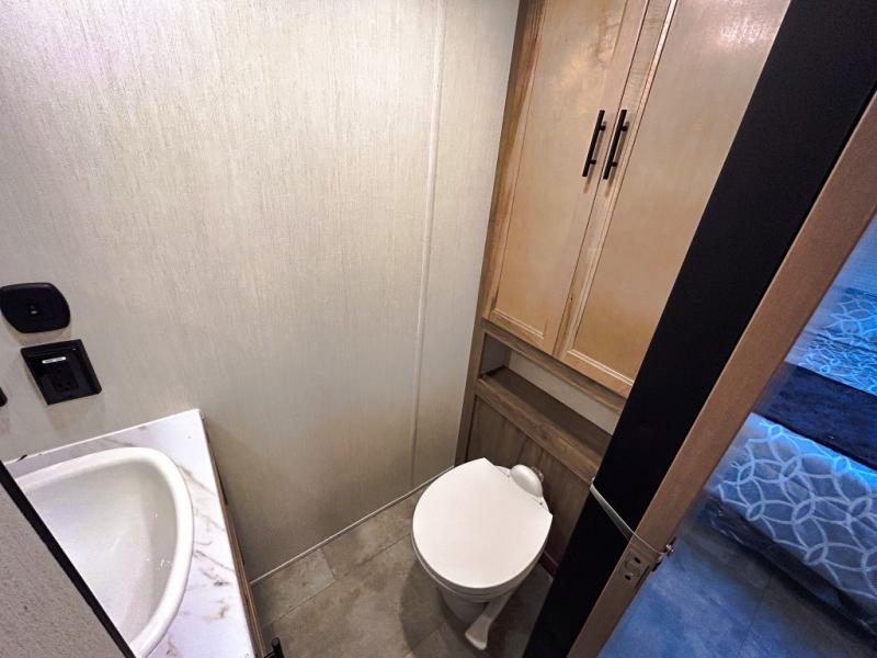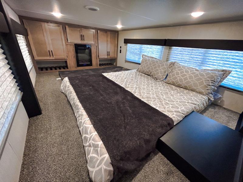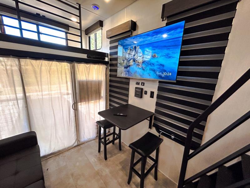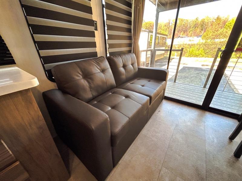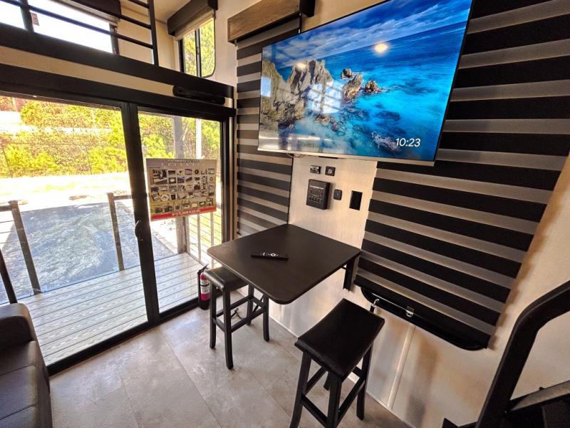 This model is similar to 16ML but larger! A bigger bathroom, king bed in the lower master, and a queen bed plus a twin bunk mat in the front loft. There is an 18 cu. ft. refrigerator so you can stock up for a week long vacation, a hide-a-bed sofa that can transform into added sleeping for guests, and a high top table with two stools to dine at. A ladder allows access into the upper front loft that is over the covered patio. The bathroom below is split with a shower on one side, and a private toilet area and sink opposite. And the view is amazing from just about anywhere inside.