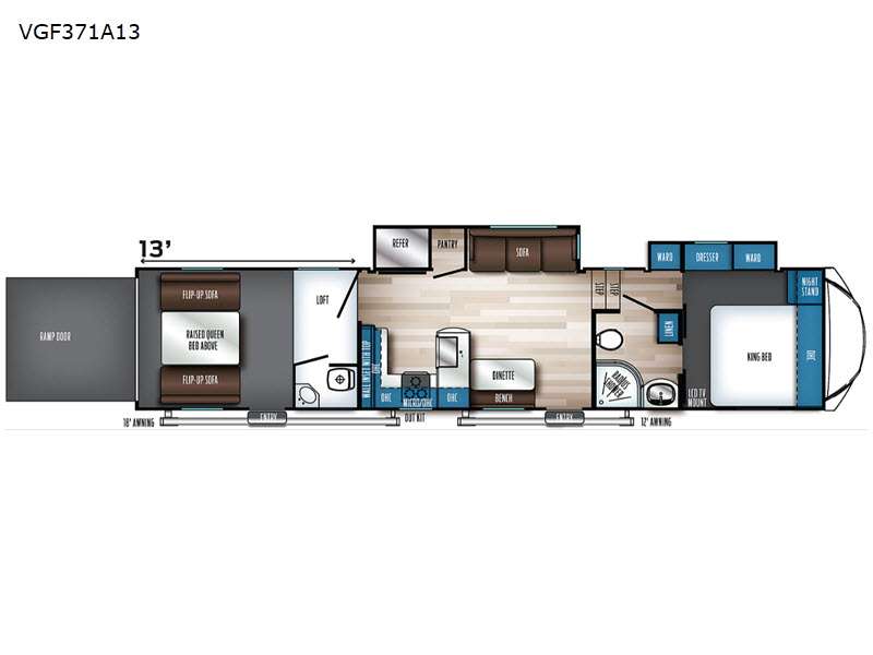 Every one of these Forest River Vengeance Rogue Armored fifth wheel toy haulers come with the features you want most at an affordable price tag! The DuraPoxy gas/oil resistant floor has 5,000 lb. tie downs to ensure your toys will arrive safely without damaging the flooring, plus the 3,000 lb. rated ramp door makes it easy to load them. Two 15,000 BTU A/Cs are "Super H Ducted" to keep you cool even on the hottest summer days, and an enclosed and heated underbelly keeps your unit's vitals protected all year long. The Rogue Armored package comes with a six point leveling system, a comfort plus adjustable powered king bed system, and a ramp door patio rail system. There are also two additional packages packed with features to make camping hassle-free!