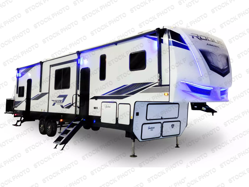 Every one of these Forest River Vengeance Rogue Armored fifth wheel toy haulers come with the features you want most at an affordable price tag! The DuraPoxy gas/oil resistant floor has 5,000 lb. tie downs to ensure your toys will arrive safely without damaging the flooring, plus the 3,000 lb. rated ramp door makes it easy to load them. Two 15,000 BTU A/Cs are "Super H Ducted" to keep you cool even on the hottest summer days, and an enclosed and heated underbelly keeps your unit's vitals protected all year long. The Rogue Armored package comes with a six point leveling system, a comfort plus adjustable powered king bed system, and a ramp door patio rail system. There are also two additional packages packed with features to make camping hassle-free!