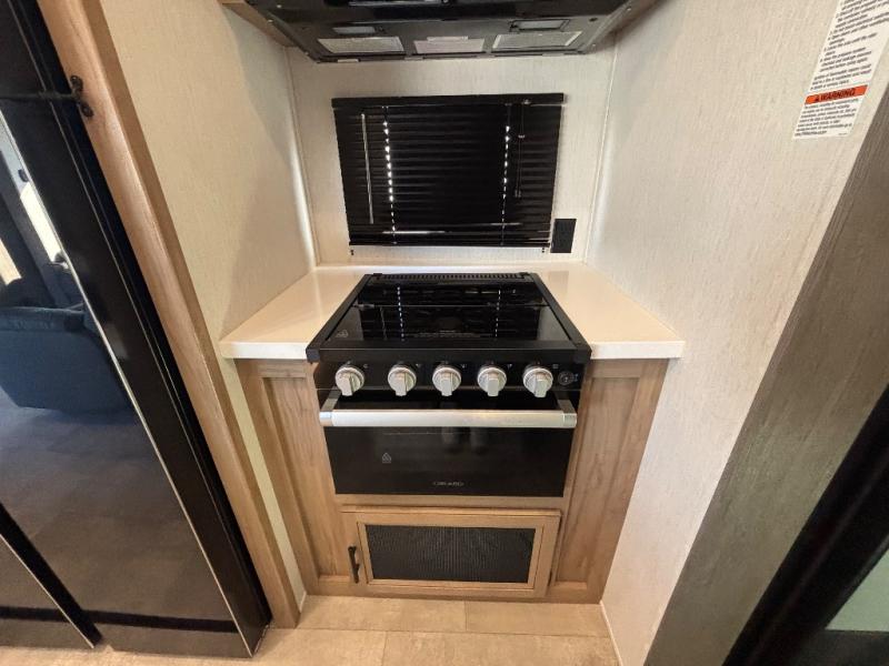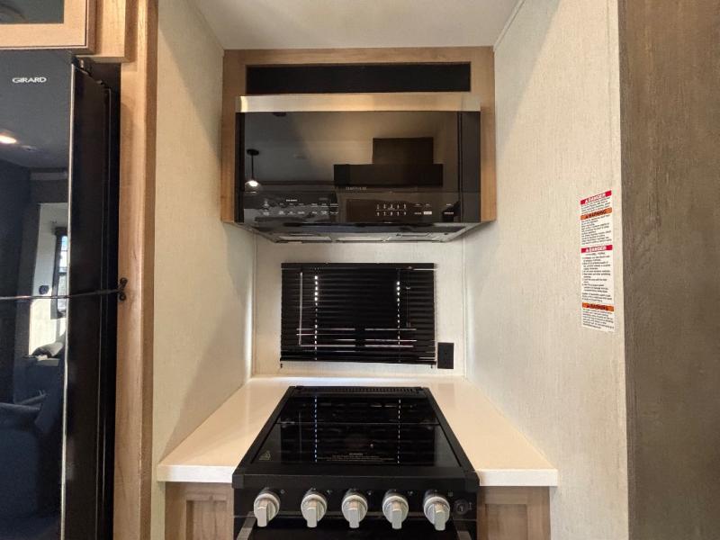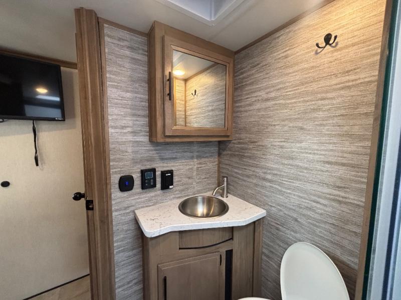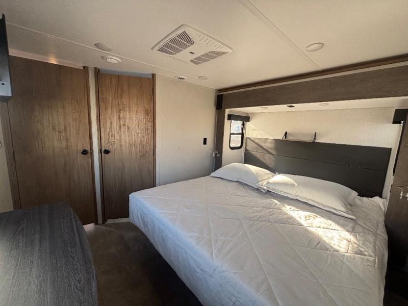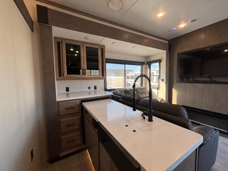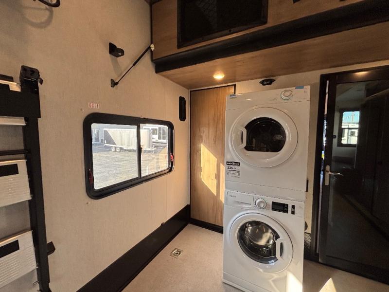 Hit the trails with this triple slide out toy hauler! Once your dirt bikes are unloaded from the 14' 6" garage, you can relax on the dual flip-up sofas with a free-standing table. There is also a raised queen bed above the sofas, a half bath plus a loft, making this space perfect for guests! The chef of your group will find a counter peninsula to prep meals, a 16 cu. ft. 12V black glass residential style refrigerator, plus a 30" microwave when you need to heat up leftovers. Your crew can get comfortable on the L-shaped sofa or the second sofa, and there is a large flat screen TV for movie night! Head up front to the master bedroom that includes a king bed slide out, a large front wardrobe and a dresser with a TV hookup, plus your own private bathroom!