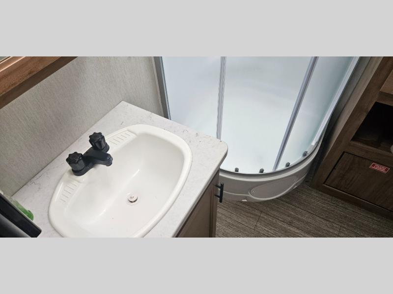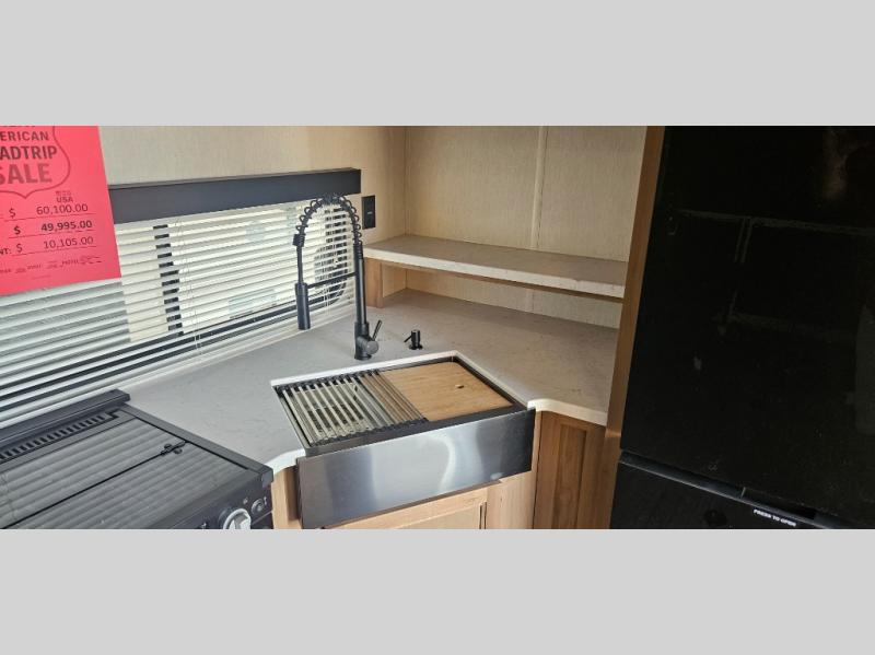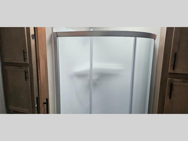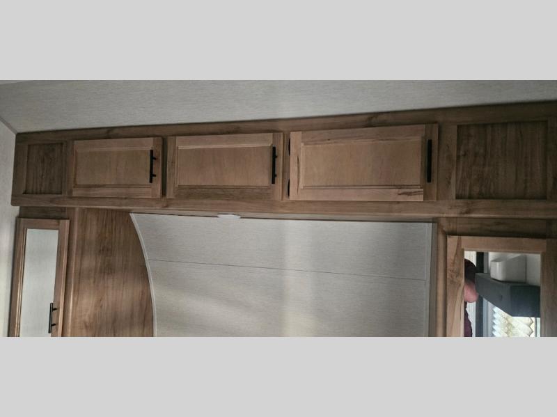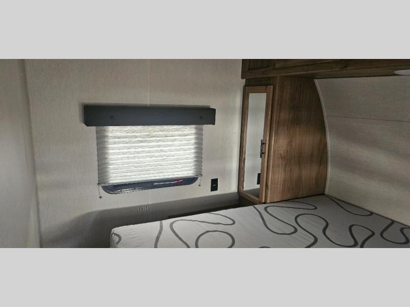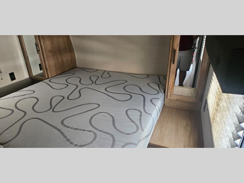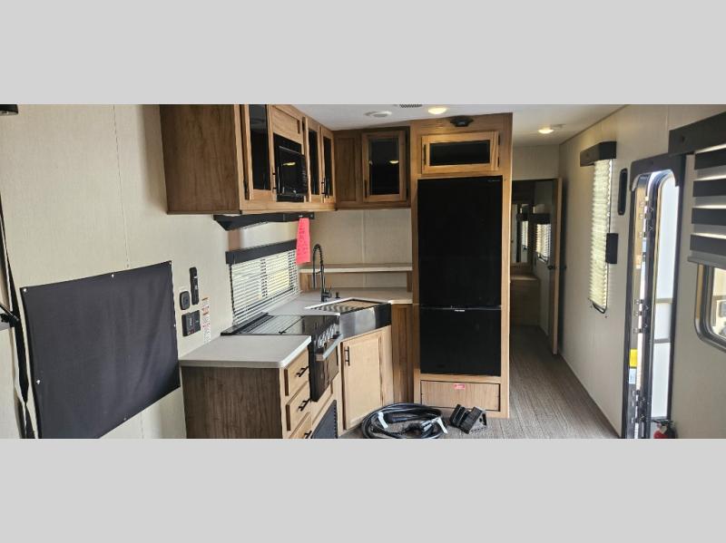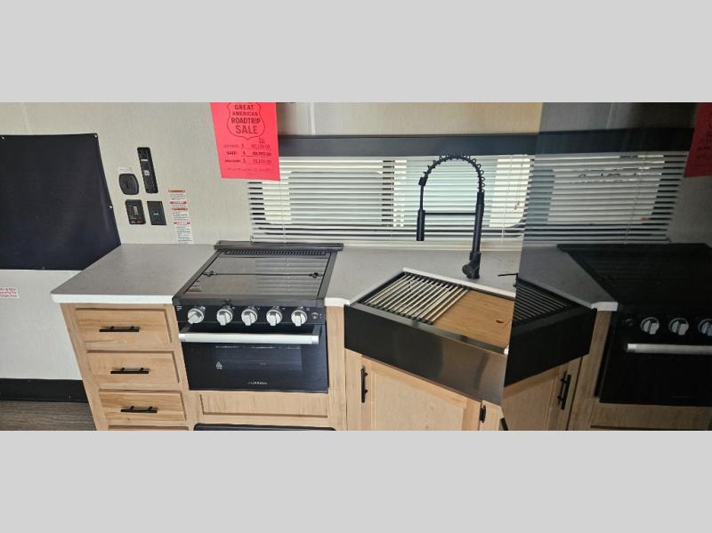 You'll love camping in this toy hauler with 14' 1" total garage space when you use the space in the kitchen. There are two roll-over sofas with a quick set queen bed system above where you can relax during the day and let guests stay overnight. A three burner range with an oven and a 1000 watt microwave will let you prepare lunch after a trail ride, and the full bath with a radius shower will be waiting for you to clean up. Head up to the front to enjoy the private bedroom with a king bed, dual wardrobes, and overhead storage for all your gear. This model also includes a 30 gallon fuel station, outside storage, a tankless water heater, and many more hassle-free features!