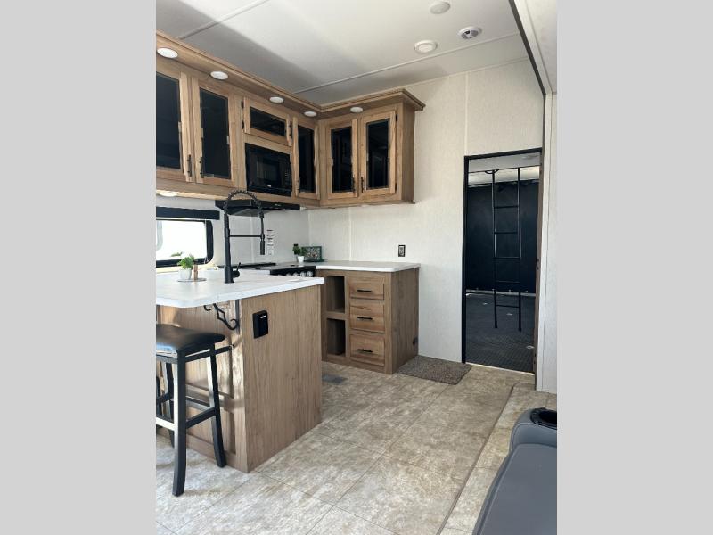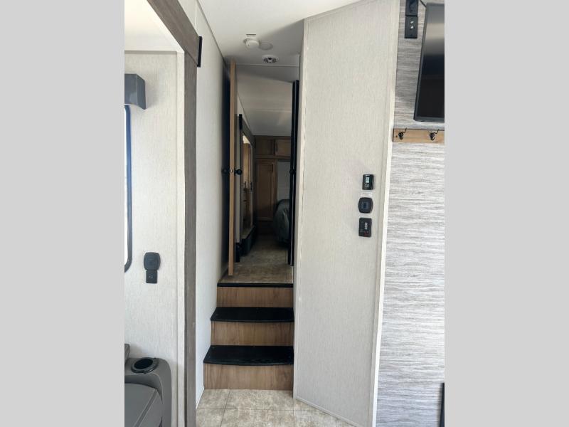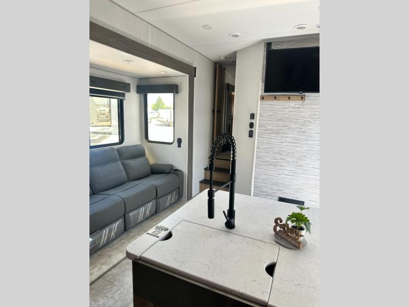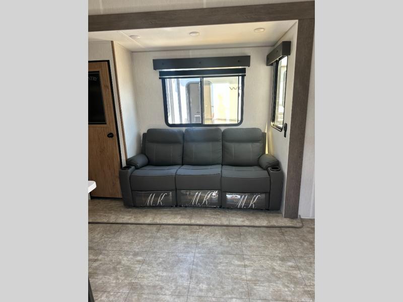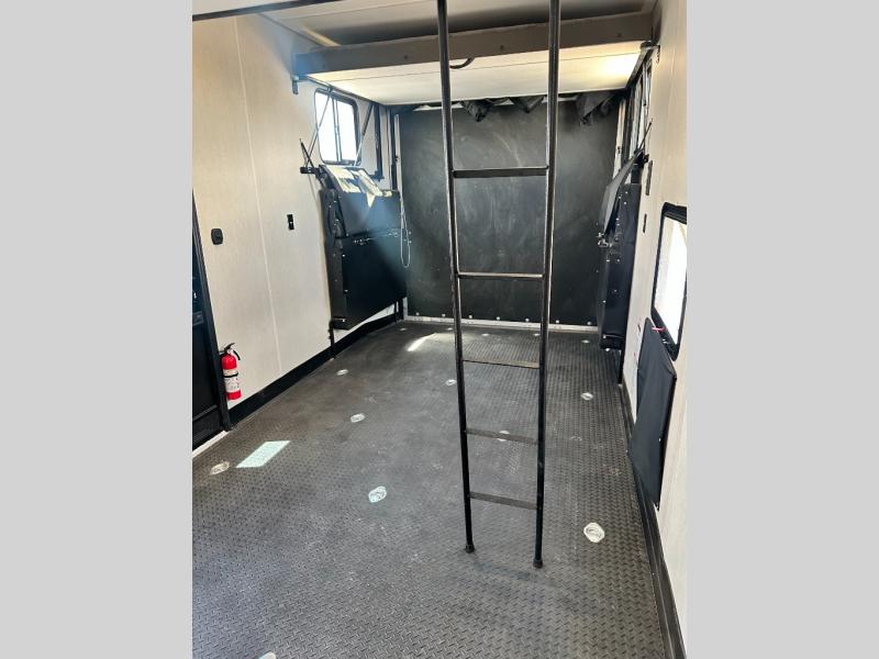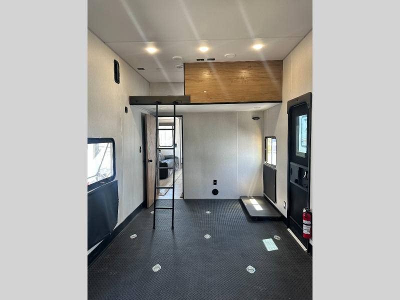 You'll love every minute spent in this spacious toy hauler with 17' of toy parking space!. Once your toys are unloaded using the ramp door, relax on the dual flip-up sofas in the separate garage that also includes a free-standing table. There is also a loft here for more sleeping space or storage space in the front of the garage, and a side man door allowing you quick access to the garage separately when the ramp is closed. Head to the main living/kitchen area to make a meal on the cooktop, dine at the table in the garage or at the counter with barstools. The front master bedroom will feel just like home with its king bed, wardrobe slide out for added floor space, plus quick and easy access to the dual entry bath!
