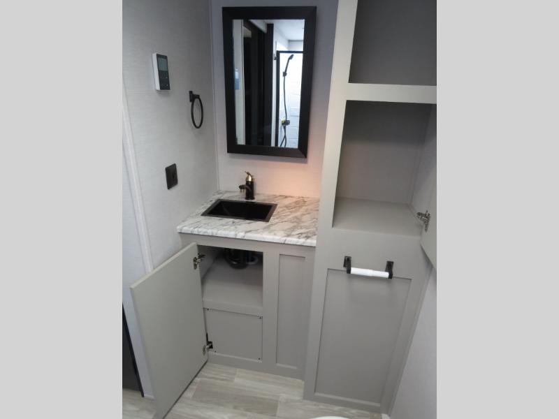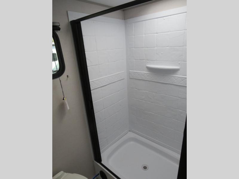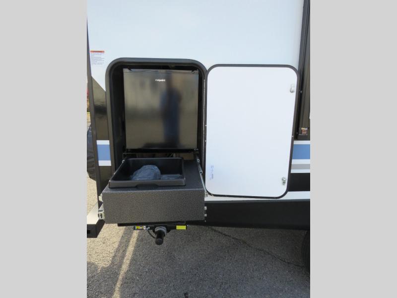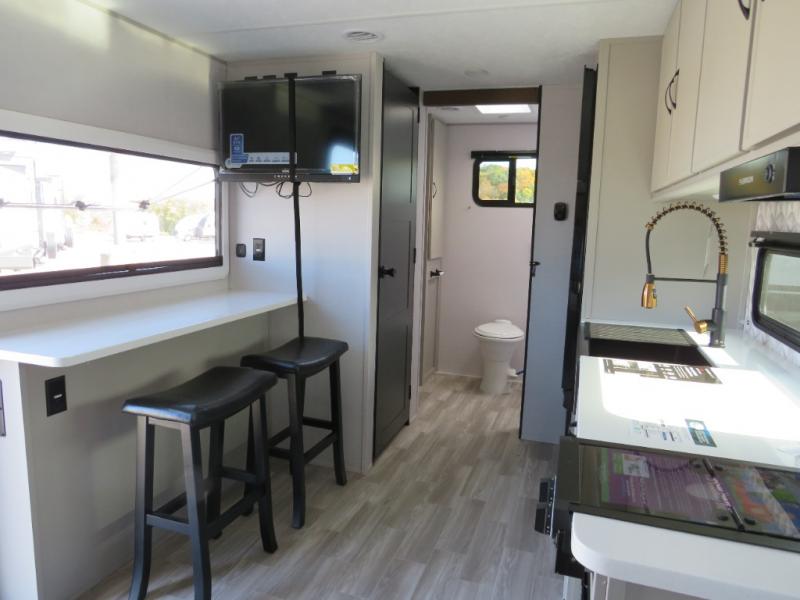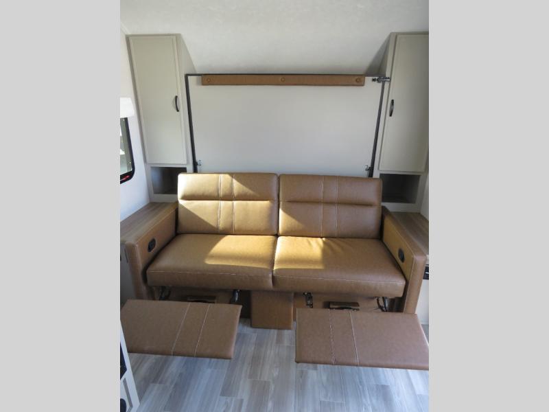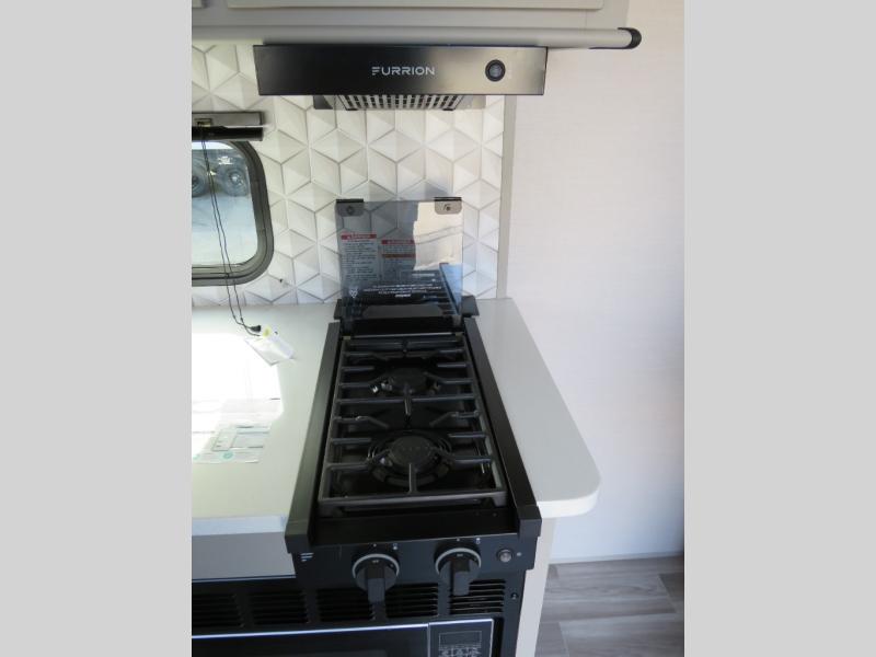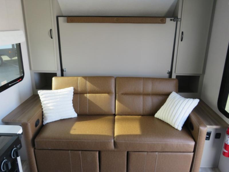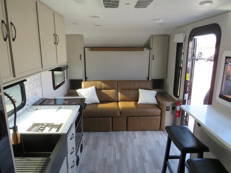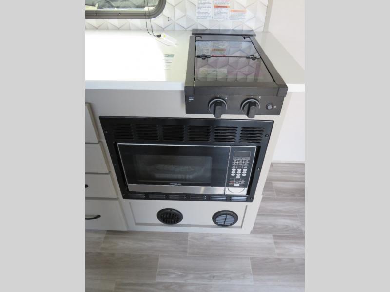 You will love camping every other weekend in this spacious travel trailer for three to four. There is a full rear bath with a spacious shower and medicine cabinet for your toiletries. You can relax on the jackknife sofa during the day and at night transform it into a Murphy bed. Easily prepare your meals in the kitchen on the three burner cooktop or in the oven. There is also an upgraded 10.7 cu. ft. residential refrigerator, plus a convection microwave oven for meals on the go. The bar top with two stools is the perfect place to enjoy your meals as you have a flip-open window to let in some fresh air. This model also includes an outside kitchen with an induction cooktop, a 14' power awning, plus an outside spray port for convenience!