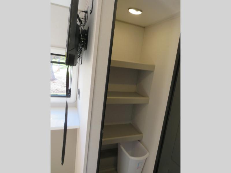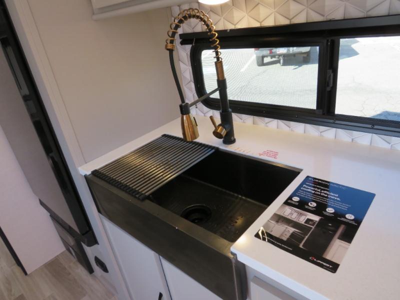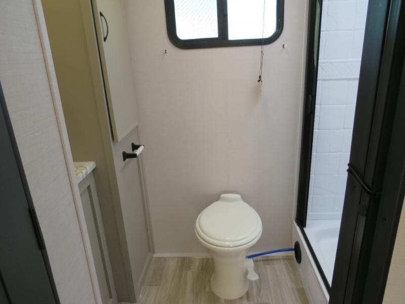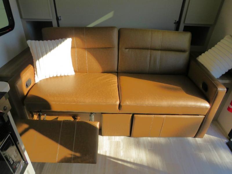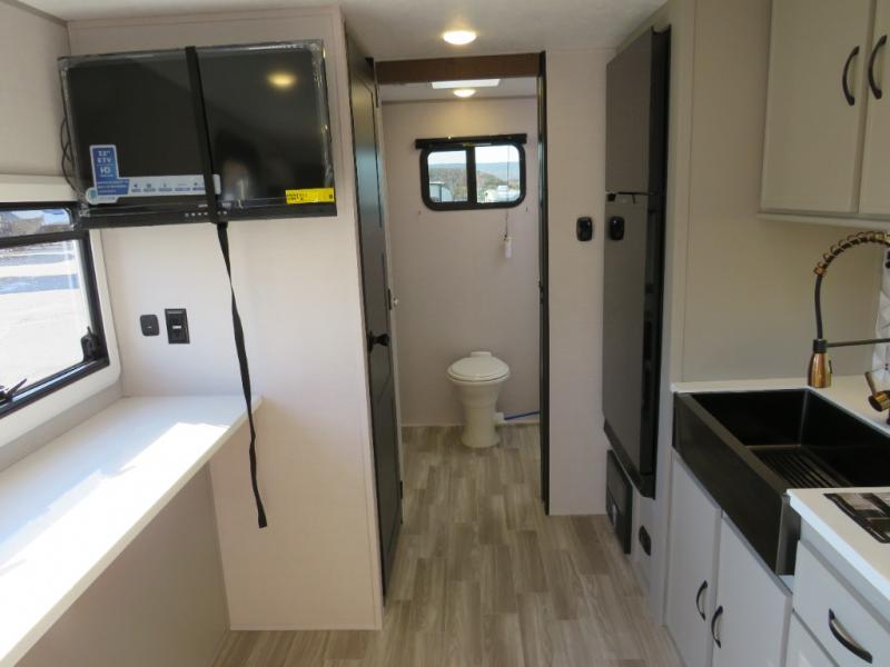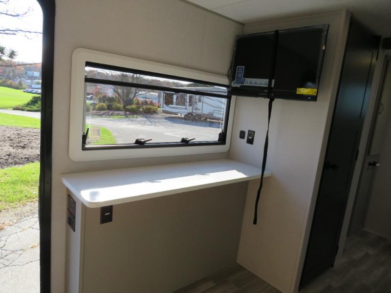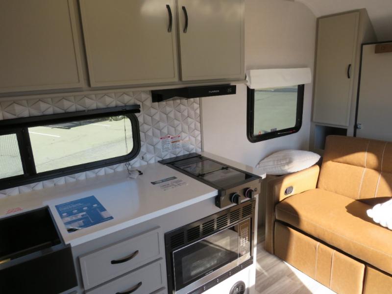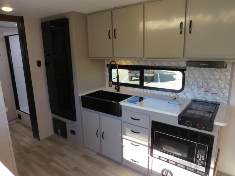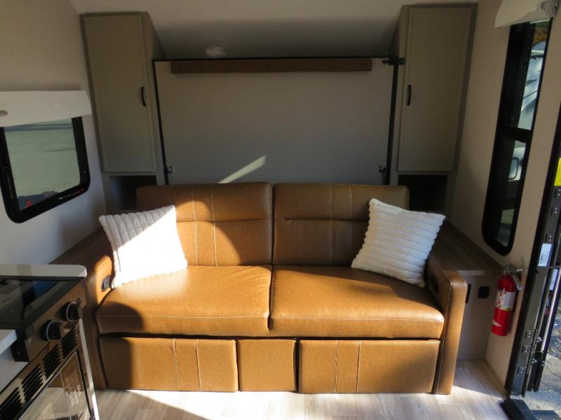 You will love camping every other weekend in this spacious travel trailer for three to four. There is a full rear bath with a spacious shower and medicine cabinet for your toiletries. You can relax on the jackknife sofa during the day and at night transform it into a Murphy bed. Easily prepare your meals in the kitchen on the three burner cooktop or in the oven. There is also an upgraded 10.7 cu. ft. residential refrigerator, plus a convection microwave oven for meals on the go. The bar top with two stools is the perfect place to enjoy your meals as you have a flip-open window to let in some fresh air. This model also includes an outside kitchen with an induction cooktop, a 14' power awning, plus an outside spray port for convenience!