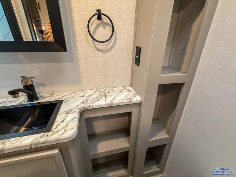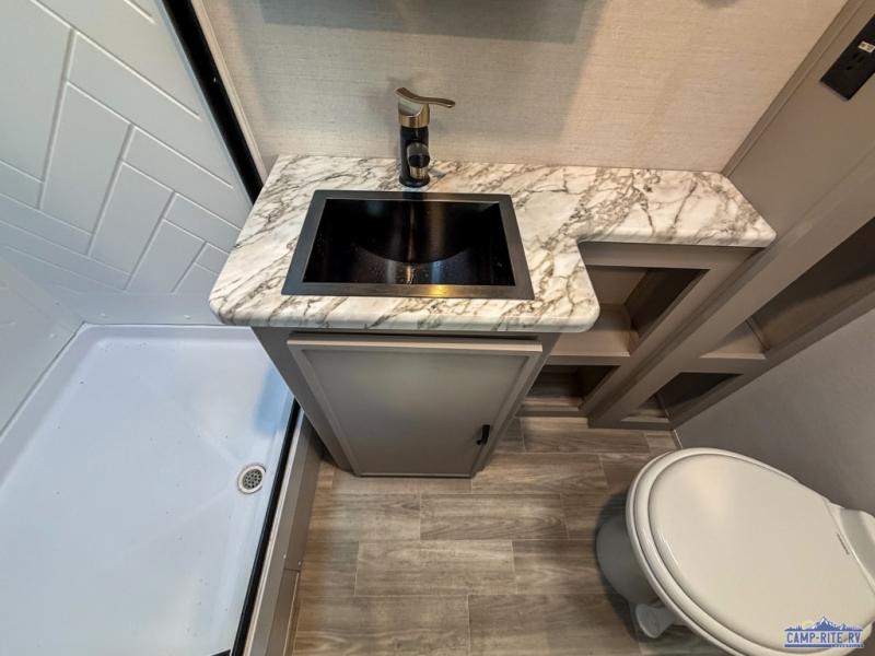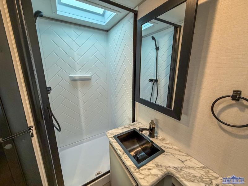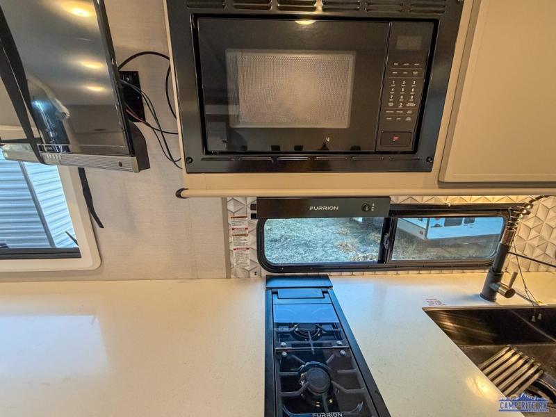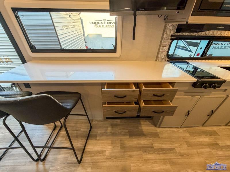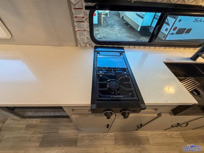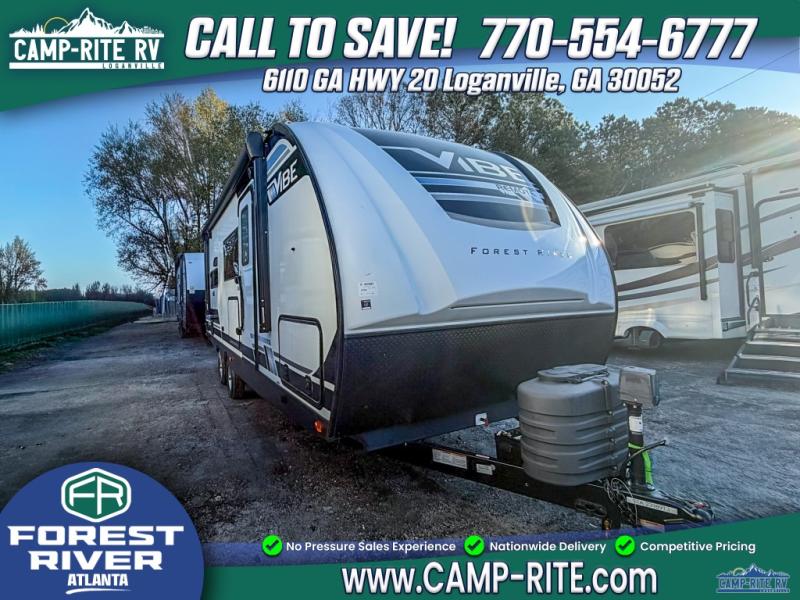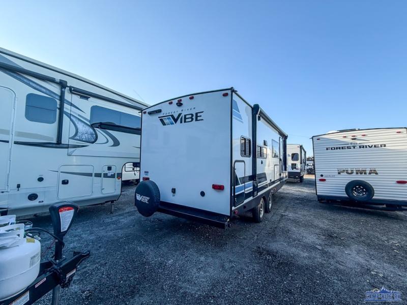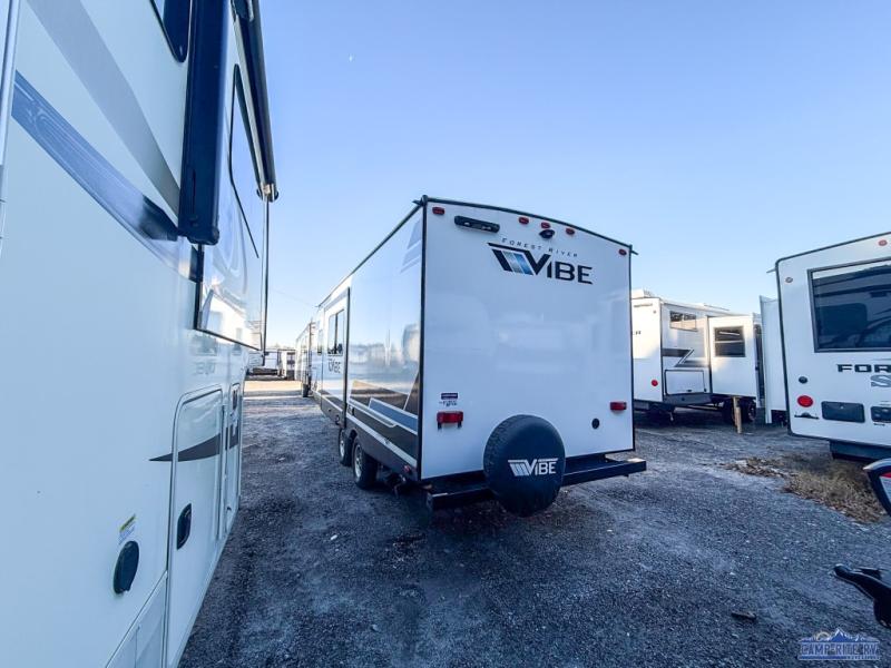 Each Vibe travel trailer by Forest River includes Hyper Lyte construction and a durable laminated "Aluma Frame" for years of use. You will also find an outside shower, a 200-watt roof mounted solar panel, and heated tank pads that will help extend your camping season. The Reserve Package has many at-home features you are sure to enjoy, like the decorative window treatments, solid surface countertops, new black chef's appliance package with an air fryer, and more! These models also include cable and satellite prep and a digital TV antenna with a booster so you can stay connected to the outside world if you choose. Make the easy choice and choose a Vibe travel trailer today!