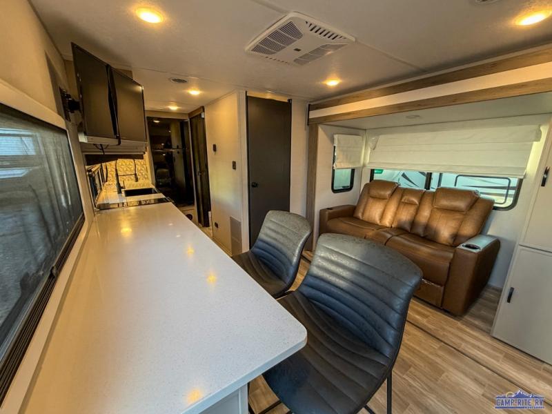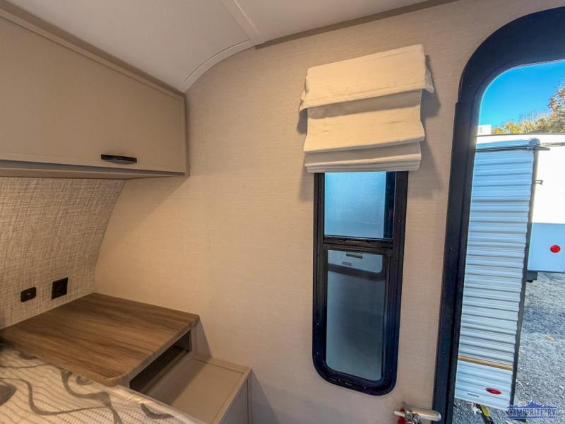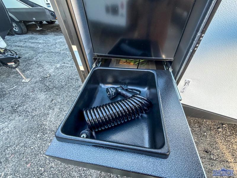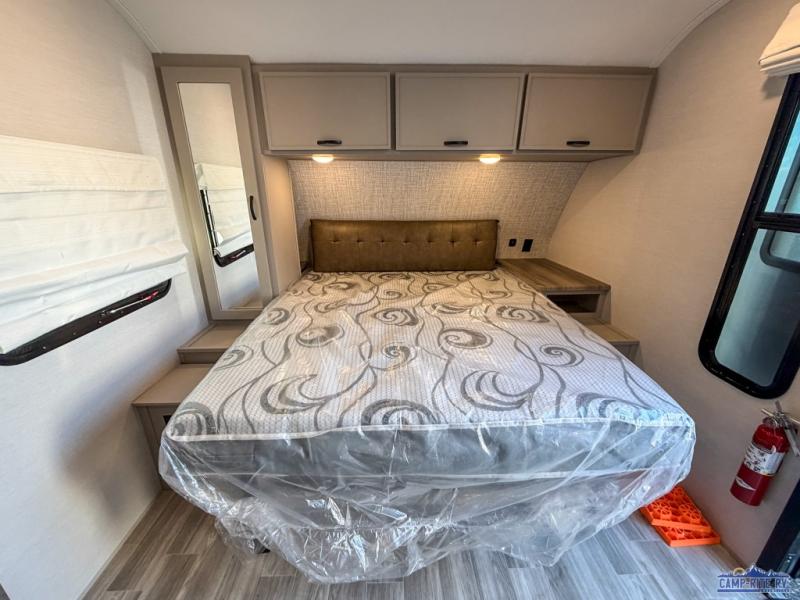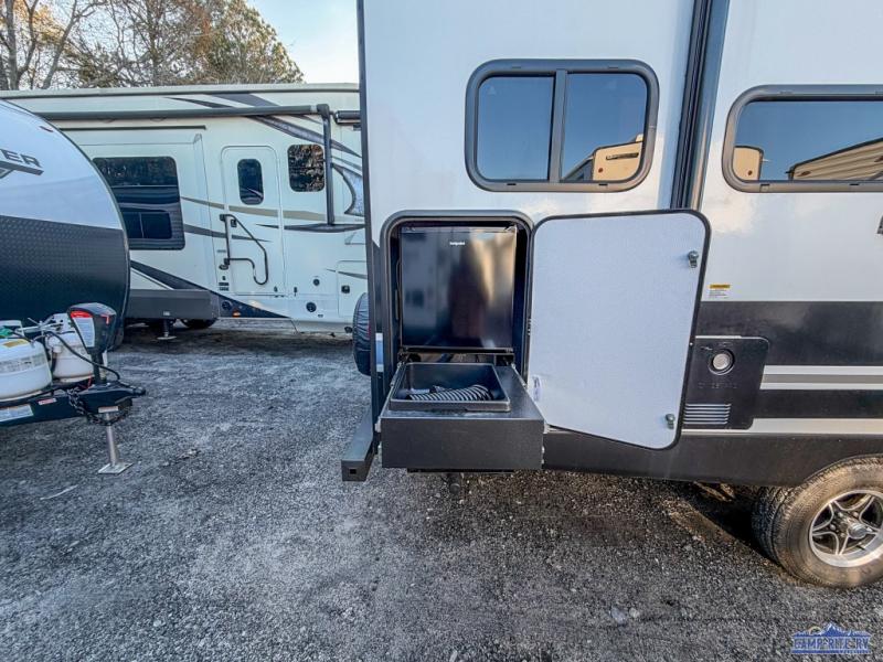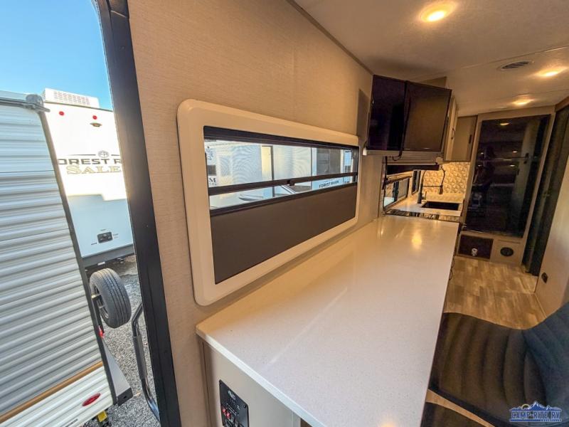Escape to your favorite campground with your favorite person in this travel trailer! Whether you're cooking on the outside kitchen or indoors in the rear corner kitchen, you will have all the appliances needed for yummy meals each day. There is even an air fryer for added convenience. Enjoy your meals at the bar top with two bar stools looking out through the flip-open window. The living area has a theater seating slide to provide comfortable seating space during the day, and a wardrobe next to it to store your items. You will get a good night's rest each night on the front RV queen bed, and the rear corner bathroom has a 36" x 24" shower to freshen up in the mornings. This model also includes tons of storage space for all your belongings with an exterior large pass-through storage area!