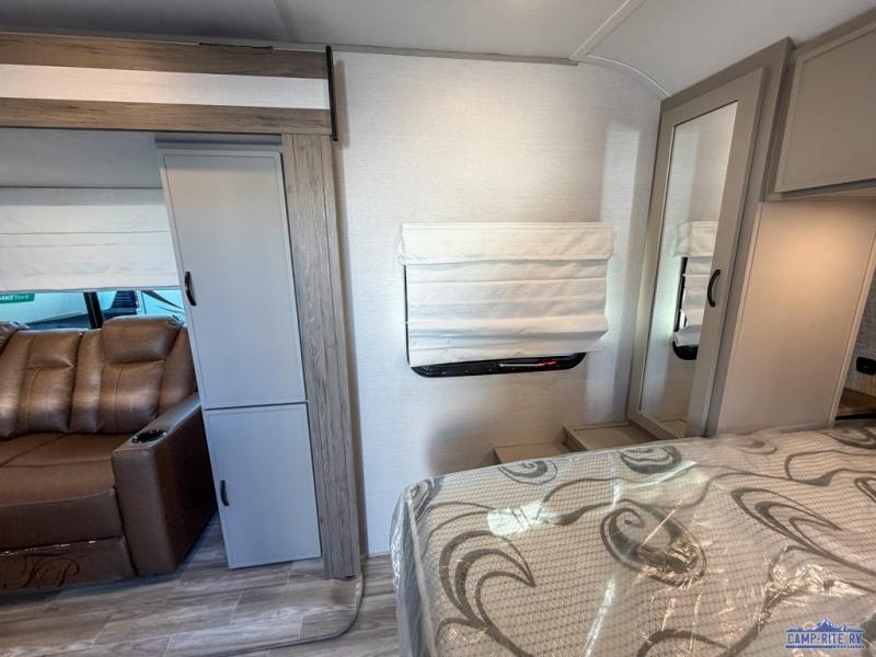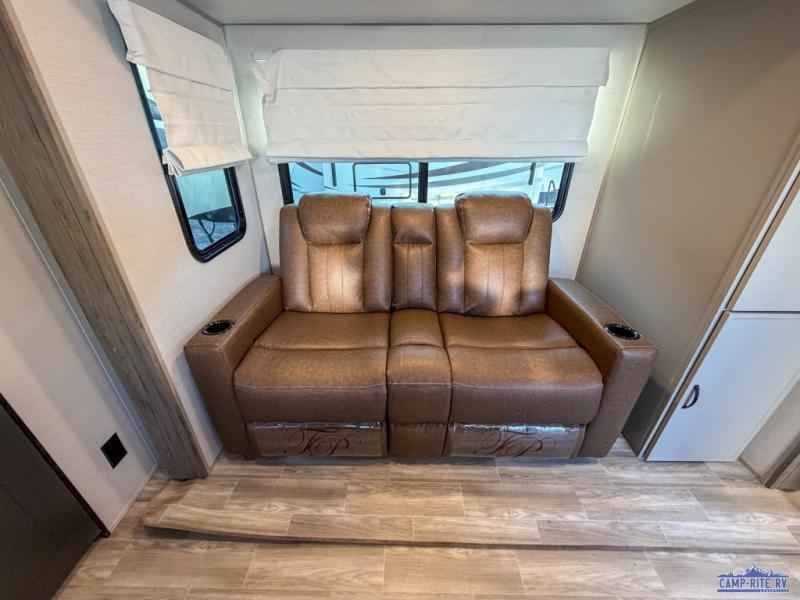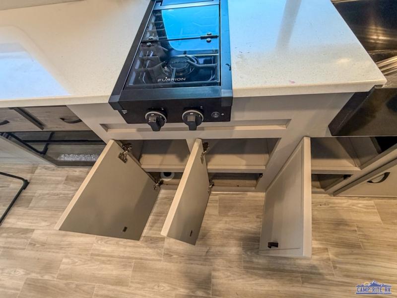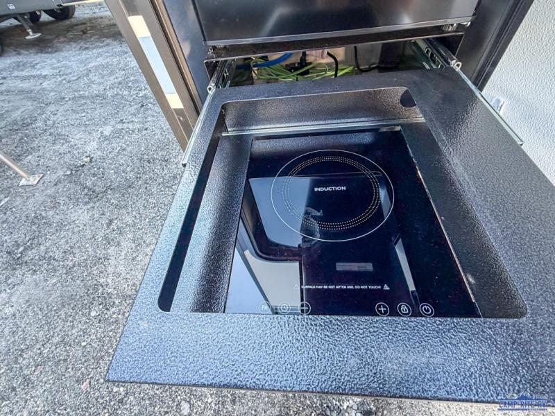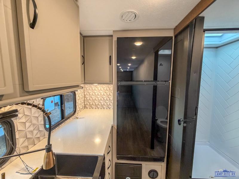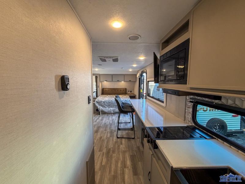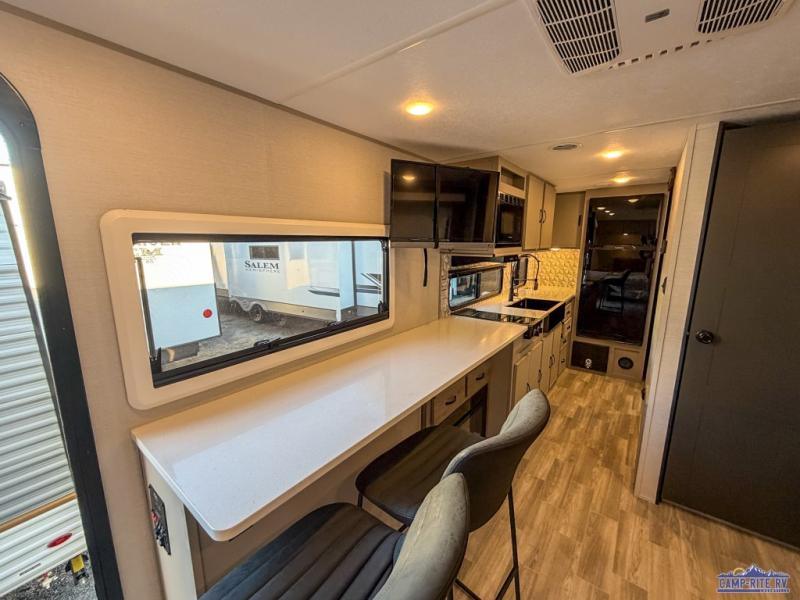 Escape to your favorite campground with your favorite person in this travel trailer! Whether you're cooking on the outside kitchen or indoors in the rear corner kitchen, you will have all the appliances needed for yummy meals each day. There is even an air fryer for added convenience. Enjoy your meals at the bar top with two bar stools looking out through the flip-open window. The living area has a theater seating slide to provide comfortable seating space during the day, and a wardrobe next to it to store your items. You will get a good night's rest each night on the front RV queen bed, and the rear corner bathroom has a 36" x 24" shower to freshen up in the mornings. This model also includes tons of storage space for all your belongings with an exterior large pass-through storage area!