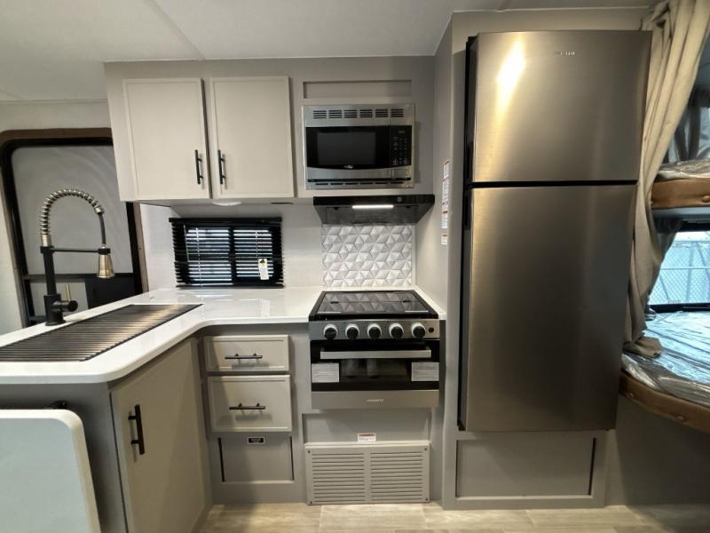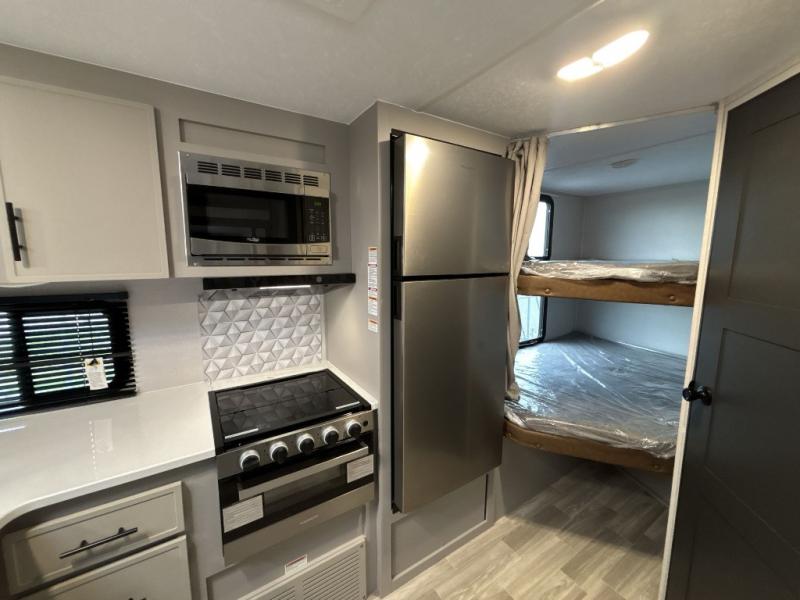 Eat, sleep, relax, and play all in this spacious travel trailer. There are double-size bunks for your guests, and a queen bed in the front private bedroom for you. Everyone can meet in the main living area to enjoy a meal around the U-shaped dinette before heading out for the day. This model includes a three burner cooktop, a black oven, and a microwave oven for quick meals. Choose the exterior kitchen option and you can grill up burgers in no-time! The full bath includes its own exterior entry door for convenience, and you'll find plenty of interior storage for all your belongings, including a large pantry!