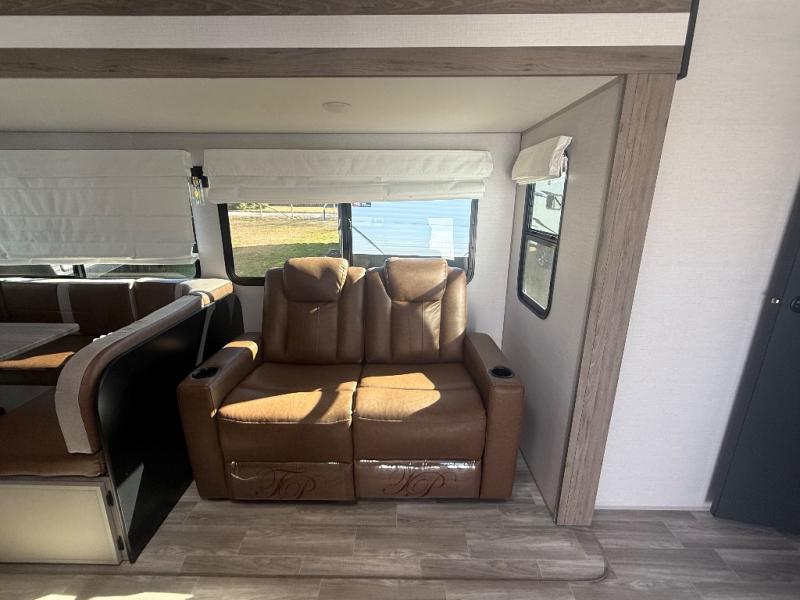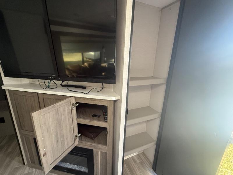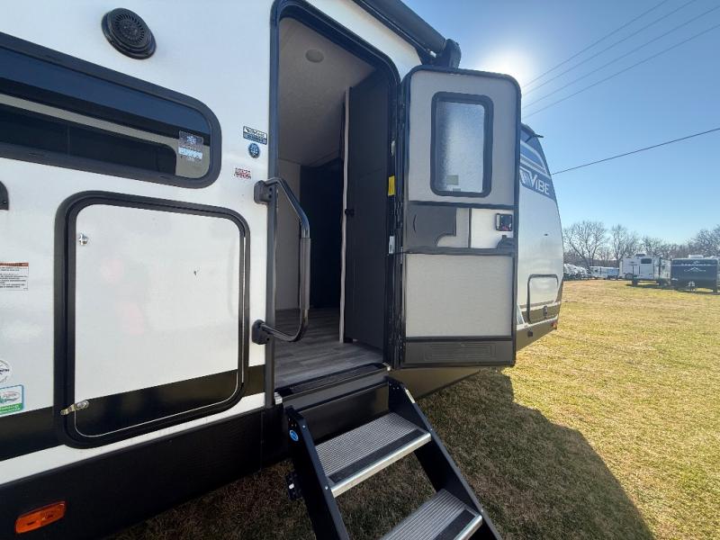 Are you looking to upgrade your RV to a trailer with more space and more features? Look no further than this Vibe that can sleep ten people each night. The kids are sure to claim the double-size bunks to themselves, while the adults take the front private bedroom with the queen bed. You will find even more sleeping space on the U-shaped dinette and sleeper sofa within the large slide out. After a day outdoors at the lake, get cleaned up in the full bath that includes a 40" x 30" walk-in shower and its own exterior entry door for convenience. There is so much more to love about this model, like the fireplace and entertainment center, the oversized panoramic windows, and the large pass-through storage for all your gear!