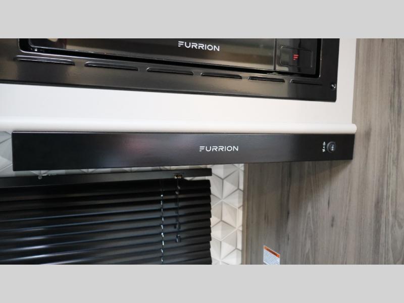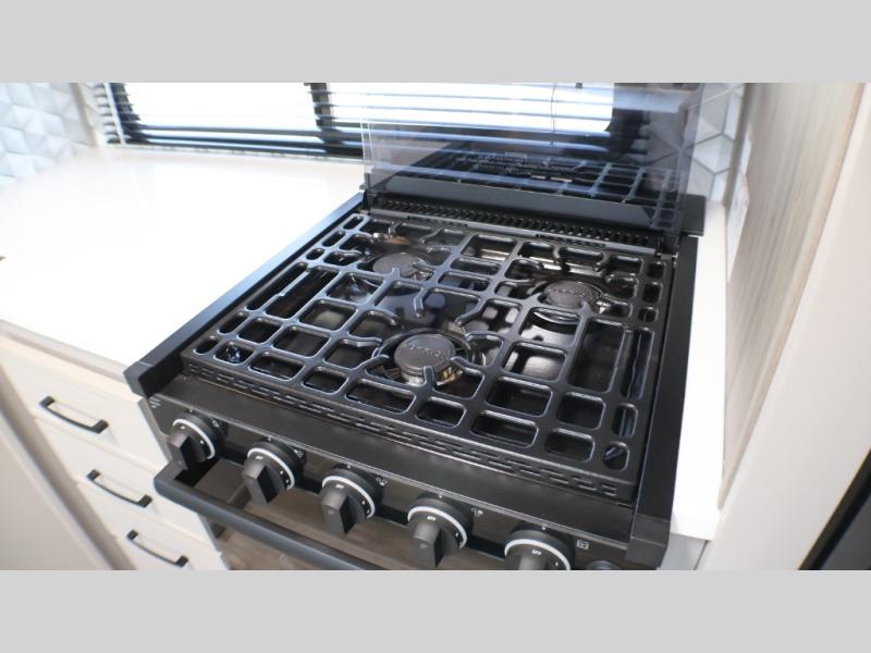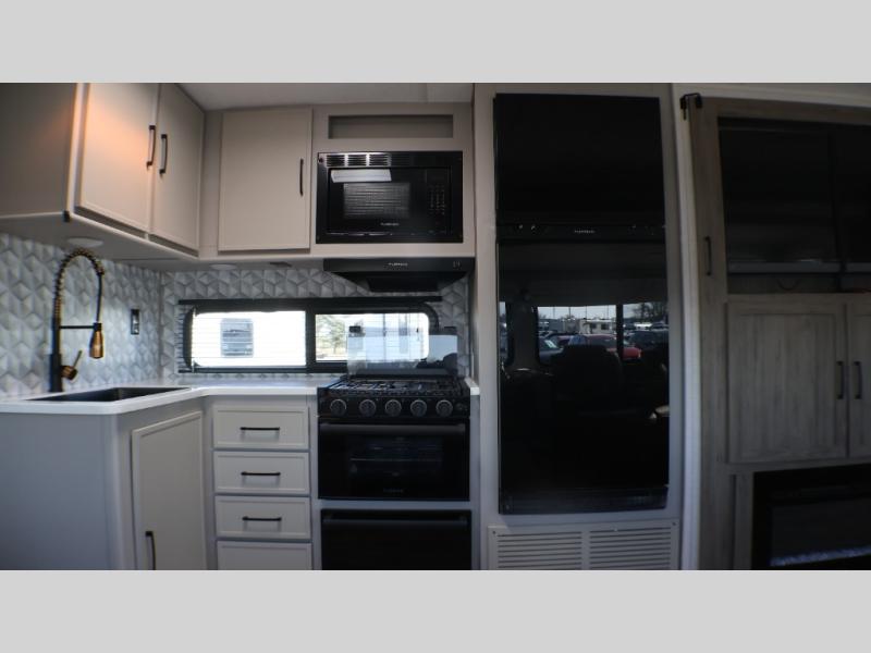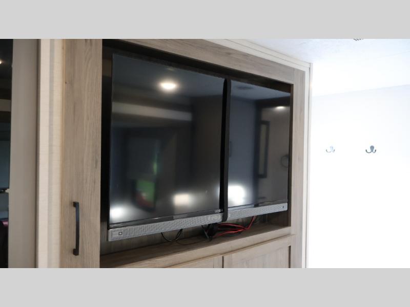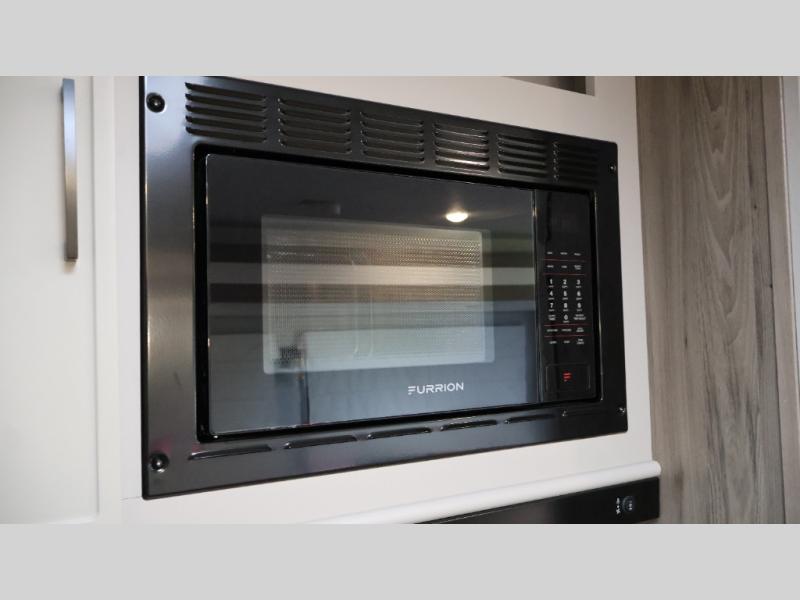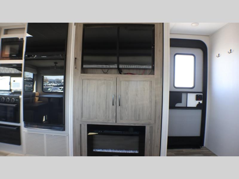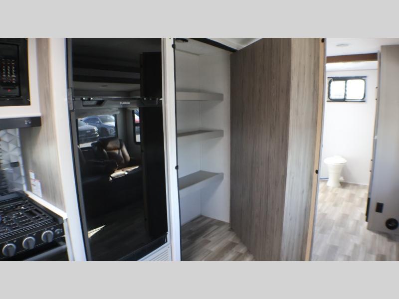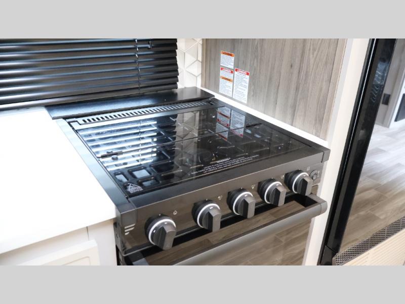 You will love camping every other weekend in this spacious travel trailer for three to four. There is a full rear bath with a spacious shower and two linen closets for towels and toiletries. Your crew can get comfortable on the theater seating across from the entertainment center, and it even swings open to reveal hidden storage with shelves. Easily prepare your meals in the kitchen on the three burner cooktop, or in the oven. There is also an upgraded 10.7 cu. ft. residential refrigerator, plus a microwave and air fryer for meals on the go. When you're ready to call it a night, the front private bedroom is sure to provide comfort with its queen bed, dual wardrobes, and underbed storage. This model also includes an outside kitchen with an induction cooktop, a 20' power awning, plus Sure-Step entry steps for convenience!