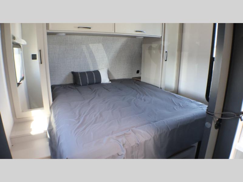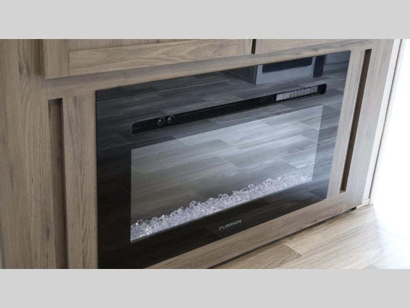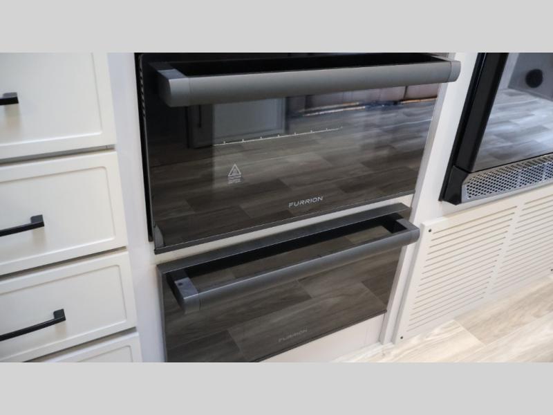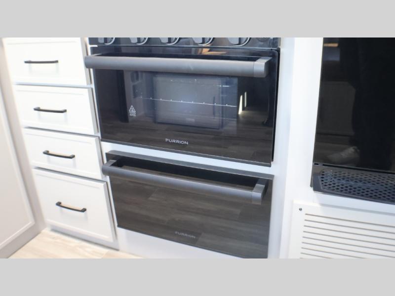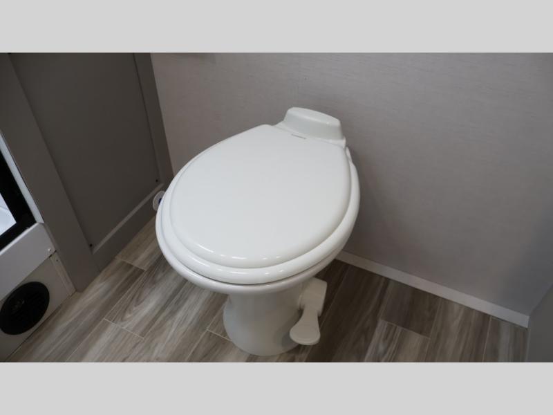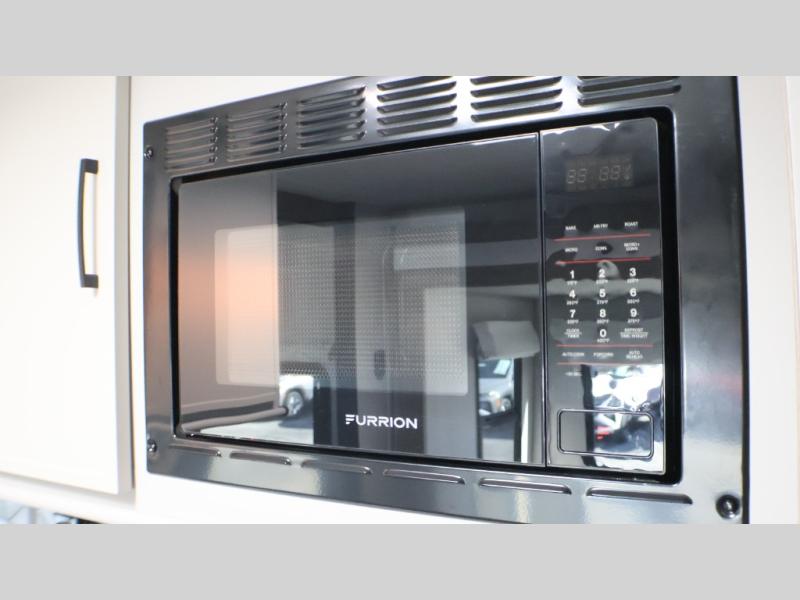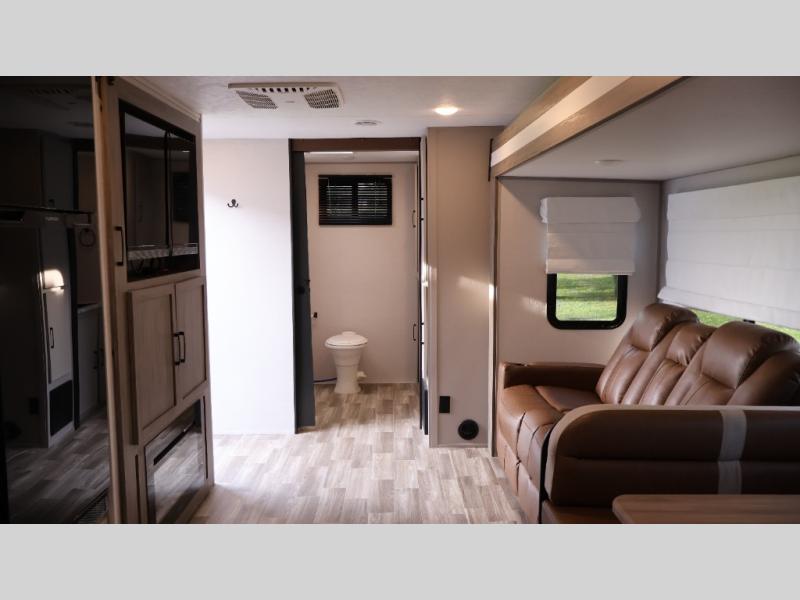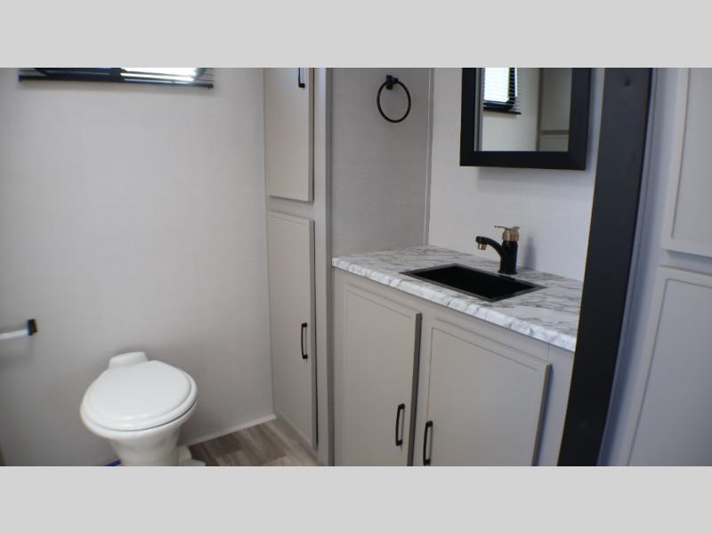 You will love camping every other weekend in this spacious travel trailer for three to four. There is a full rear bath with a spacious shower and two linen closets for towels and toiletries. Your crew can get comfortable on the theater seating across from the entertainment center, and it even swings open to reveal hidden storage with shelves. Easily prepare your meals in the kitchen on the three burner cooktop, or in the oven. There is also an upgraded 10.7 cu. ft. residential refrigerator, plus a microwave and air fryer for meals on the go. When you're ready to call it a night, the front private bedroom is sure to provide comfort with its queen bed, dual wardrobes, and underbed storage. This model also includes an outside kitchen with an induction cooktop, a 20' power awning, plus Sure-Step entry steps for convenience!