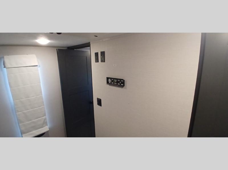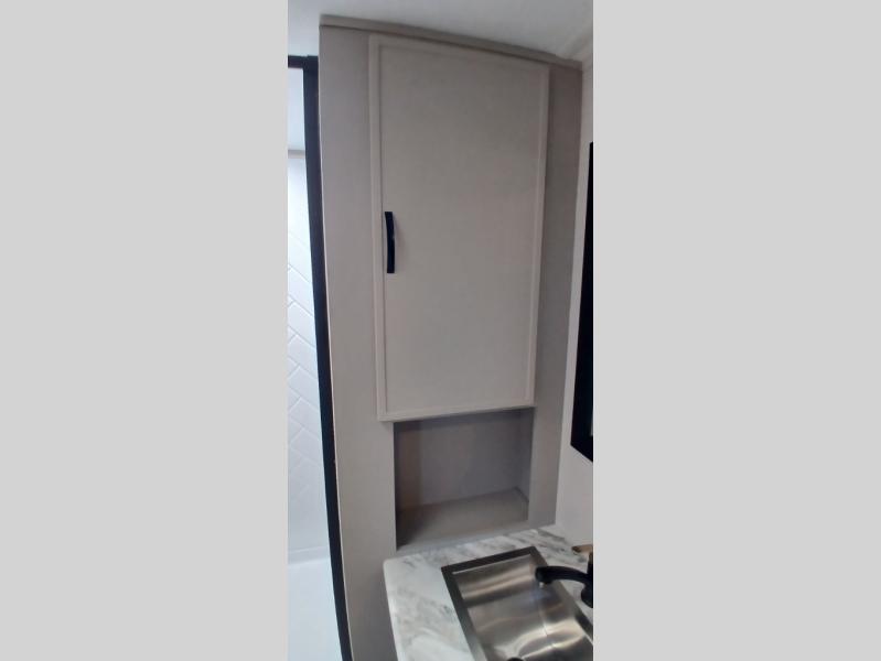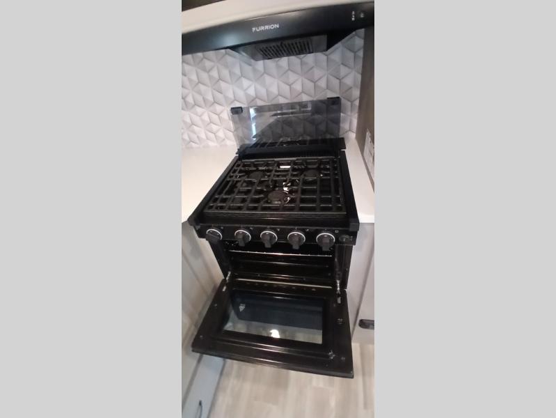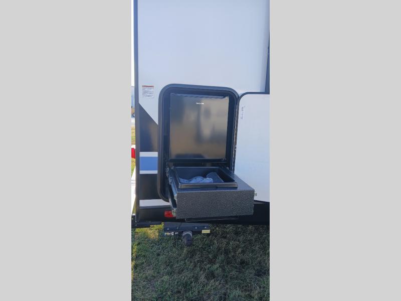 Escape to the great outdoors in this Vibe travel trailer. Once you arrive at your campsite, set up the 20' electric awning with LED lights, then grab the fishing poles from the large pass-through storage. You may want to make a quick lunch on the universal outside kitchen before heading out. If the weather isn't cooperating, you can cook on the three burner cooktop, in the oven or the air fryer and there is even a residential refrigerator to hold all your ingredients. The spacious full bath includes a 36" x 30" walk-in shower to clean up every day, and there is a linen closet to store clean towels and necessities.