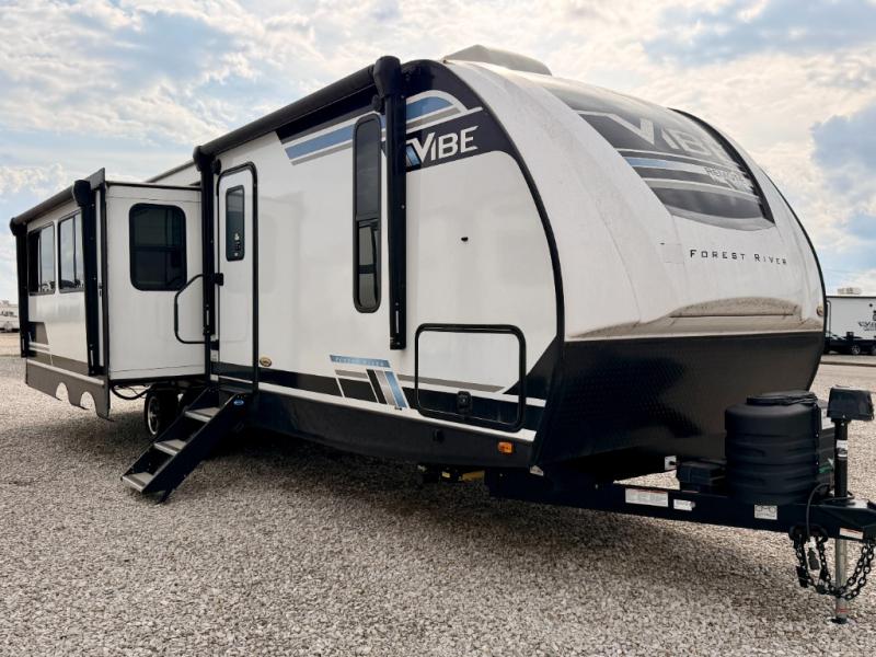 Each Vibe travel trailer by Forest River includes Hyper Lyte construction and a durable laminated "Aluma Frame" for years of use. You will also find an outside shower, a 200-watt roof mounted solar panel, and heated tank pads that will help extend your camping season. The Reserve Package has many at-home features you are sure to enjoy, like the decorative window treatments, solid surface countertops, new black chef's appliance package with an air fryer, and more! These models also include cable and satellite prep and a digital TV antenna with a booster so you can stay connected to the outside world if you choose. Make the easy choice and choose a Vibe travel trailer today!