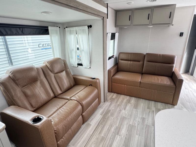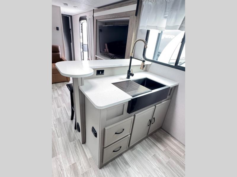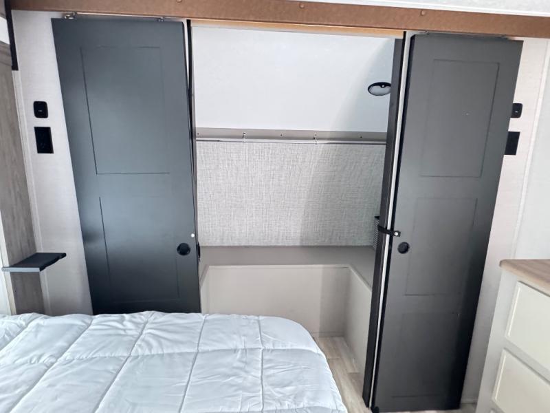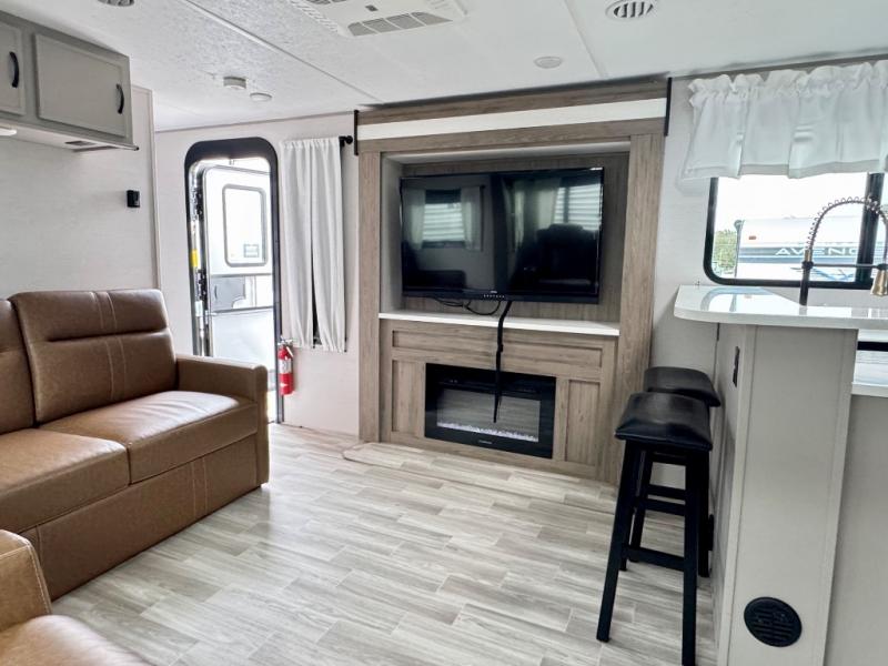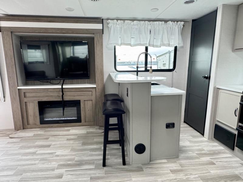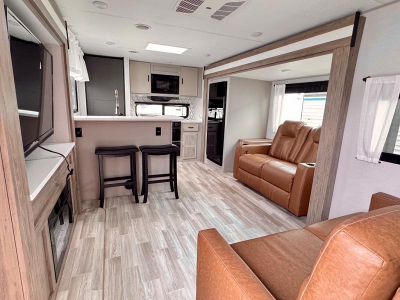 There is no going back to your tent-camping days after touring this travel trailer. The rear kitchen is any chef's dream with its walk-in pantry, residential refrigerator, plus a bar with stools where the kids can enjoy coloring. You will find comfortable seating space on the theater seating and tri-fold sofa, and the fireplace and 50" TV with storage will feel just like home. The full bath will allow everyone space to clean up each day, and the front private bedroom will be your own oasis away from it all. Here, you will enjoy a slide out queen bed, a dresser where you can add a TV if you choose, plus a front walk-in closet so you can bring along all your favorite outfits!