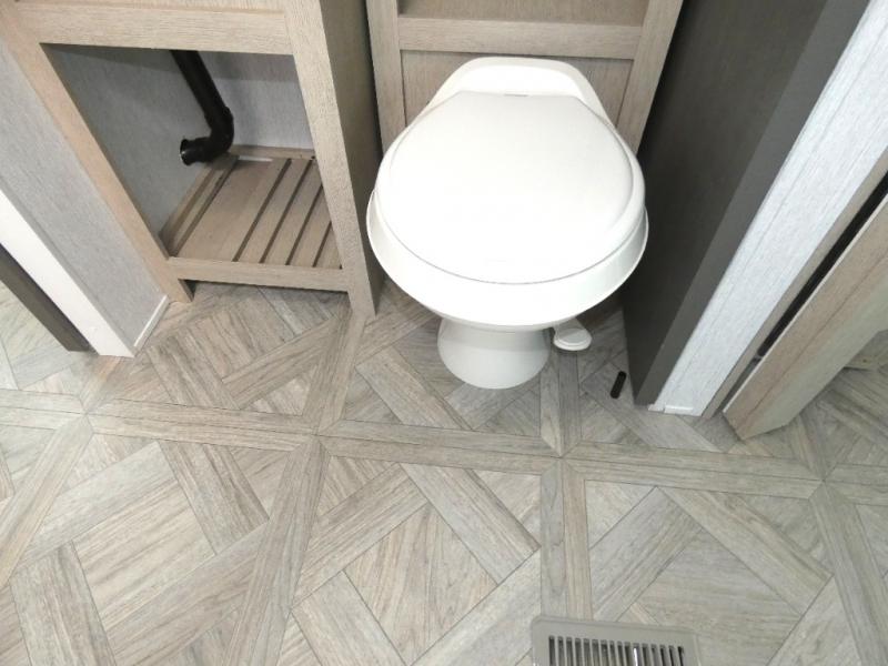 You're going to love cooking in the rear kitchen of this travel trailer! It has everything you need to prepare delicious home cooked meals including a large pantry and oversized fridge, plus there are two bar stools to sit on while you enjoy them. The theater seating is conveniently across from the swiveling entertainment center which has hidden shelves behind it for your games and movies. As you walk through the bathroom, you will notice a walk-in shower to the left and a toilet and sink to the right. It leads directly into the front private bedroom which has a Versa-Tilt custom king bed to lay your head on at night and wardrobes/nightstands on either side for your items!