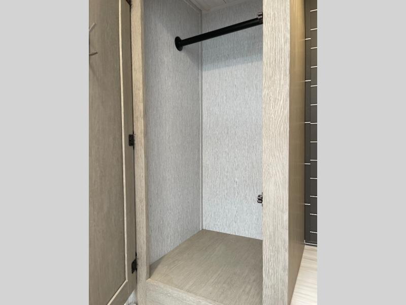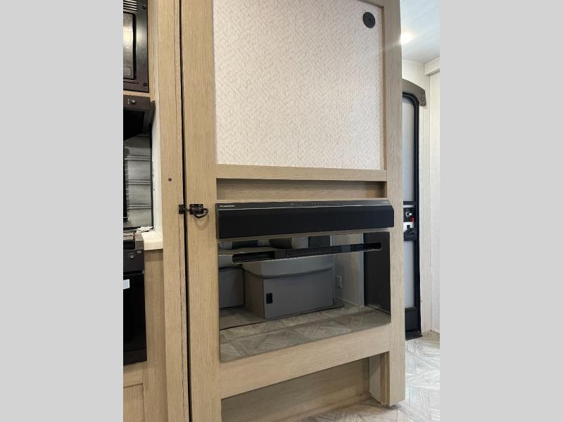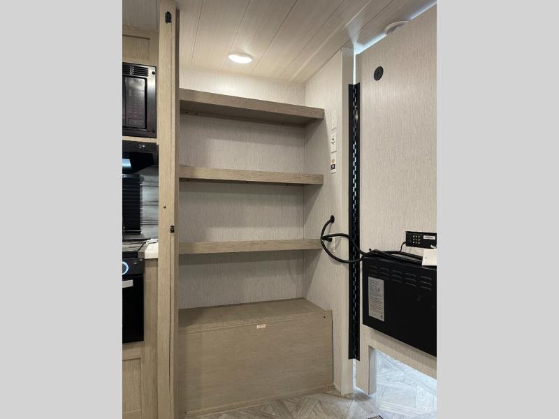 As you escape to the beautiful countryside, or embark across the country to visit family, you'll find that the modern amenities found in this Wildwood travel trailer will deliver the ultimate enjoyment all along the way! Relax on an 8' chaise lounge that includes a table in front so that you can enjoy your morning coffee. When you are ready to face the day ahead, you can grab a towel from the linen closet in the rear bathroom and enjoy the walk-in shower before heading out for a day full of adventure. At night, a custom king bed with Versa-Tilt for a great night's rest. You will appreciate the pass-through storage, entertainment center with fireplace, and walk-in pantry for all the goodies!