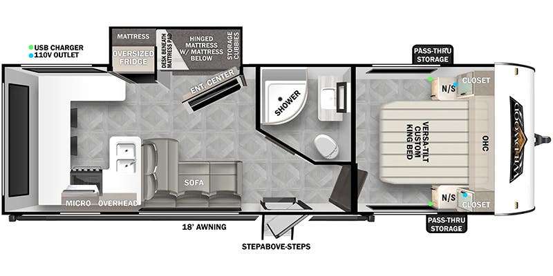 Awnings: One 18' power awning with adjustable legs & LED lights