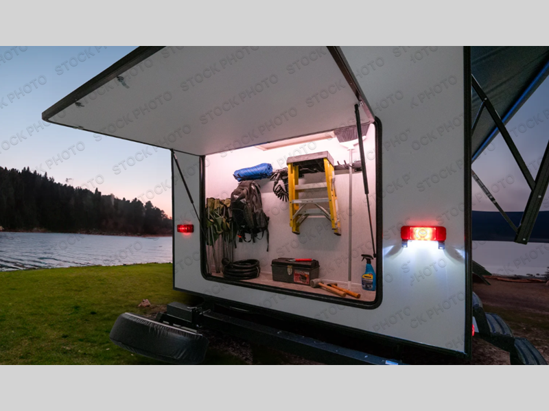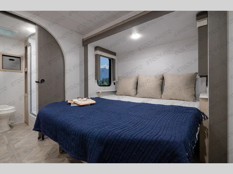 Grab your honey or your best camping friend for fun weekends in this travel trailer. There are two slide outs providing you with more space to relax, plus a front kitchen with ample counter space. The bar top with stools will provide a place to dine each morning, and the theater seat will be perfect for relaxing in the evenings. The middle master bedroom includes a custom king bed with Versa Tilt, a desk with TV prep above where you can work away from home if needed, and even a closet with washer and dryer prep if you plan to go RVing full-time! This model also includes a spacious full rear bath with its own exterior entry door, a walk-in shower, a linen closet for clean towels, and recessed storage for necessities. Don't overlook the exterior with its camp kitchen, 20' awning, and Versa garage for luggage, fishing poles, and more!