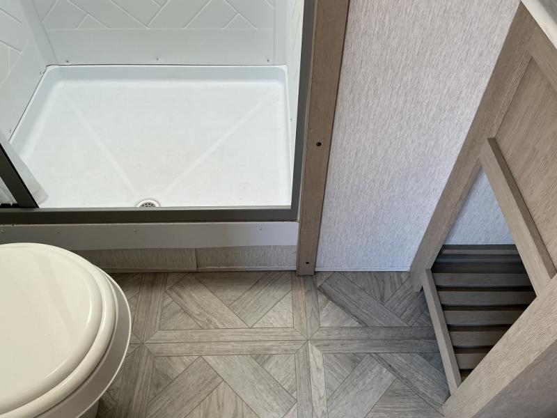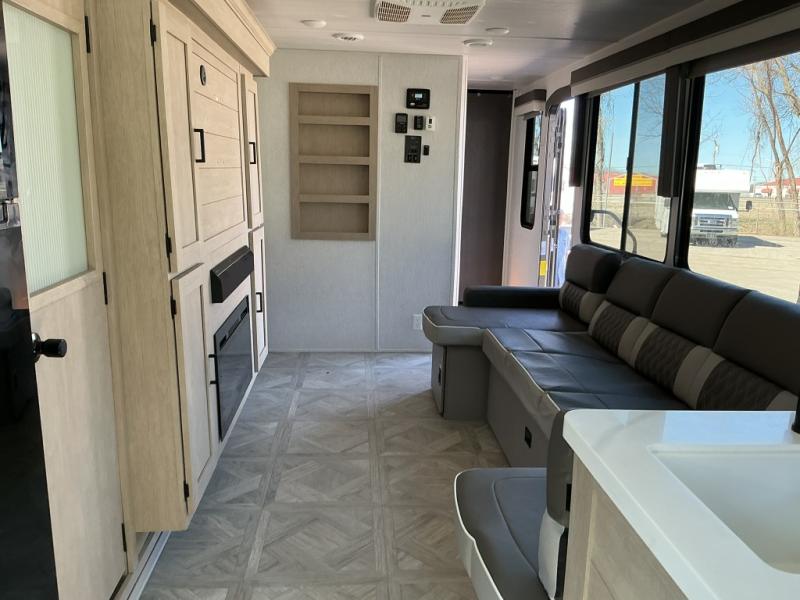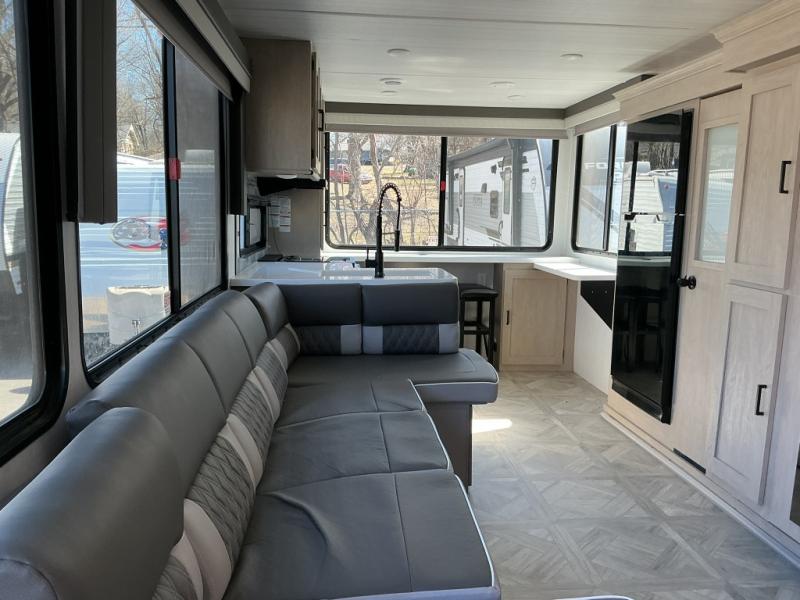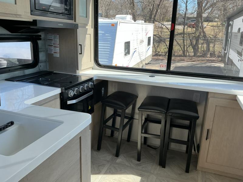 The perfect couple's coach with a view! This Wildwood View features a 7' kitchen island and five bar stools for dining and prep space. The island also houses a double kitchen sink for easy clean-up. Thanks to the island, you will enjoy 15 linear feet of countertop space throughout. The view will be of your choosing thanks to 95.5 square feet of windows that will easily bring the outdoors inside. A sectional sofa across the back of the unit provides ample seating to relax and enjoy a good book or the entertainment center. Behind the entertainment center, you will find hidden storage space with shelves so everything can be tucked out of sight, and an oversized refrigerator will provide enough space for your perishables while you are on vacation as well. A full bath is conveniently located near the main entry featuring StepAbove entry steps leading inside. The bath provides a walk-in shower, vanity with sink, toilet, and linen storage. In the private front bedroom, a Versa-Tilt custom king bed will allow you a relaxing and comfortable night's rest, and once again, a great view out the dual opposing windows. On the outside, a 23' awning offers additional living space protected from the elements, and a spacious pass-through storage compartment will allow you to stow away your camp chairs and outdoor equipment and games easily for transport.