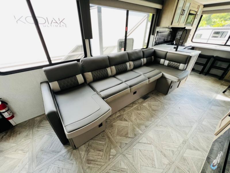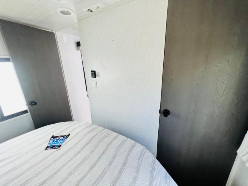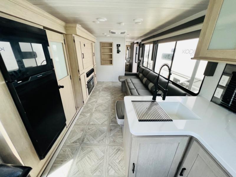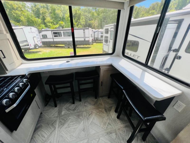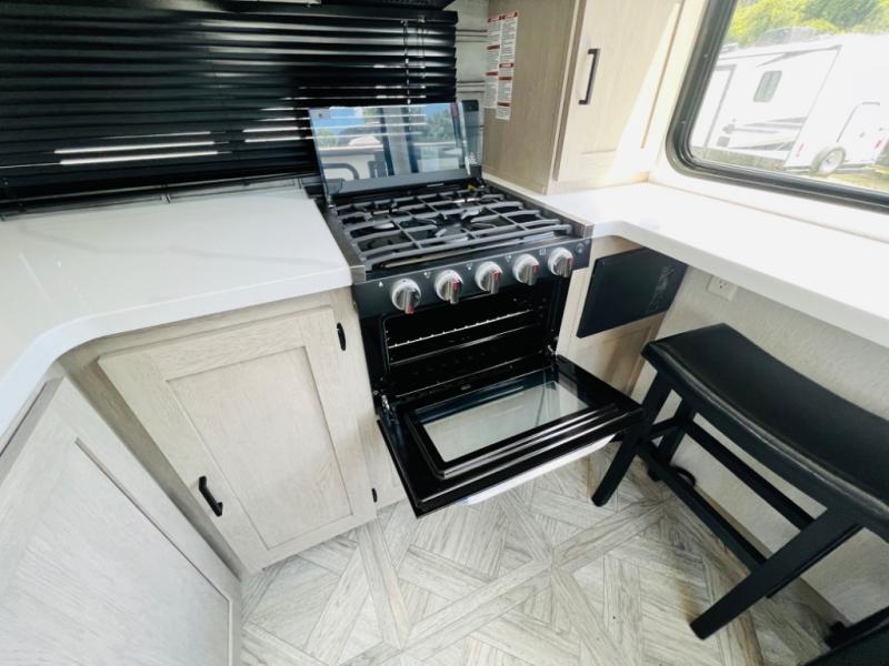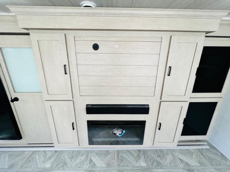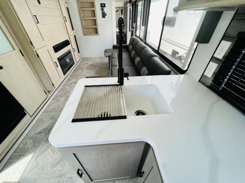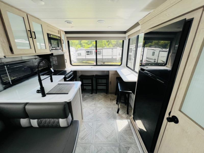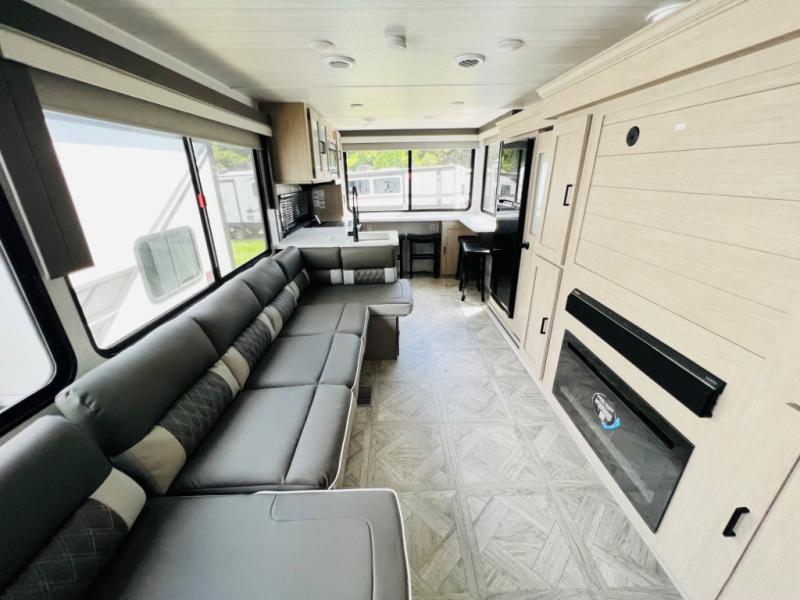 Your family of four or will enjoy this Wildwood View bunk model featuring 105 square feet of window space for unbelievable views of your surroundings. The Versa Slide features a refrigerator, pantry, and entertainment center with a door leading to a bunk space including a 30" x 70" flip-up bunk with a mattress pad below, storage cubbies for your things, and a desk with bar stool for any office work that you may need to do while you travel. All is neatly tucked away within the slide behind an entertainment wall with fireplace opposite the sectional sofa which is great for relaxing and entertaining family and friends indoors. The rear kitchen area offers 18 linear feet of countertop space with four bar stools, plus a three burner range and double sink. Your refrigerator and pantry will hold all of your perishables and dry goods, and those are nearby within the Versa slide. Up front, a private bedroom with Versa-Tilt custom king bed which provides 14-1/2" of additional walking around space, plus you will find a wardrobe that has been prepped for a washer and dryer if you choose to add, as well as dual nightstands beneath wardrobes on either side of the bed. A large pass-through storage compartment offers plenty of storage for your outdoor gear, and if you enjoy outdoor cooking, you might want to add the outside kitchen option as well.