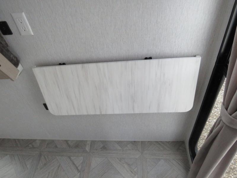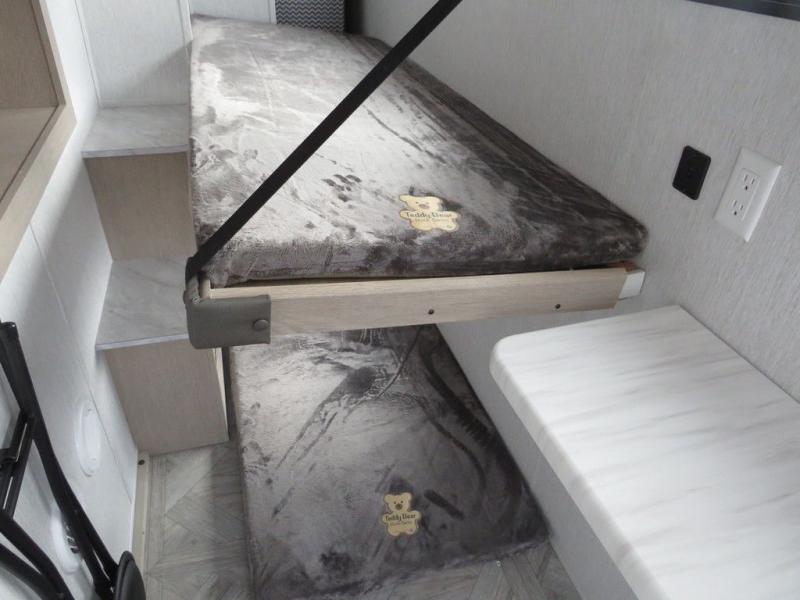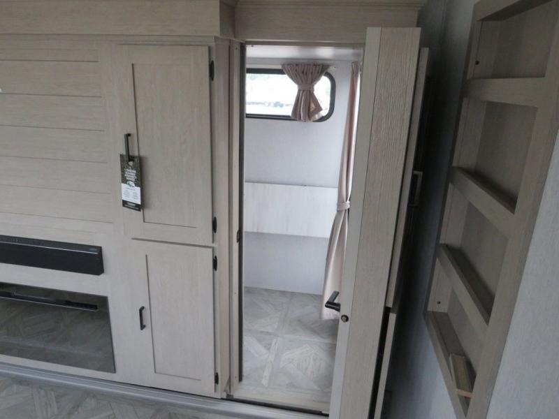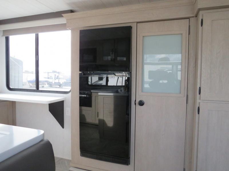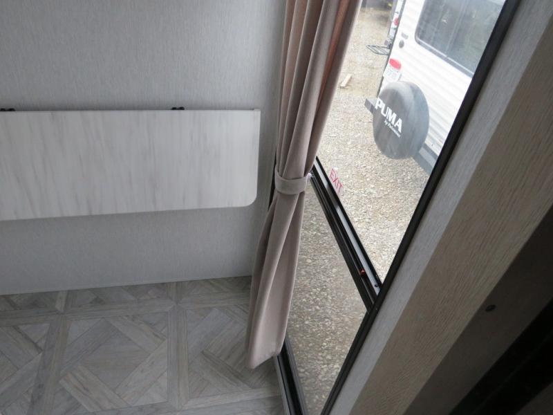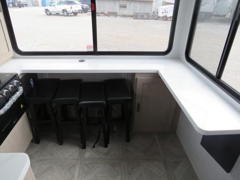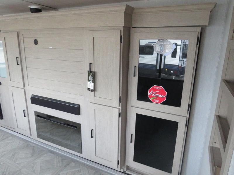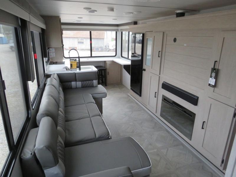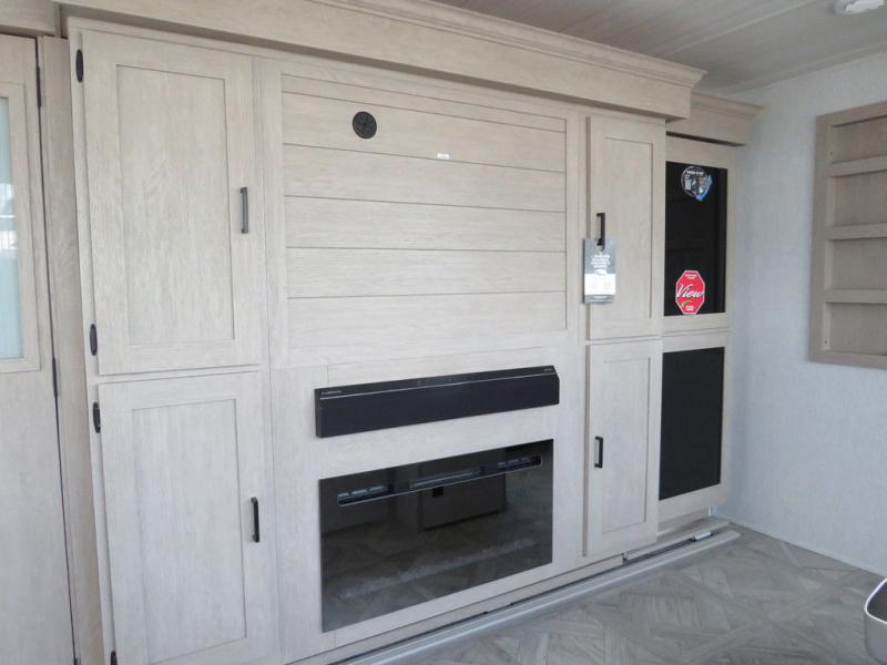 Your family of four or will enjoy this Wildwood View bunk model featuring 105 square feet of window space for unbelievable views of your surroundings. The Versa Slide features a refrigerator, pantry, and entertainment center with a door leading to a bunk space including a 30" x 70" flip-up bunk with a mattress pad below, storage cubbies for your things, and a desk with bar stool for any office work that you may need to do while you travel. All is neatly tucked away within the slide behind an entertainment wall with fireplace opposite the sectional sofa which is great for relaxing and entertaining family and friends indoors. The rear kitchen area offers 18 linear feet of countertop space with four bar stools, plus a three burner range and double sink. Your refrigerator and pantry will hold all of your perishables and dry goods, and those are nearby within the Versa slide. Up front, a private bedroom with Versa-Tilt custom king bed which provides 14-1/2" of additional walking around space, plus you will find a wardrobe that has been prepped for a washer and dryer if you choose to add, as well as dual nightstands beneath wardrobes on either side of the bed. A large pass-through storage compartment offers plenty of storage for your outdoor gear, and if you enjoy outdoor cooking, you might want to add the outside kitchen option as well.
