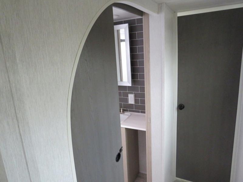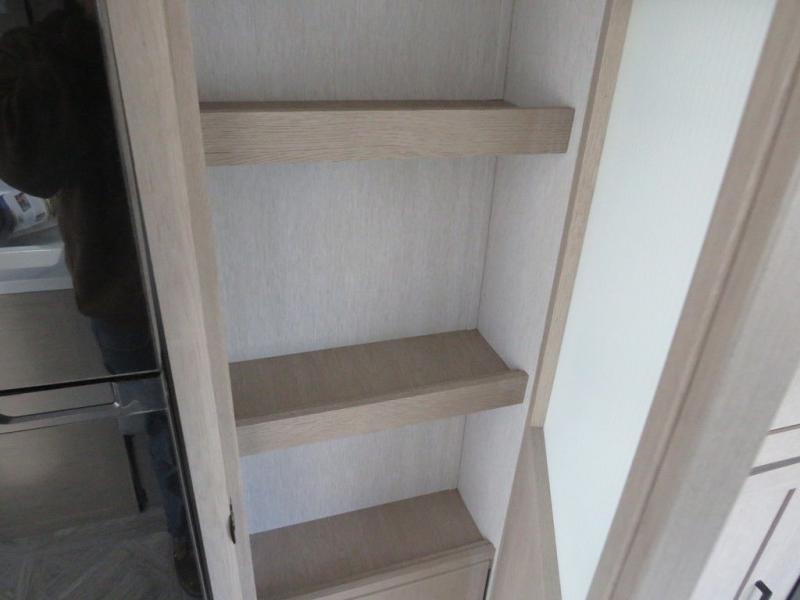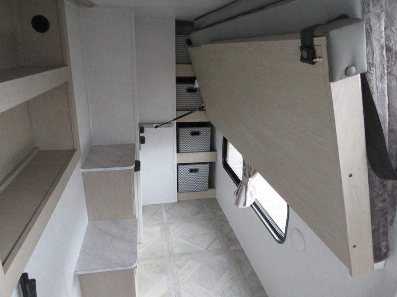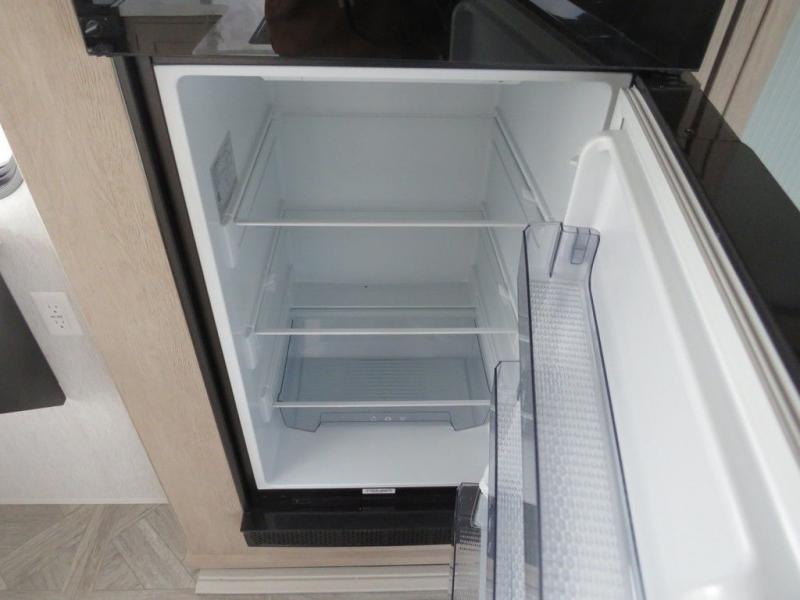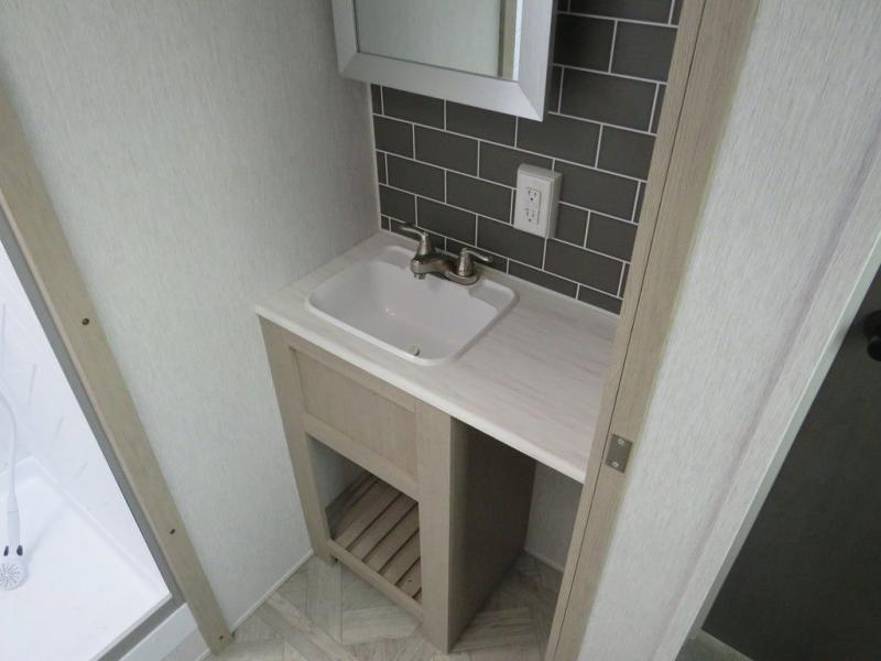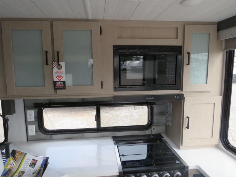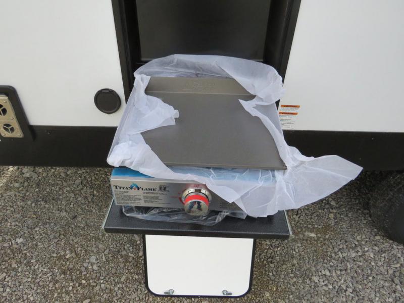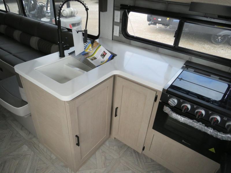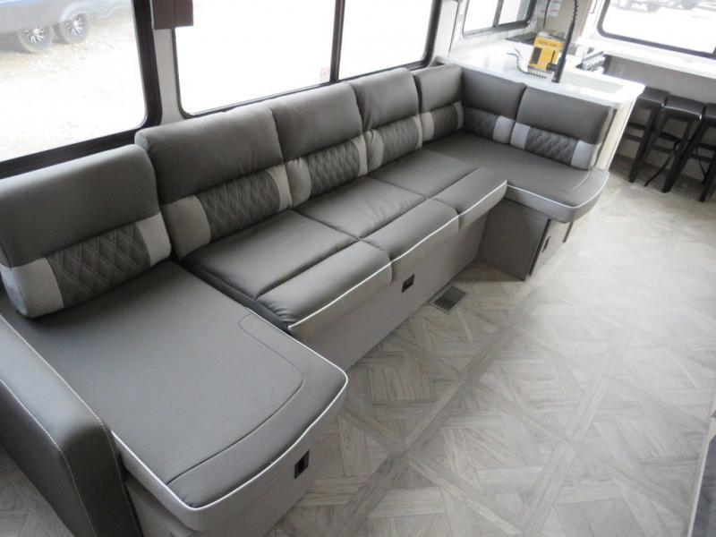 Your family of four or will enjoy this Wildwood View bunk model featuring 105 square feet of window space for unbelievable views of your surroundings. The Versa Slide features a refrigerator, pantry, and entertainment center with a door leading to a bunk space including a 30" x 70" flip-up bunk with a mattress pad below, storage cubbies for your things, and a desk with bar stool for any office work that you may need to do while you travel. All is neatly tucked away within the slide behind an entertainment wall with fireplace opposite the sectional sofa which is great for relaxing and entertaining family and friends indoors. The rear kitchen area offers 18 linear feet of countertop space with four bar stools, plus a three burner range and double sink. Your refrigerator and pantry will hold all of your perishables and dry goods, and those are nearby within the Versa slide. Up front, a private bedroom with Versa-Tilt custom king bed which provides 14-1/2" of additional walking around space, plus you will find a wardrobe that has been prepped for a washer and dryer if you choose to add, as well as dual nightstands beneath wardrobes on either side of the bed. A large pass-through storage compartment offers plenty of storage for your outdoor gear, and if you enjoy outdoor cooking, you might want to add the outside kitchen option as well.