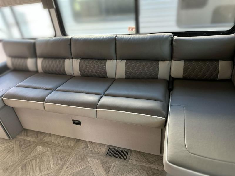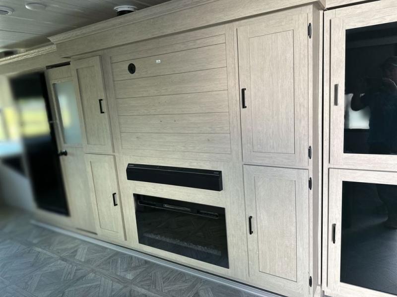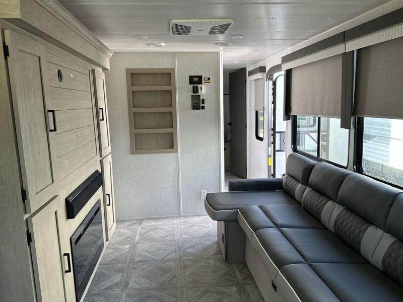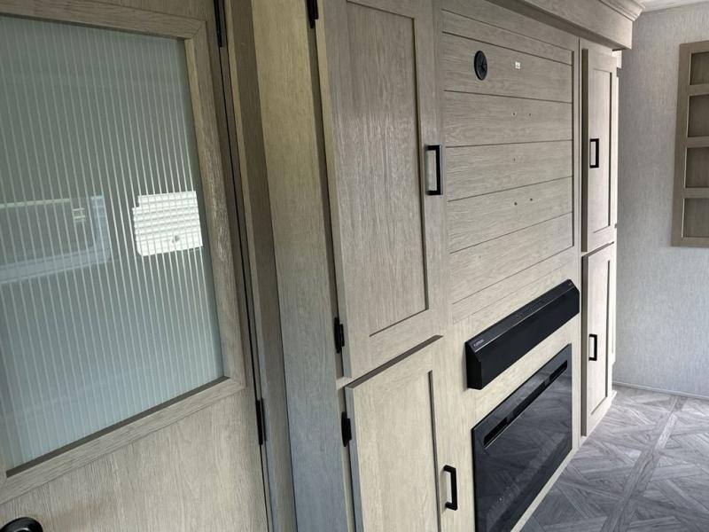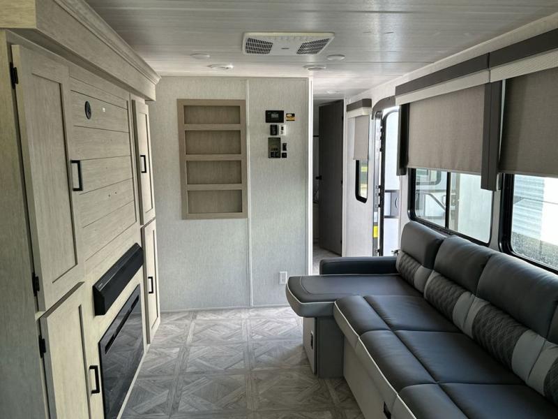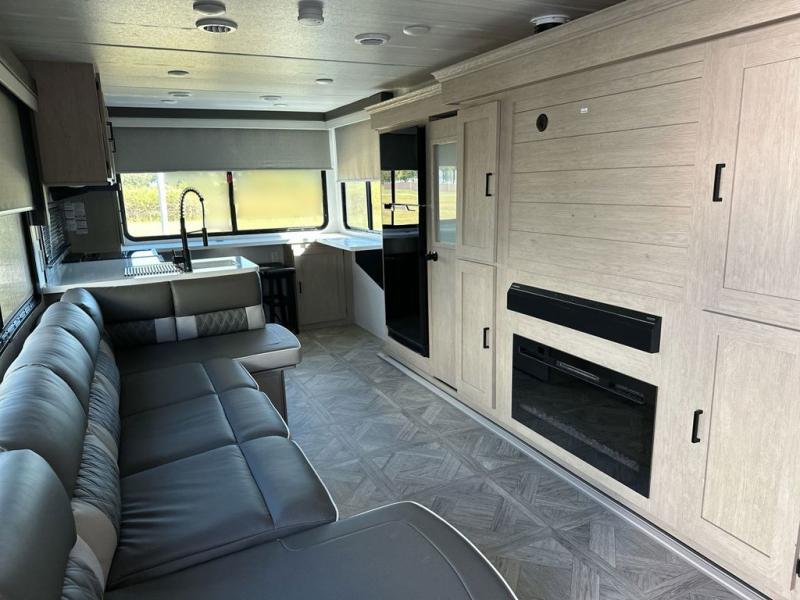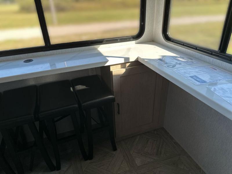 Your family of four or will enjoy this Wildwood View bunk model featuring 105 square feet of window space for unbelievable views of your surroundings. The Versa Slide features a refrigerator, pantry, and entertainment center with a door leading to a bunk space including a 30" x 70" flip-up bunk with a mattress pad below, storage cubbies for your things, and a desk with bar stool for any office work that you may need to do while you travel. All is neatly tucked away within the slide behind an entertainment wall with fireplace opposite the sectional sofa which is great for relaxing and entertaining family and friends indoors. The rear kitchen area offers 18 linear feet of countertop space with four bar stools, plus a three burner range and double sink. Your refrigerator and pantry will hold all of your perishables and dry goods, and those are nearby within the Versa slide. Up front, a private bedroom with Versa-Tilt custom king bed which provides 14-1/2" of additional walking around space, plus you will find a wardrobe that has been prepped for a washer and dryer if you choose to add, as well as dual nightstands beneath wardrobes on either side of the bed. A large pass-through storage compartment offers plenty of storage for your outdoor gear, and if you enjoy outdoor cooking, you might want to add the outside kitchen option as well.