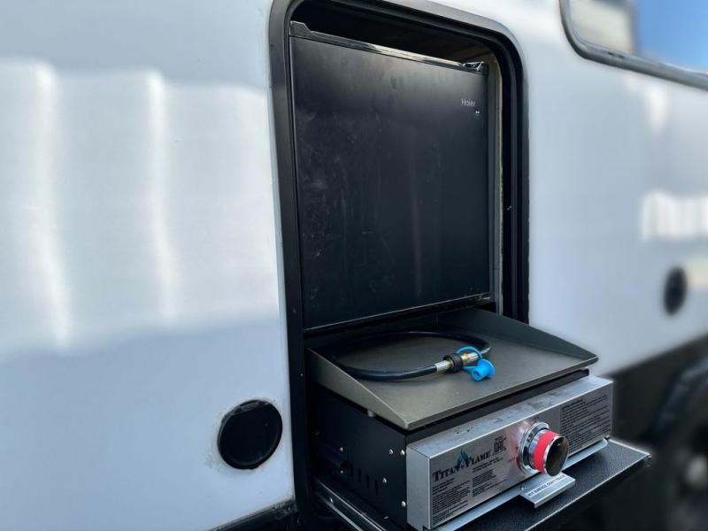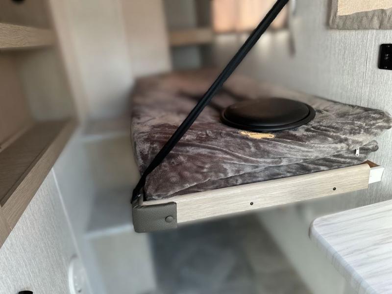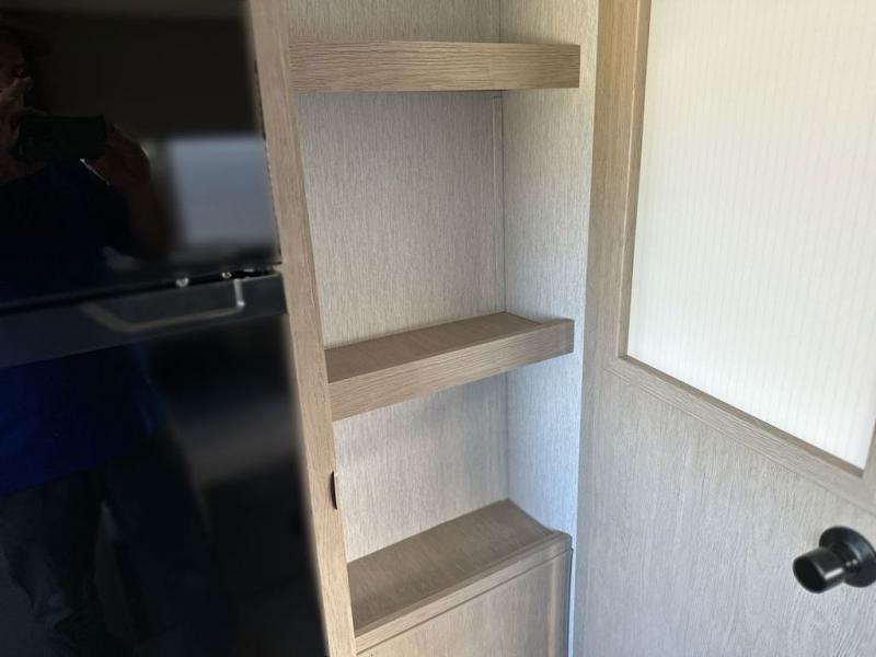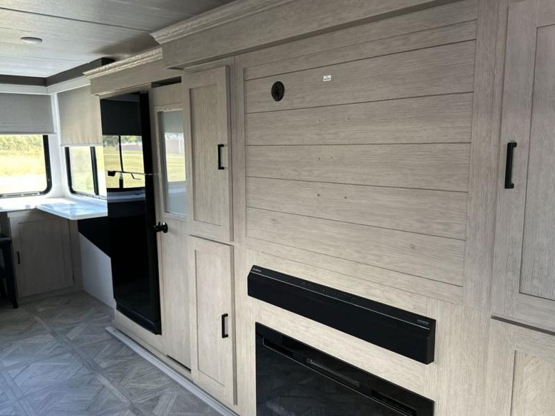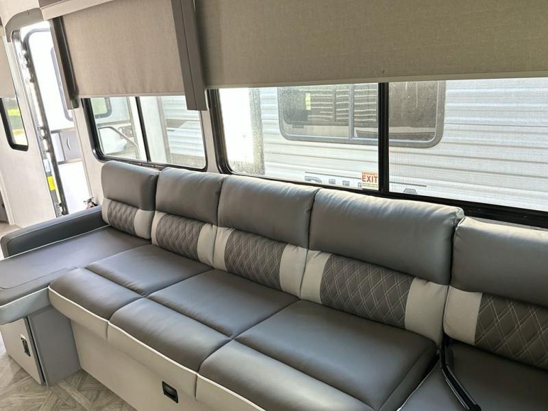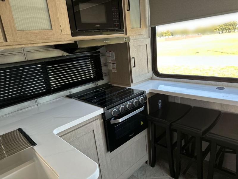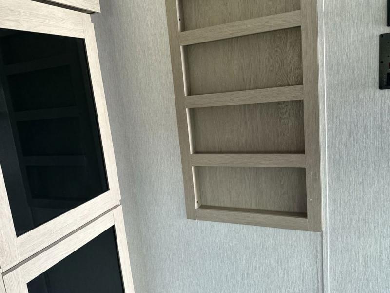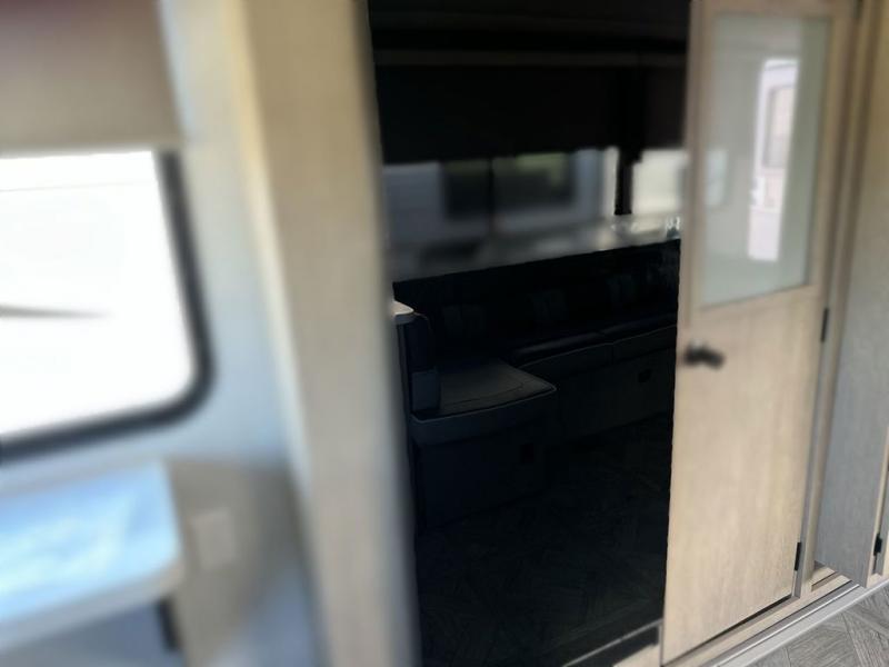 Your family of four or will enjoy this Wildwood View bunk model featuring 105 square feet of window space for unbelievable views of your surroundings. The Versa Slide features a refrigerator, pantry, and entertainment center with a door leading to a bunk space including a 30" x 70" flip-up bunk with a mattress pad below, storage cubbies for your things, and a desk with bar stool for any office work that you may need to do while you travel. All is neatly tucked away within the slide behind an entertainment wall with fireplace opposite the sectional sofa which is great for relaxing and entertaining family and friends indoors. The rear kitchen area offers 18 linear feet of countertop space with four bar stools, plus a three burner range and double sink. Your refrigerator and pantry will hold all of your perishables and dry goods, and those are nearby within the Versa slide. Up front, a private bedroom with Versa-Tilt custom king bed which provides 14-1/2" of additional walking around space, plus you will find a wardrobe that has been prepped for a washer and dryer if you choose to add, as well as dual nightstands beneath wardrobes on either side of the bed. A large pass-through storage compartment offers plenty of storage for your outdoor gear, and if you enjoy outdoor cooking, you might want to add the outside kitchen option as well.