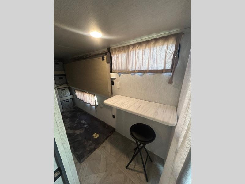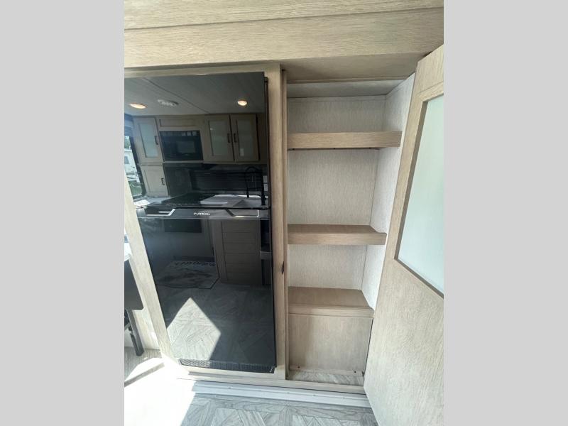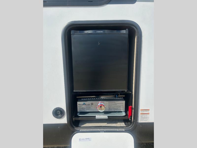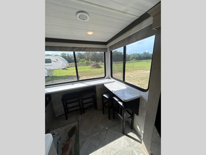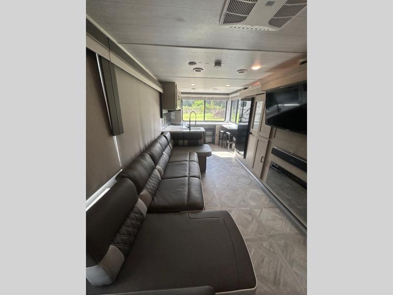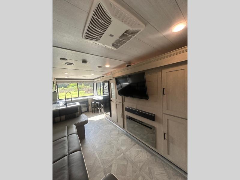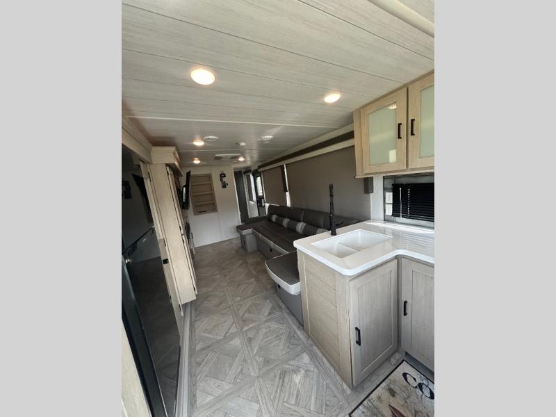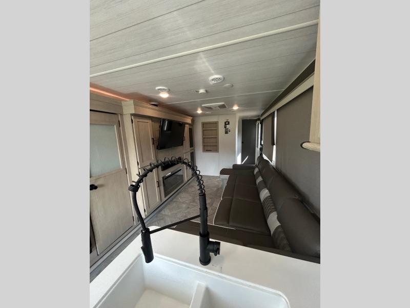 Your family of four or will enjoy this Wildwood View bunk model featuring 105 square feet of window space for unbelievable views of your surroundings. The Versa Slide features a refrigerator, pantry, and entertainment center with a door leading to a bunk space including a 30" x 70" flip-up bunk with a mattress pad below, storage cubbies for your things, and a desk with bar stool for any office work that you may need to do while you travel. All is neatly tucked away within the slide behind an entertainment wall with fireplace opposite the sectional sofa which is great for relaxing and entertaining family and friends indoors. The rear kitchen area offers 18 linear feet of countertop space with four bar stools, plus a three burner range and double sink. Your refrigerator and pantry will hold all of your perishables and dry goods, and those are nearby within the Versa slide. Up front, a private bedroom with Versa-Tilt custom king bed which provides 14-1/2" of additional walking around space, plus you will find a wardrobe that has been prepped for a washer and dryer if you choose to add, as well as dual nightstands beneath wardrobes on either side of the bed. A large pass-through storage compartment offers plenty of storage for your outdoor gear, and if you enjoy outdoor cooking, you might want to add the outside kitchen option as well.
