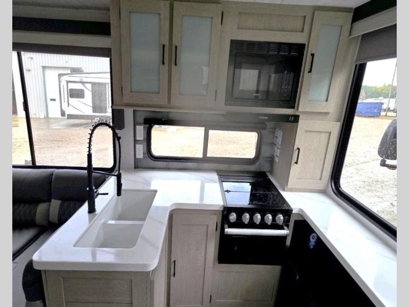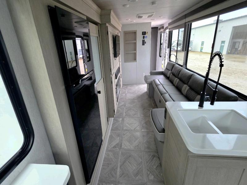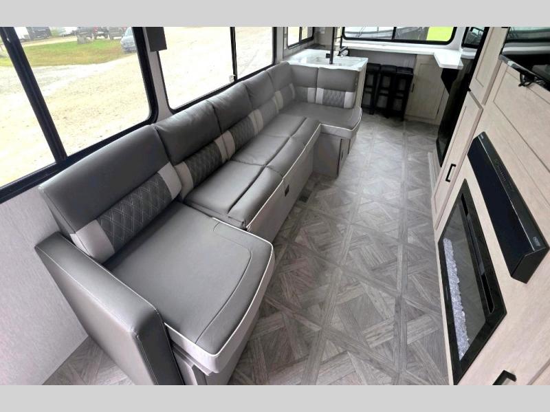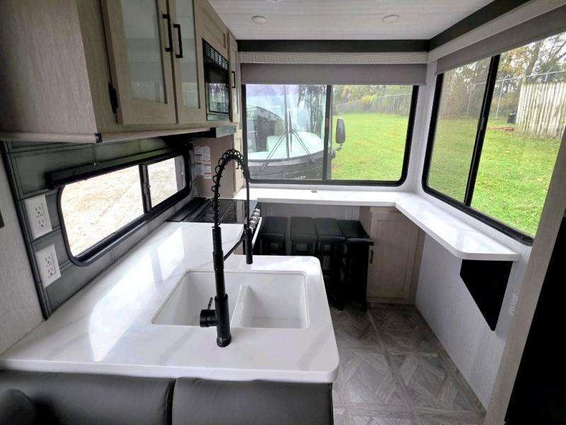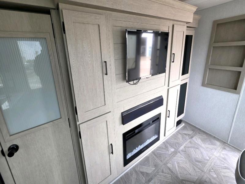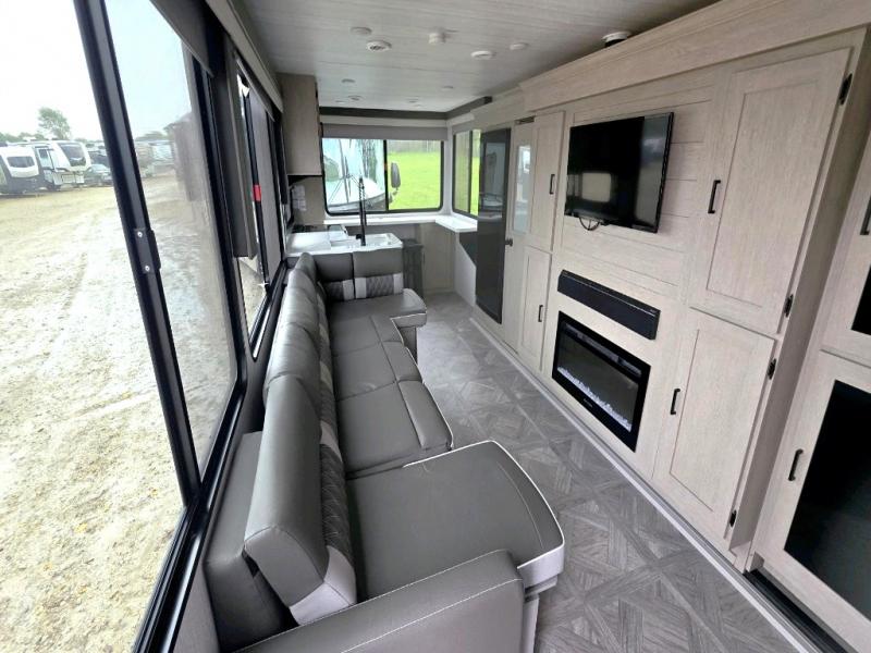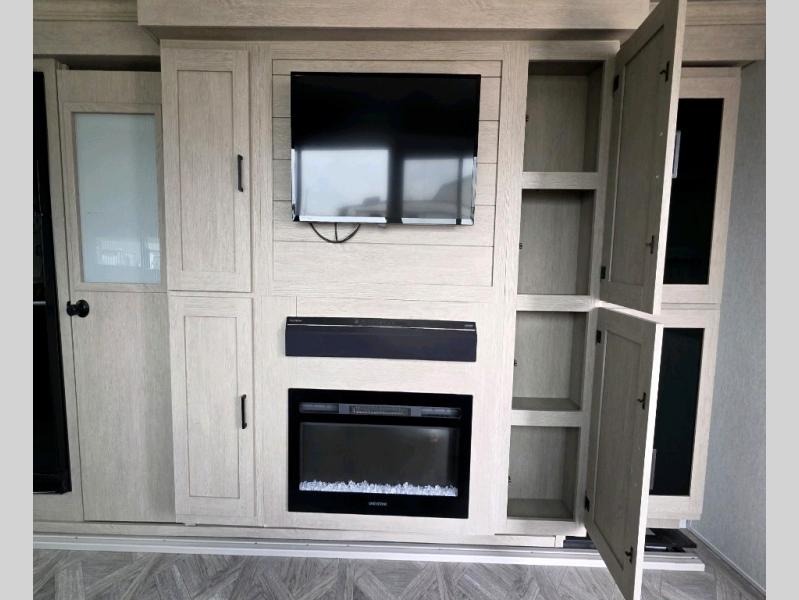 Your family of four or will enjoy this Wildwood View bunk model featuring 105 square feet of window space for unbelievable views of your surroundings. The Versa Slide features a refrigerator, pantry, and entertainment center with a door leading to a bunk space including a 30" x 70" flip-up bunk with a mattress pad below, storage cubbies for your things, and a desk with bar stool for any office work that you may need to do while you travel. All is neatly tucked away within the slide behind an entertainment wall with fireplace opposite the sectional sofa which is great for relaxing and entertaining family and friends indoors. The rear kitchen area offers 18 linear feet of countertop space with four bar stools, plus a three burner range and double sink. Your refrigerator and pantry will hold all of your perishables and dry goods, and those are nearby within the Versa slide. Up front, a private bedroom with Versa-Tilt custom king bed which provides 14-1/2" of additional walking around space, plus you will find a wardrobe that has been prepped for a washer and dryer if you choose to add, as well as dual nightstands beneath wardrobes on either side of the bed. A large pass-through storage compartment offers plenty of storage for your outdoor gear, and if you enjoy outdoor cooking, you might want to add the outside kitchen option as well.