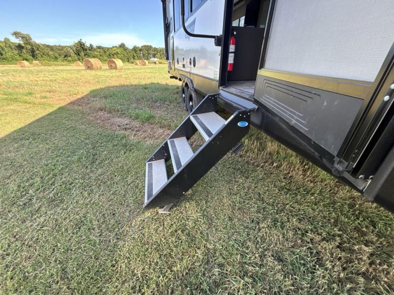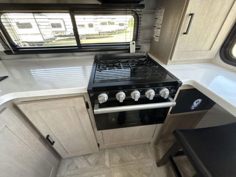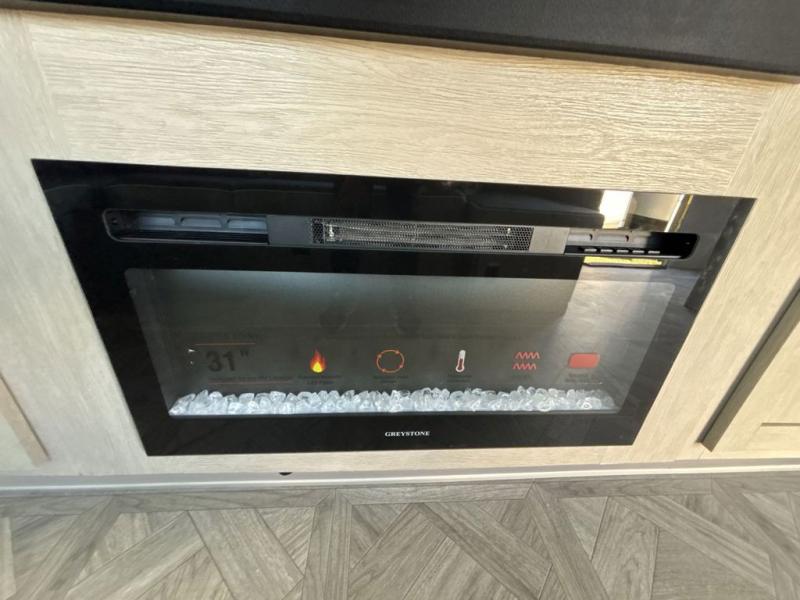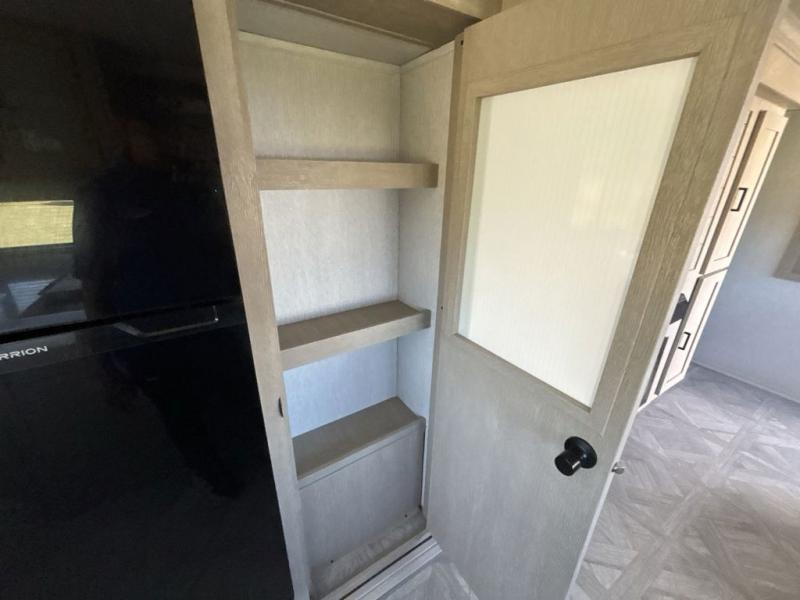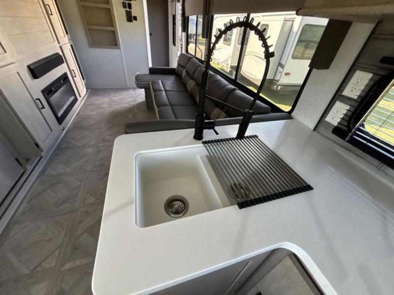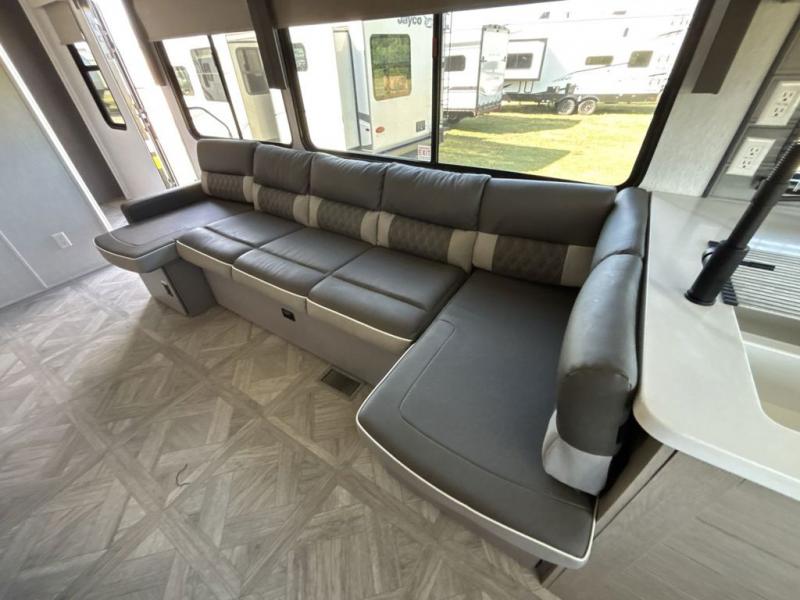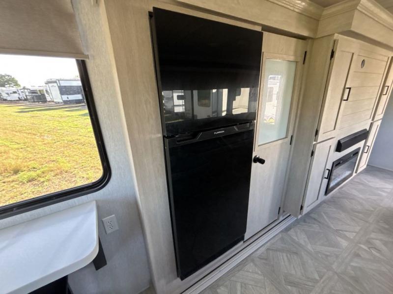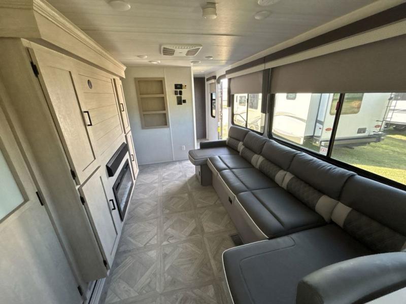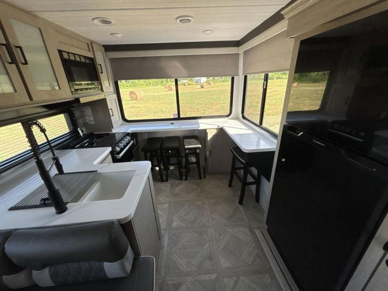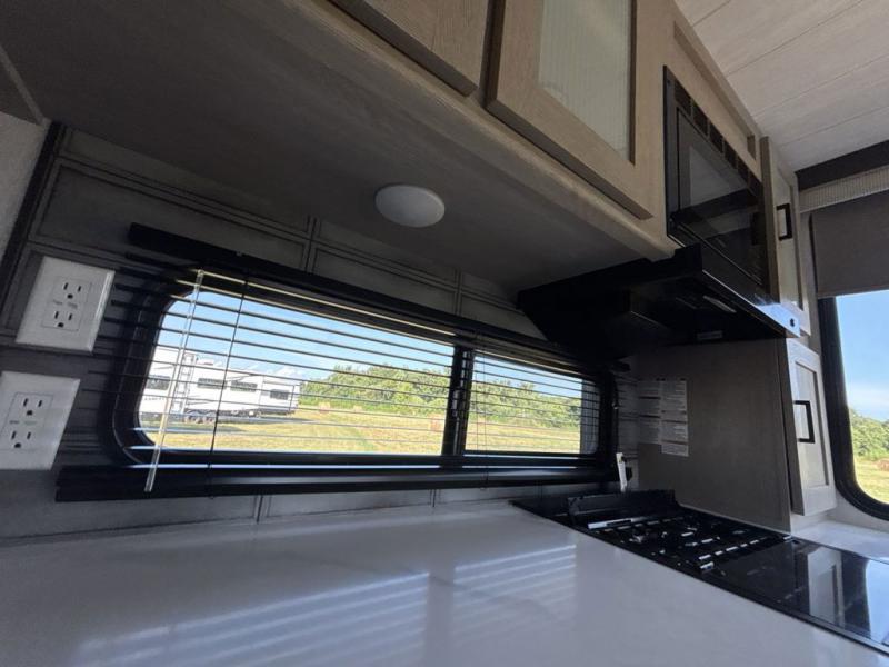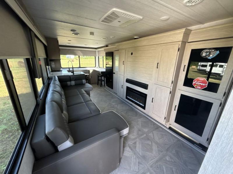 Your family of four or will enjoy this Wildwood View bunk model featuring 105 square feet of window space for unbelievable views of your surroundings. The Versa Slide features a refrigerator, pantry, and entertainment center with a door leading to a bunk space including a 30" x 70" flip-up bunk with a mattress pad below, storage cubbies for your things, and a desk with bar stool for any office work that you may need to do while you travel. All is neatly tucked away within the slide behind an entertainment wall with fireplace opposite the sectional sofa which is great for relaxing and entertaining family and friends indoors. The rear kitchen area offers 18 linear feet of countertop space with four bar stools, plus a three burner range and double sink. Your refrigerator and pantry will hold all of your perishables and dry goods, and those are nearby within the Versa slide. Up front, a private bedroom with Versa-Tilt custom king bed which provides 14-1/2" of additional walking around space, plus you will find a wardrobe that has been prepped for a washer and dryer if you choose to add, as well as dual nightstands beneath wardrobes on either side of the bed. A large pass-through storage compartment offers plenty of storage for your outdoor gear, and if you enjoy outdoor cooking, you might want to add the outside kitchen option as well.