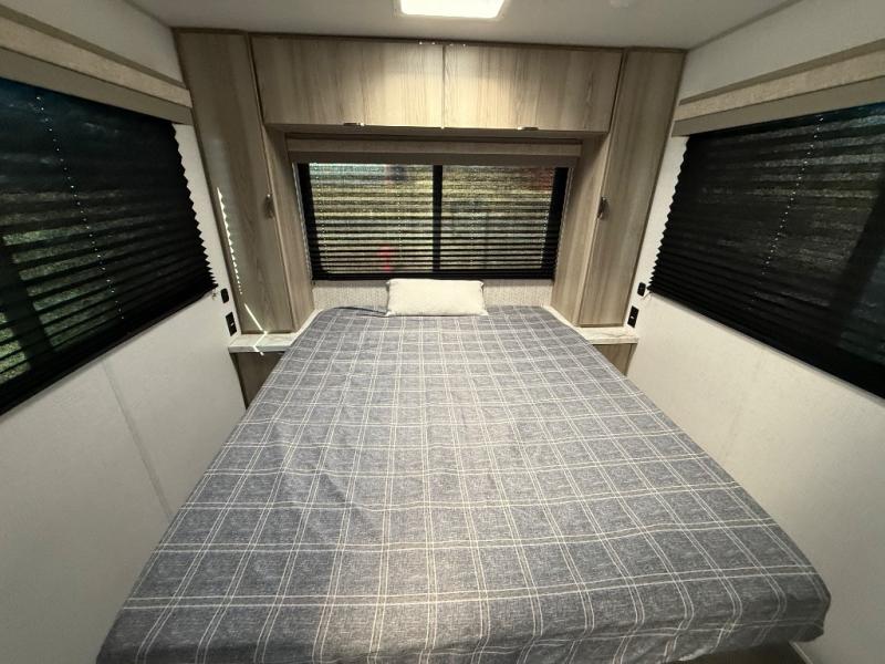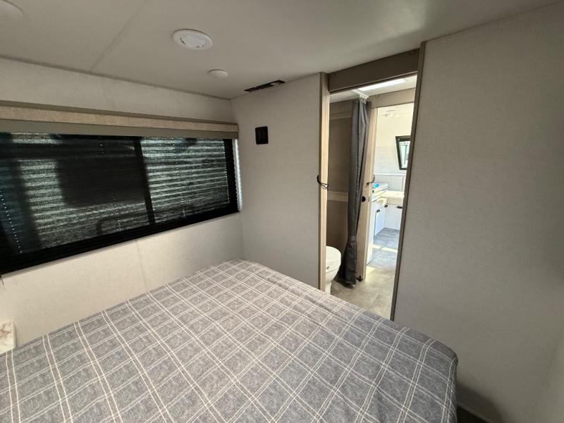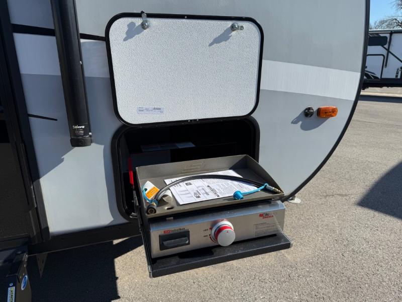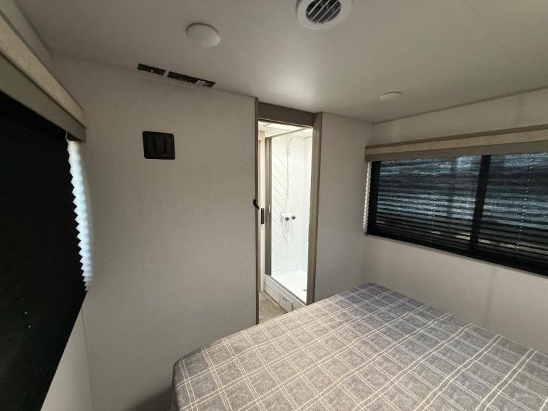 Pack your bags and head to the campground in this cozy travel trailer. Once you arrive you can make lunch on the outside kitchen, and there is a 15' power awning to enjoy an outdoor living space. The U-shaped dinette inside will be perfect for meal times and game night, plus this space can double as additional sleeping space if you have guests. There is a separated bath, with the toilet and sink in one room, and the shower across the hall so two people can freshen up at the same. And don't overlook the rear bedroom with a queen bed, dual wardrobes, plus an overhead cabinet for your things.