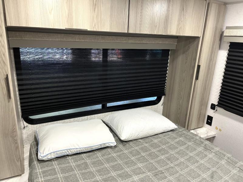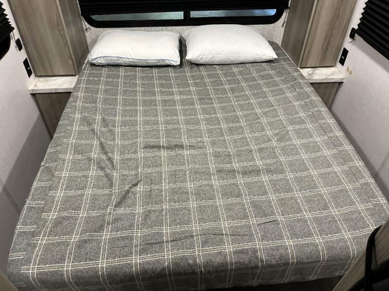 Pack your bags and head to the campground in this cozy travel trailer. Once you arrive you can make lunch on the outside kitchen, and there is a 15' power awning to enjoy an outdoor living space. The U-shaped dinette inside will be perfect for meal times and game night, plus this space can double as additional sleeping space if you have guests. There is a separated bath, with the toilet and sink in one room, and the shower across the hall so two people can freshen up at the same. And don't overlook the rear bedroom with a queen bed, dual wardrobes, plus an overhead cabinet for your things.