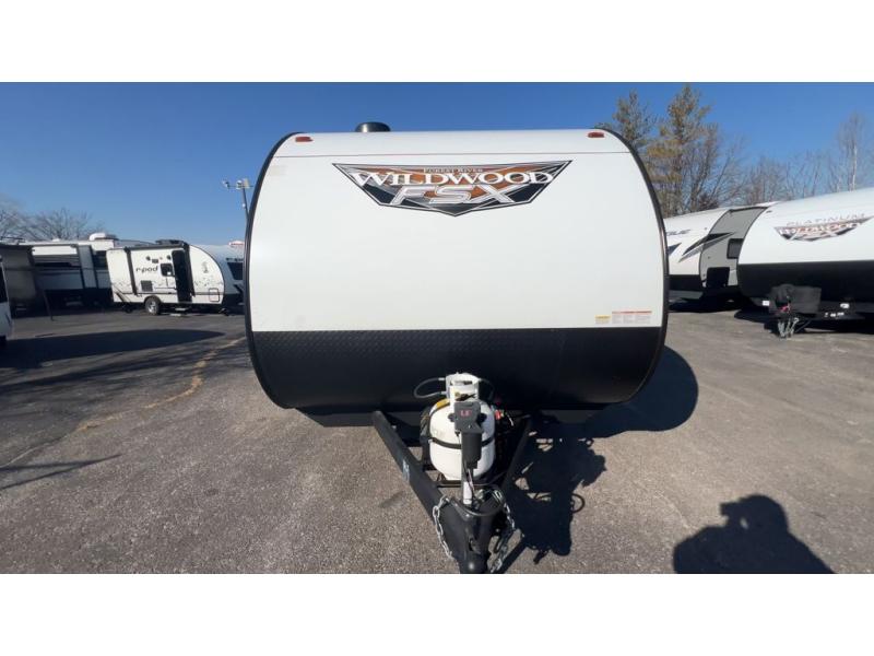 This Limited Edition Wildwood FSX travel trailer is the perfect couples unit! Included you will find a front queen bed with dual wardrobes, and a sofa with overhead storage for seating. Extra thick luxury vinyl flooring is comfortable underfoot and easy to keep clean. The exterior storage has an oversized door for storage so you can fit those bigger items. The Limited Edition Camp Ready package includes a two-burner cooktop with glass stove cover, a microwave oven, roof vents for adequate air flow, a 20 lb. LP bottle, and more.