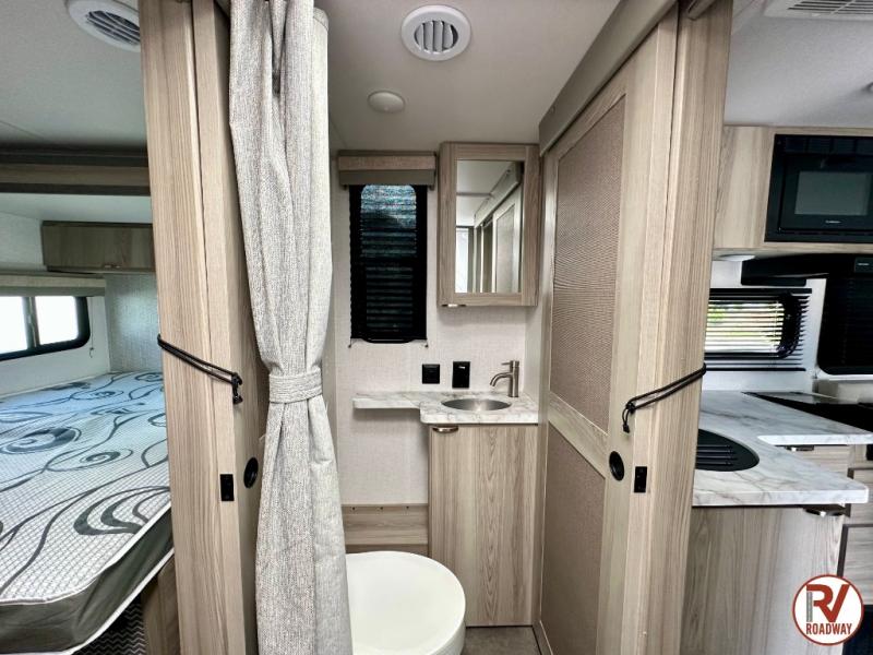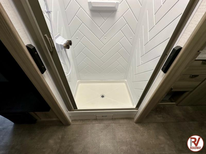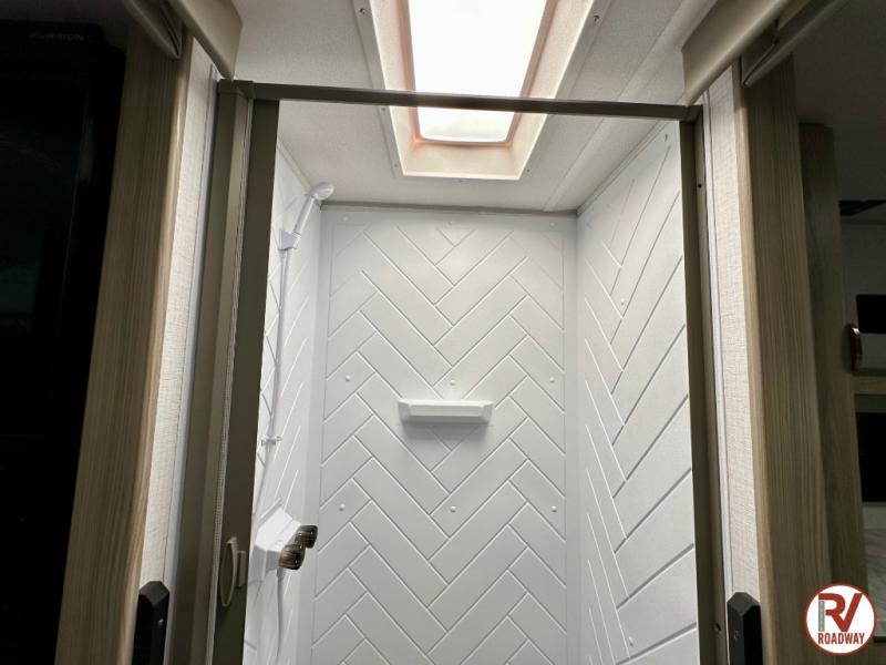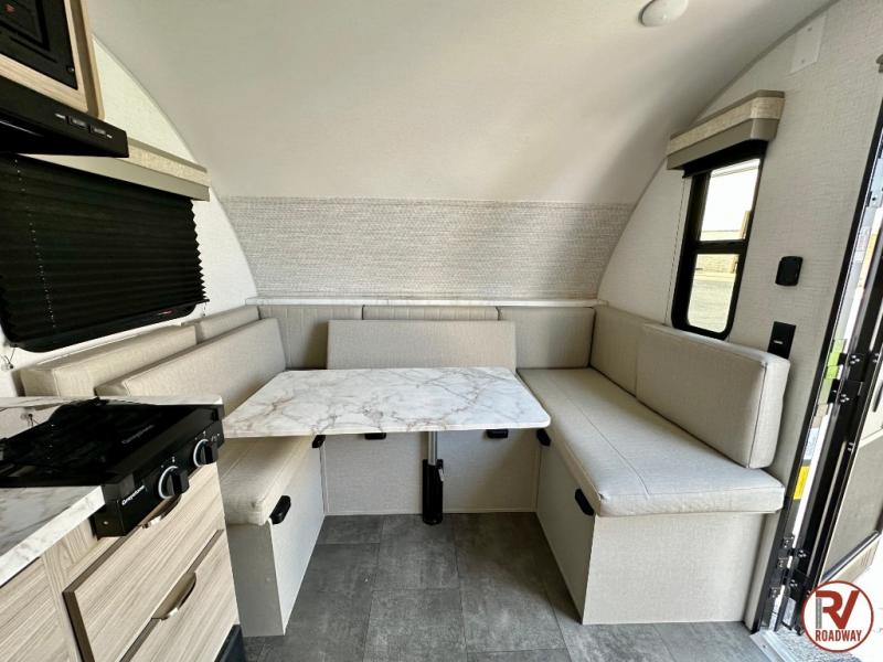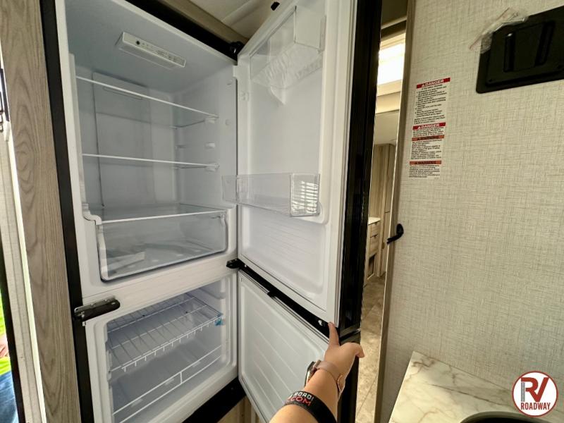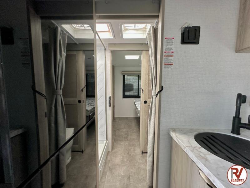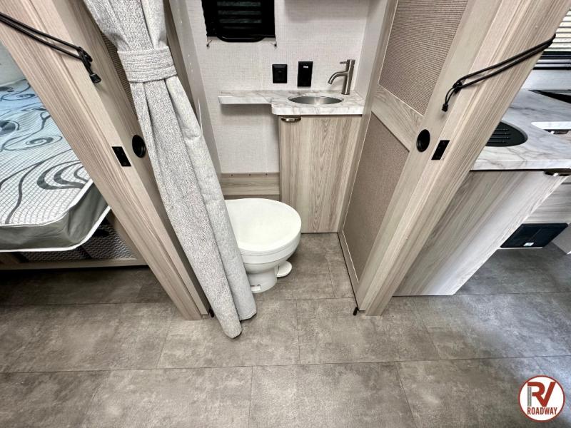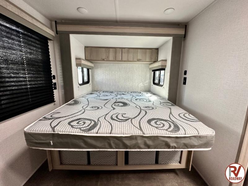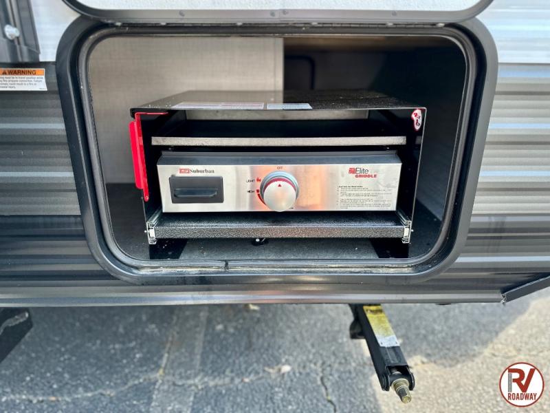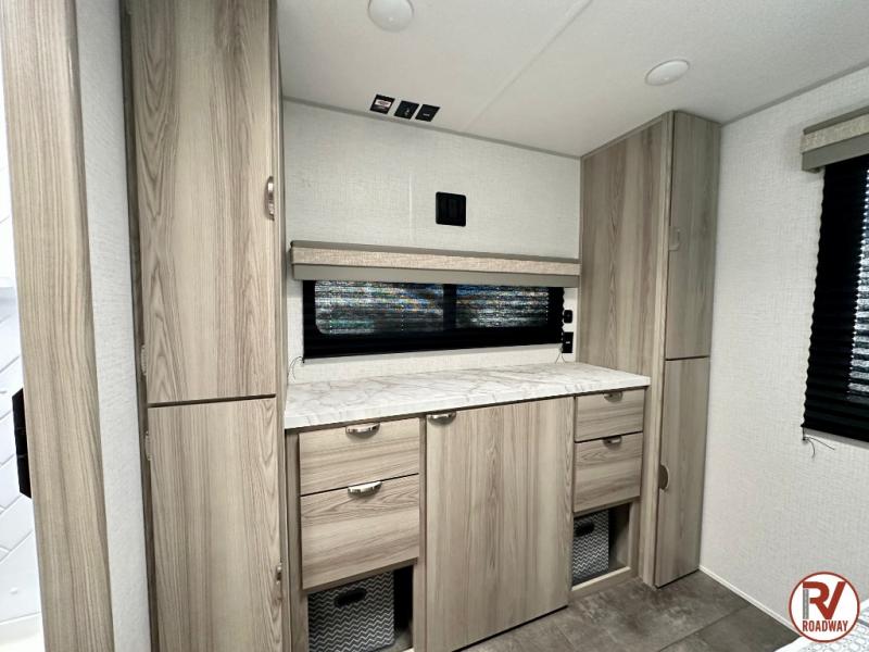 Adventure starts with this travel trailer in tow. Once you arrive at the campground, set up the 15' power awning with LED lights and fill the dog's water bowl using the hot/cold outside shower. Head inside to prepare lunch on the two burner cooktop, and you can dine together around the U-shaped dinette. This area can become your guests' sleeping space at night, while you enjoy the queen bed in the rear bedroom. There is a private toilet and sink, with the private shower right across the hall so two people can get ready for bed at the same time. How convenient!