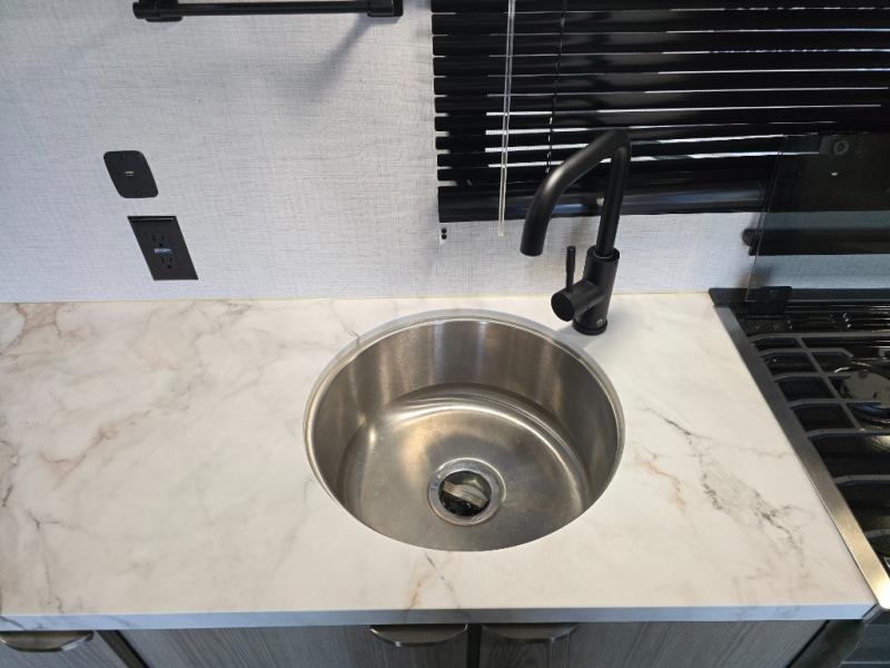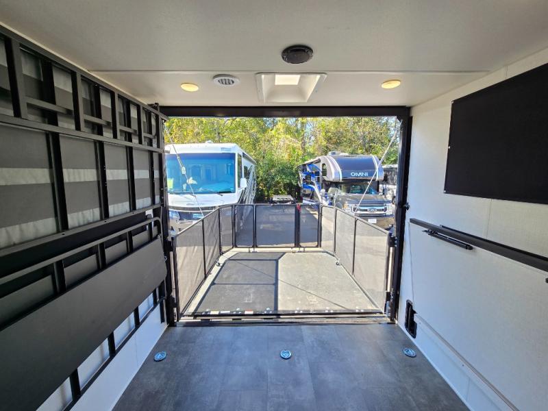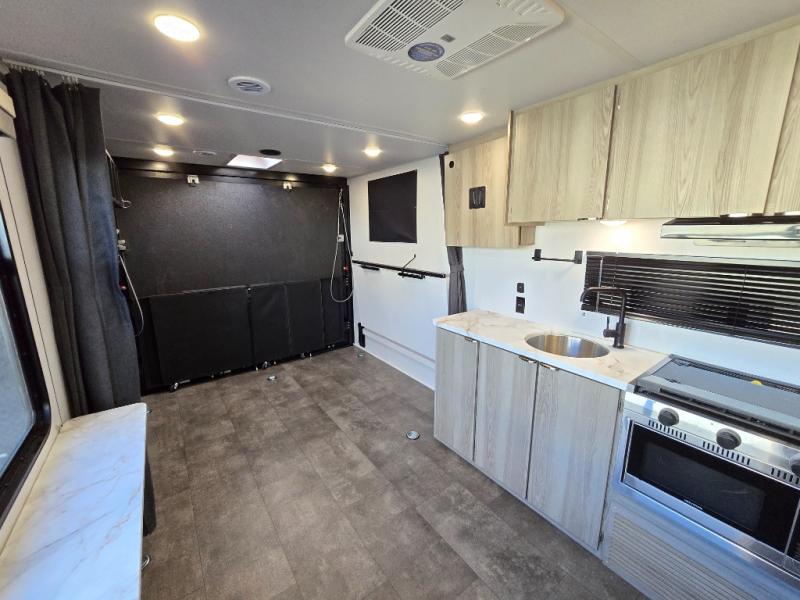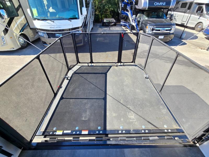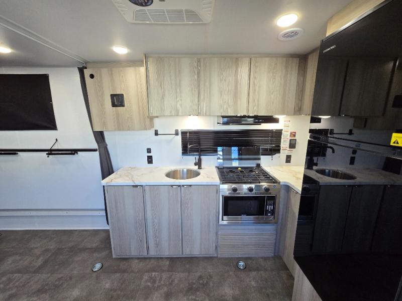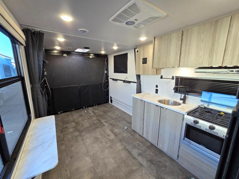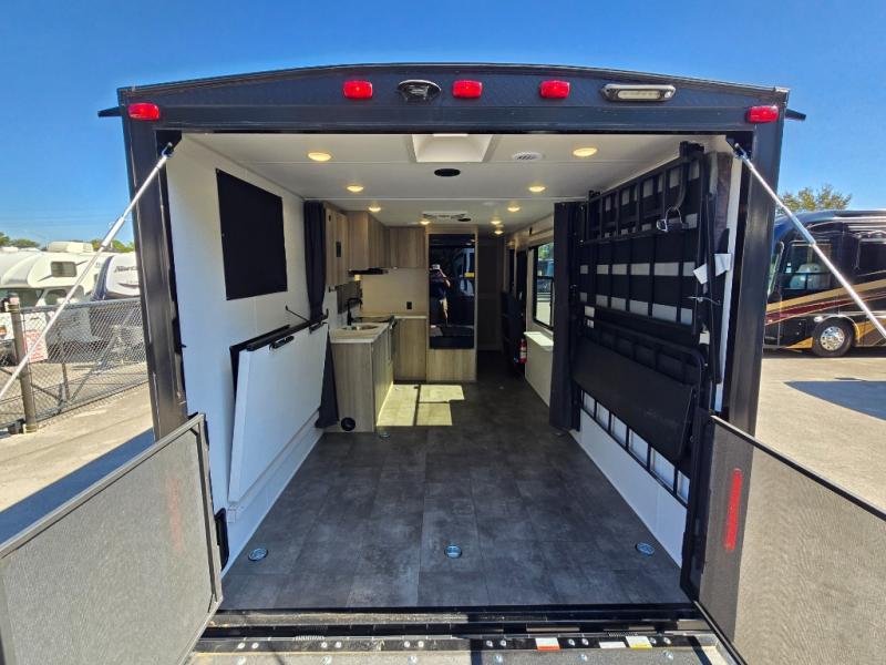 Sleeping for four, 13' of cargo space, and a raised rear ramp patio deck can only mean one thing, a whole lot of fun! Grab your gear and a couple of friends and head out for a camping weekend in the playground of your choice. Bring the quad, bikes, or take the kayaks to the lake and enjoy all sorts of fun. Unload your toys and gear and set up the double 30" x 72" sofas with a table between in the garage area for added seating during meals, games time, or just hanging out. The kitchen is fully equipped to keep everyone fueled for all the adventures you can create. A full bath with shower including a skylight for added natural light and headroom makes it easy to get cleaned up. Anyone waiting in line can certainly use the hot/cold shower outside to rinse off. When you are ready to sleep, the front private bedroom will be a welcome retreat and you will also find comfortable sleeping for two more with the 30" x 72" sleeper sofas folded down.