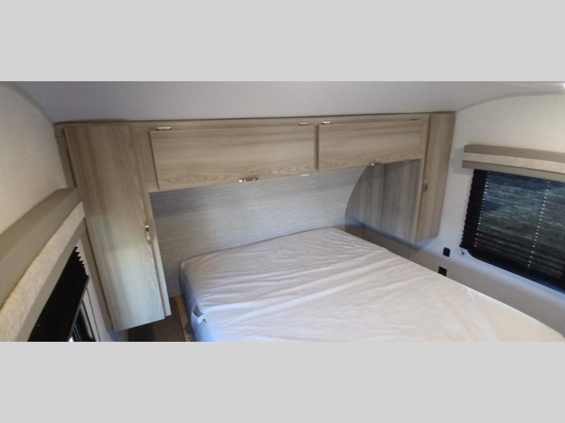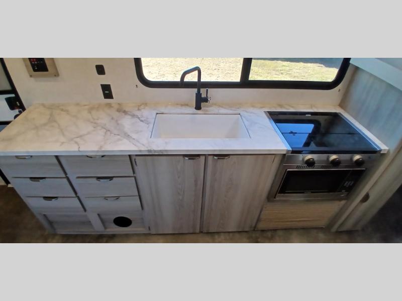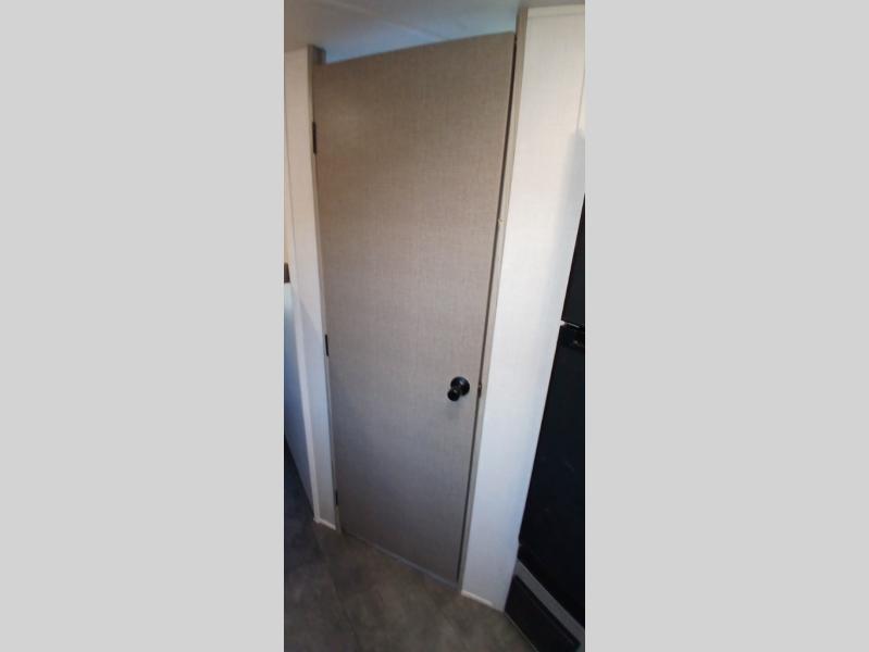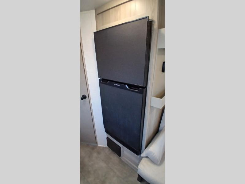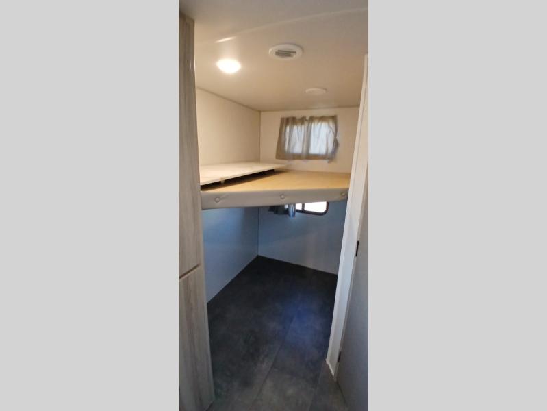 Camping is made easy in this travel trailer with more sleeping space and lots of comforts! The kids or your guests will enjoy the double-size bunks in the back, along with the full bath close by for easy nighttime use. You'll have the front private bedroom with a king bed all to yourselves, and there are dual bedroom wardrobes to keep your space neat and clean. Everyone can meet in the combined kitchen and living room to relax on the super U-lounge with a removable table while the chef of your group makes breakfast on the two-burner cooktop. There is also a microwave oven for quick meals, plus a pantry and large under counter refrigerator for food storage!