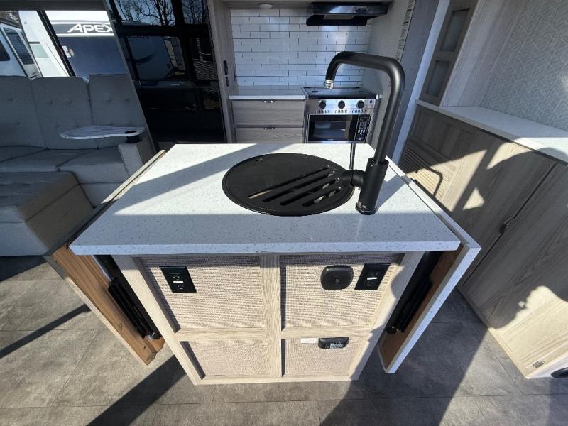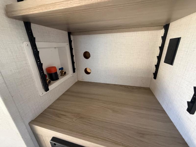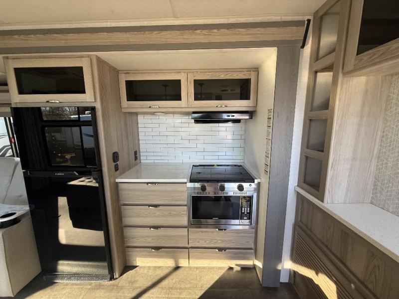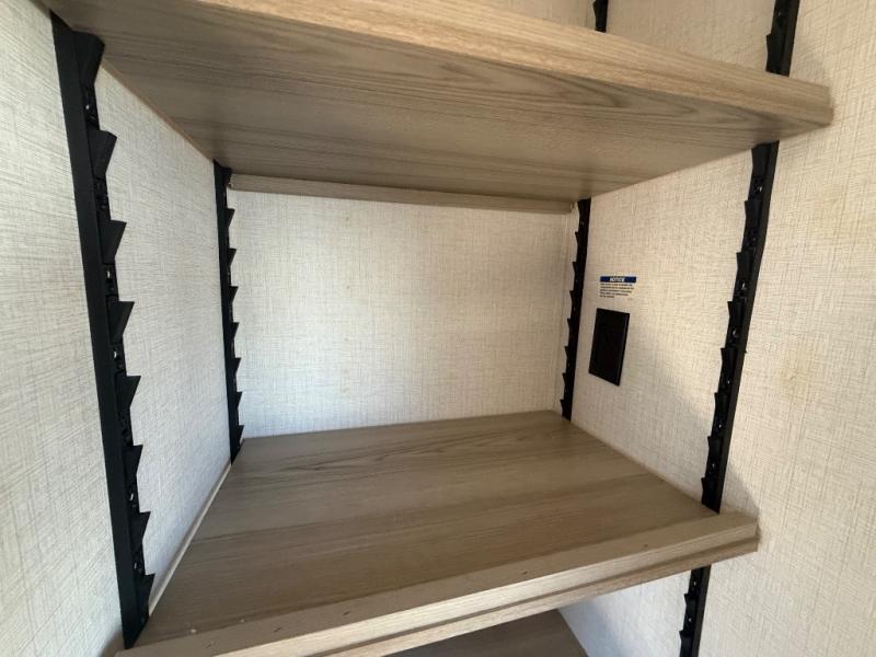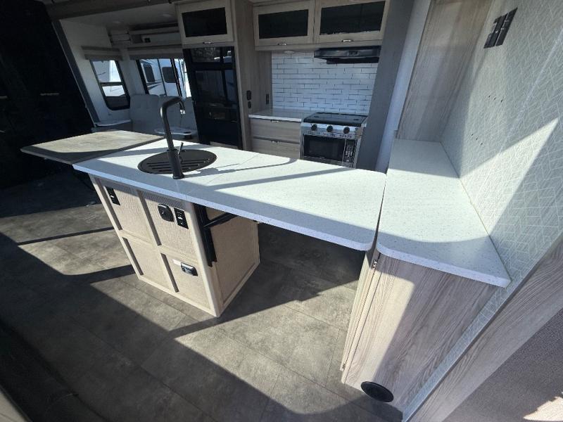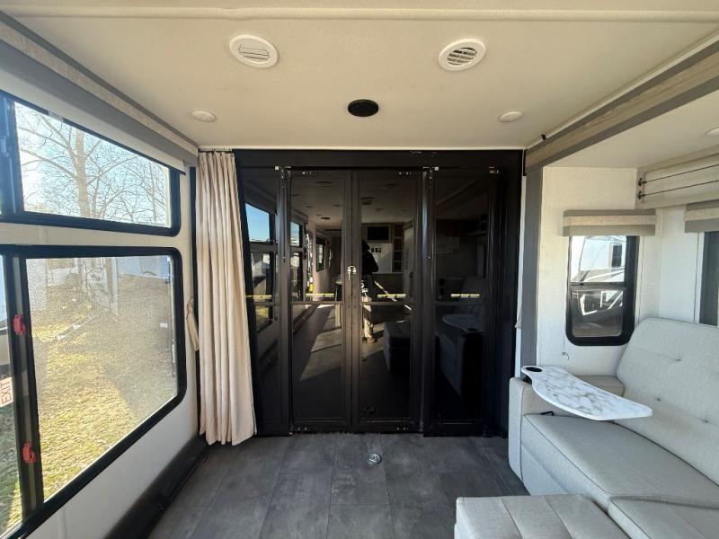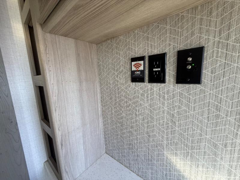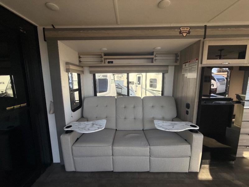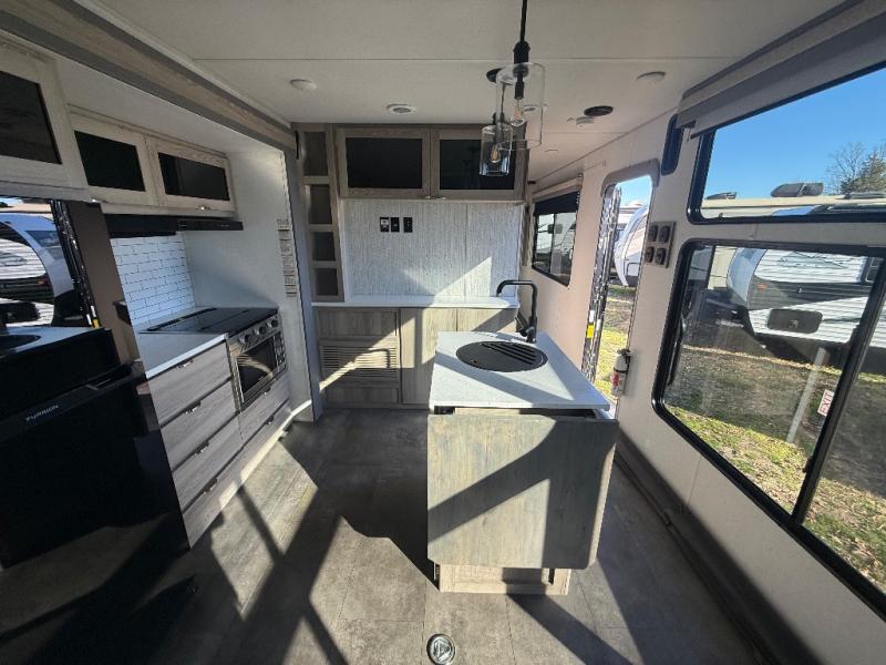 There is a lot to love about this toy hauler! Starting with the 1,500 lb. capacity patio with a three seasons door that leads into the garage area. Once you remove your off-road toy from the 1,500 lb. tie downs, you can open up the slide that houses theater seating with a chaise lounge, a dual swinging 12V refrigerator, and cooktop. The kitchen also has a hutch and island with sink and flip-up countertop. You even have a movie theater projector with premium sound to watch your favorite movies in style. The set of bunk beds have their own privacy with a secret door to access them and a bike door for outside access. Everyone can freshen up with the large shower in the full bathroom. The front private bedroom has a king bed with Versa tilt, wardrobes on either side of the bed, and another wardrobe to keep your clothes looking their best!