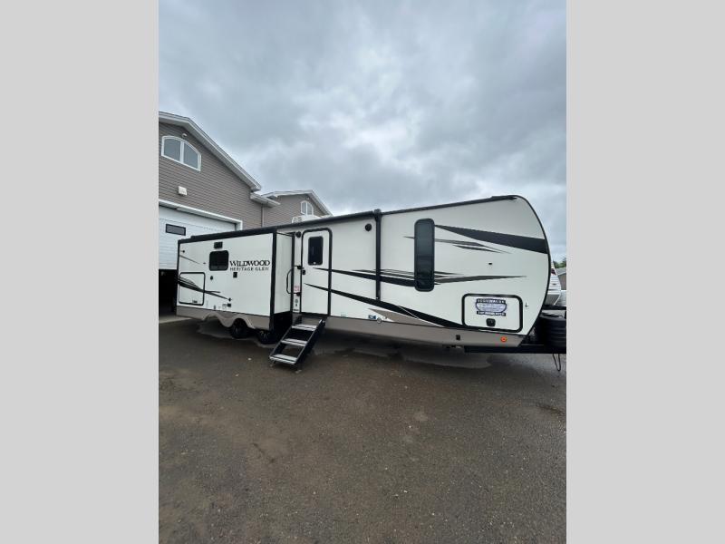 With any Wildwood Heritage Glen travel trailer by Forest River, the quality construction, attention to detail and design along with a bright and welcoming interior allows you to relax in comfort with conveniences while exploring outdoors. Each model includes a WeatherShield one piece fiberglass roof, Goodyear radial tires, and an enclosed underbelly with 12V tank heaters on all holding tanks for added protection. You will appreciate the on-demand tankless water heater, along with the 15K BTU Quite Cool A/C and 50 Amp service with a brace for a second A/C. There is an outside shower with hot and cold water, solar prep, a power stabilizer and tongue jack, plus many more exterior conveniences. Head inside to enjoy Nordic marble countertops throughout, yacht trim ceiling finishes, and full length barreled ceilings for additional head room.