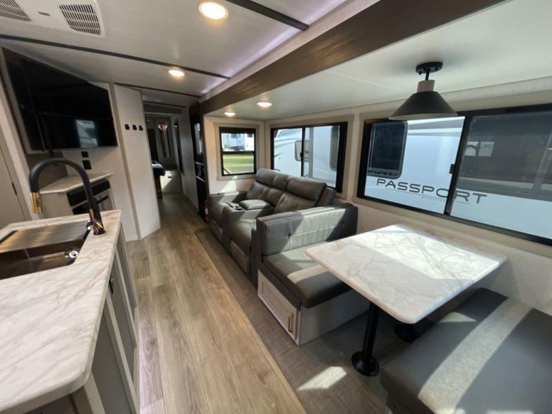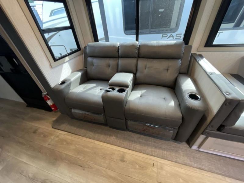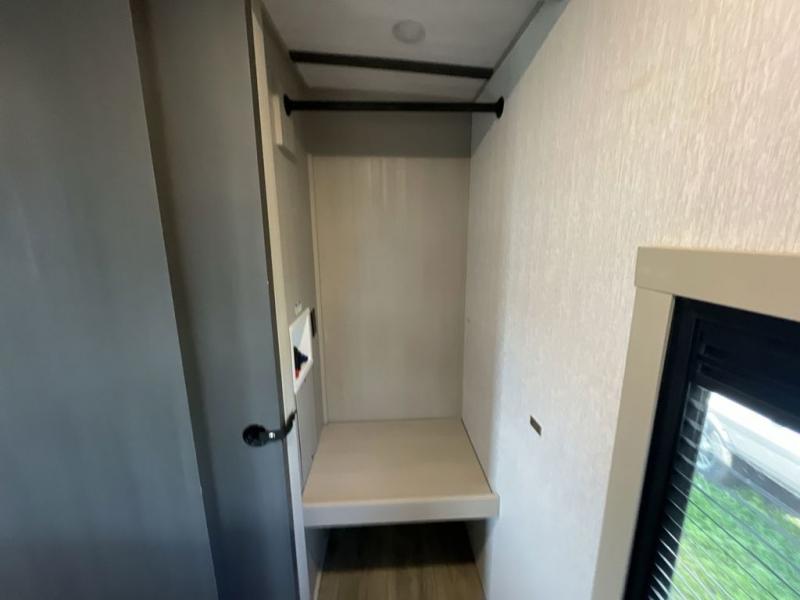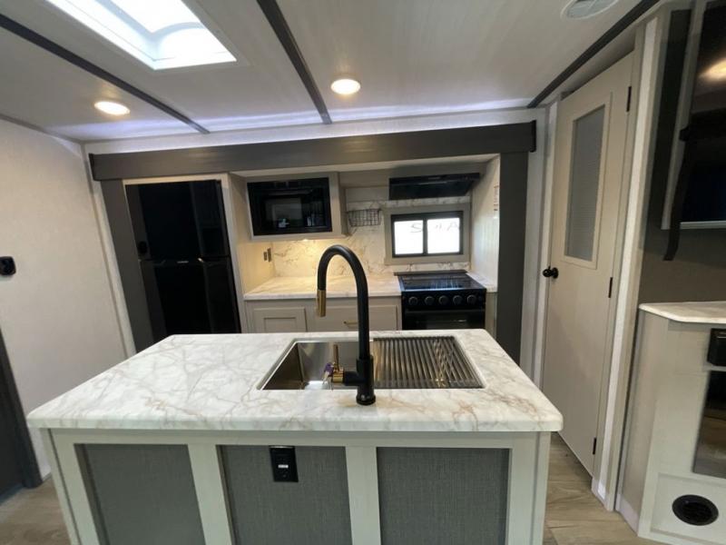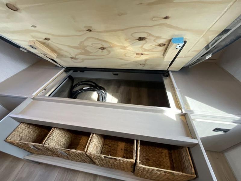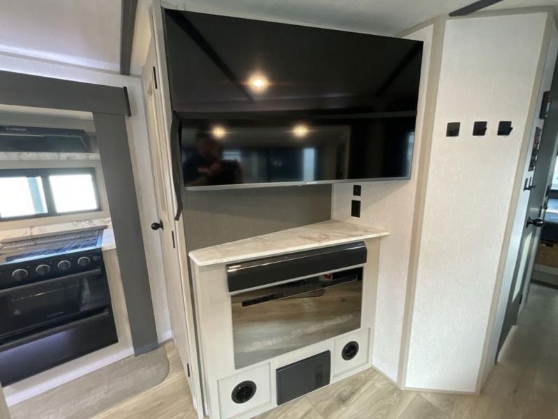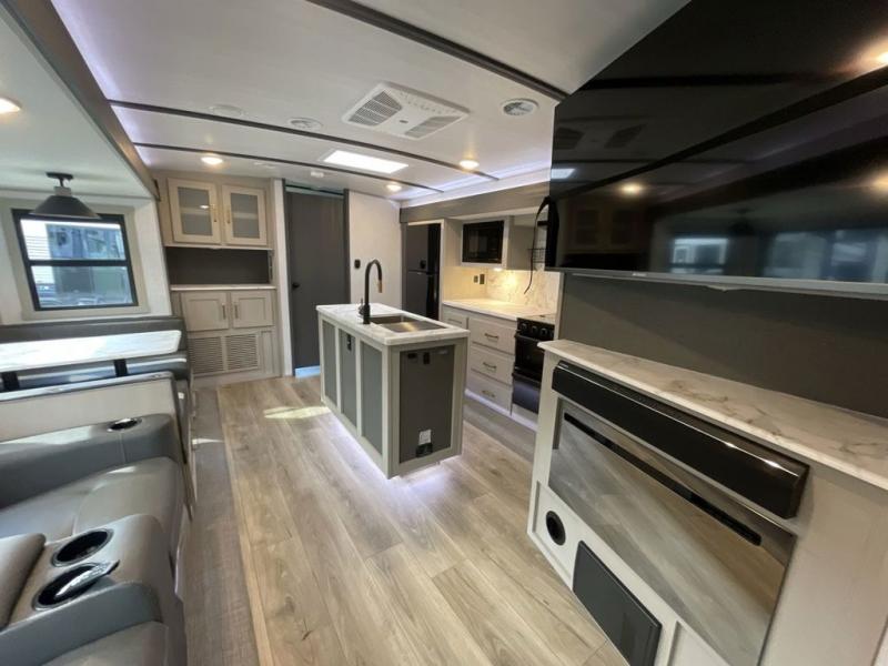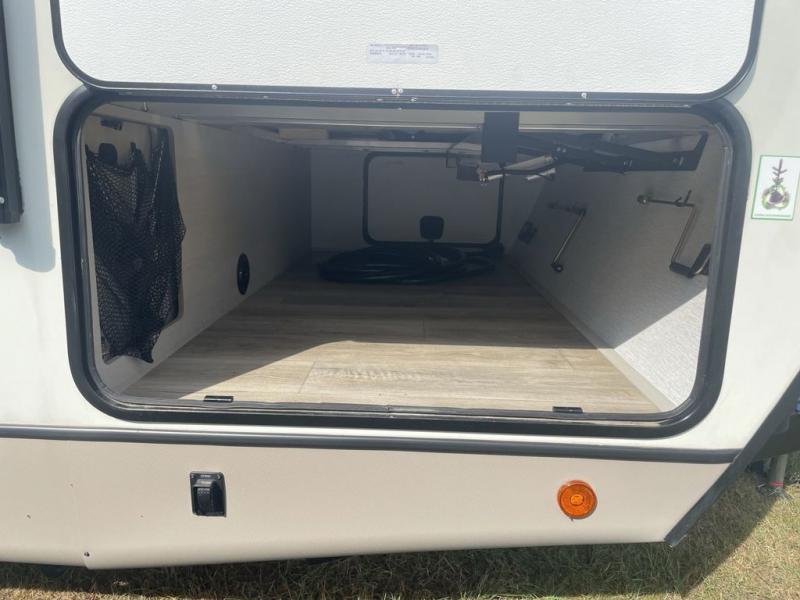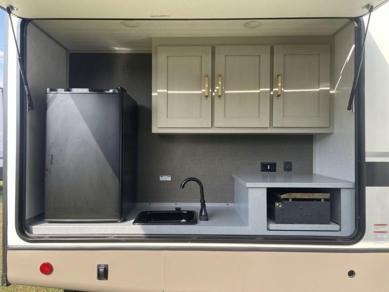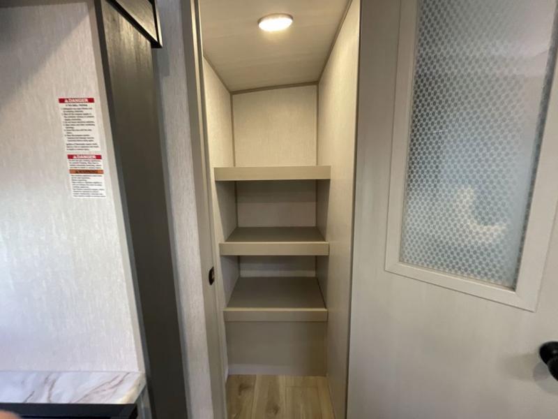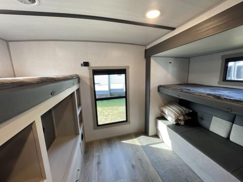 Your kids or friends are ready for a trip in this Wildwood Heritage Glen travel trailer, but are you? As the kiddos or your buddies claim the private bunkhouse for themselves, which includes two bunk beds and a convertible sofa bed, you can escape to your own privacy in the front bedroom with a queen bed with Versa Tilt and lots of storage. There is even washer/dryer prep for added convenience. The main living area and kitchen might be the next indoor hangout spot thanks to the chef-size walk-in pantry and 12V refrigerator. The cook even has a choice of making meals on the outside kitchen/bar which also includes an LP quick connect nearby. On rainy days, the theatre seats and booth dinette will offer a place to watch TV and play games, and the panoramic windows will always offer beautiful scenery no matter the weather conditions.