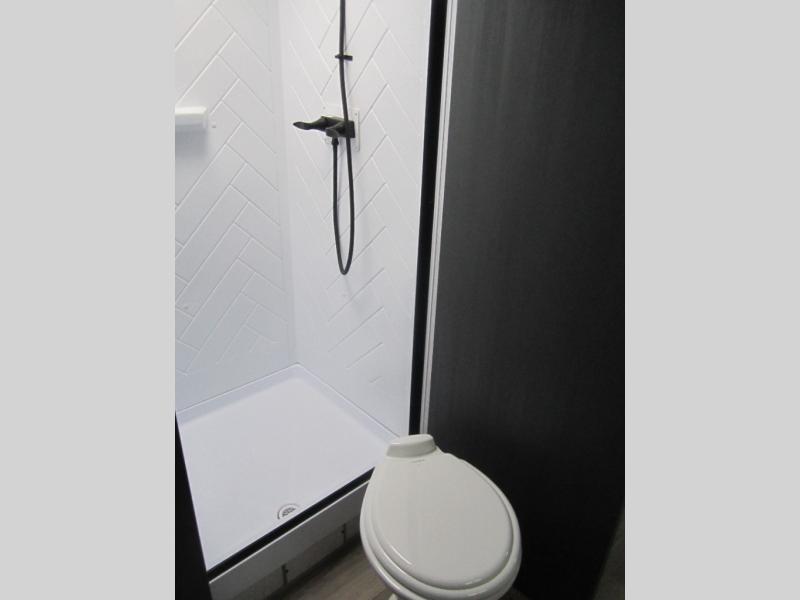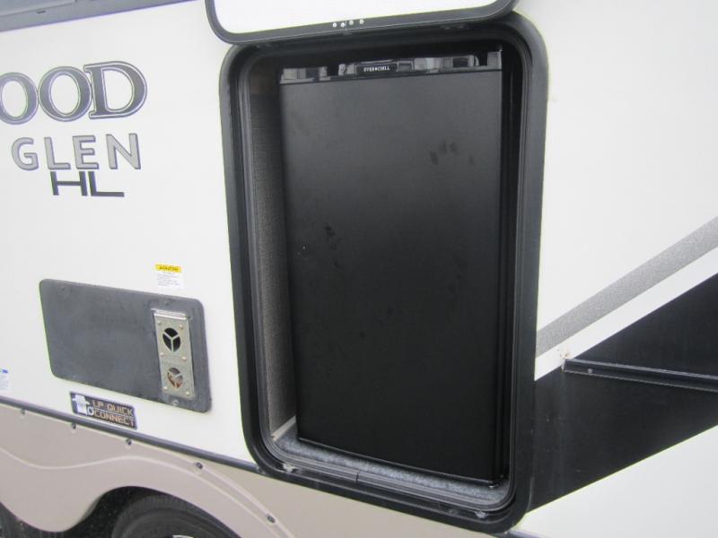 The Wildwood Heritage Glen Hyper-Lyte travel trailer by Forest River offers stability with a wide stance axle system, easy setup with a power tongue jack with an LED docking light, and safe entry with the Step Above aluminum entry steps. The XL Max-Tint panoramic window(s) in the main slide bring the outside inside, plus the kitchen offers a recessed glass stove top cover, a Midnight glass range hood and microwave, plus more. You will also find a back-up camera prep and solar prep, an outdoor shower, black-accented upgraded aluminum wheels, and many more exterior conveniences.