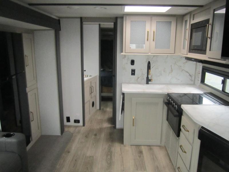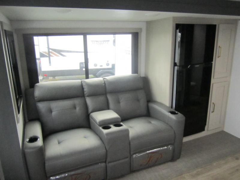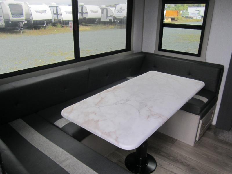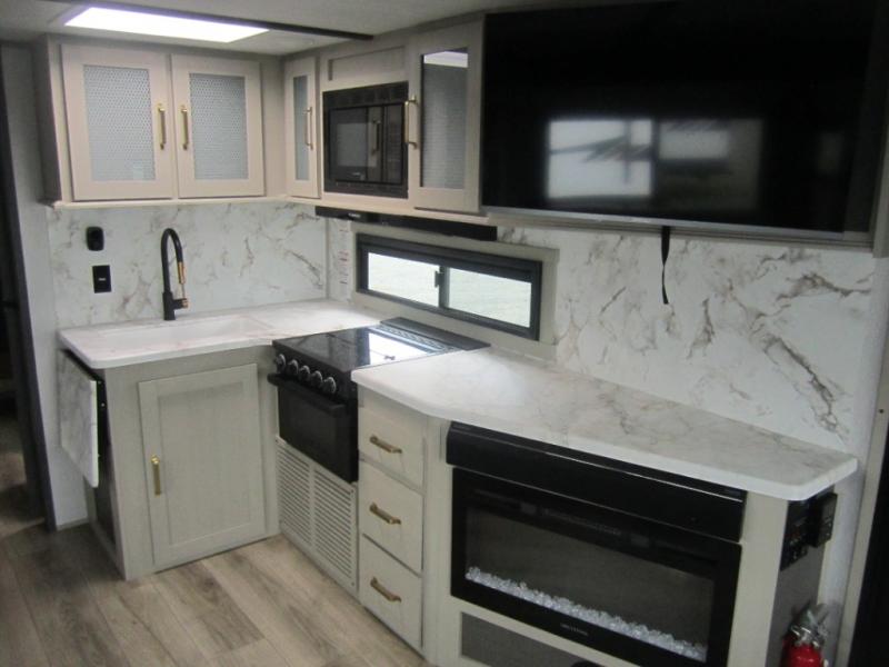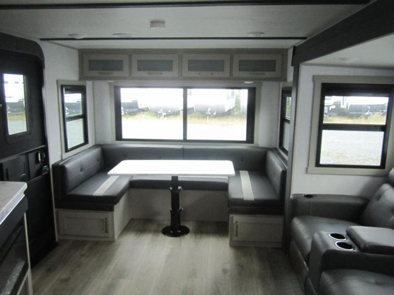 If you've been looking to upgrade your RV, the time is now and the this travel trailer is the one! You will love being able to cook indoors on the three burner cooktop or outdoors on the exterior griddle, plus there is a 19' awning with LED lights for an inviting space. Inside, you can dine around the U-shaped dinette, and this area can become sleeping space for one to two guests. Kick up your feet on the theater seating across from the 40" LED TV and fireplace, then clean up in the walk-through bath before bed. Speaking of bed, you'll love the walk-around queen bed with Versa-Tilt in the master bedroom, and you'll find the second entry door here as well for convenience!