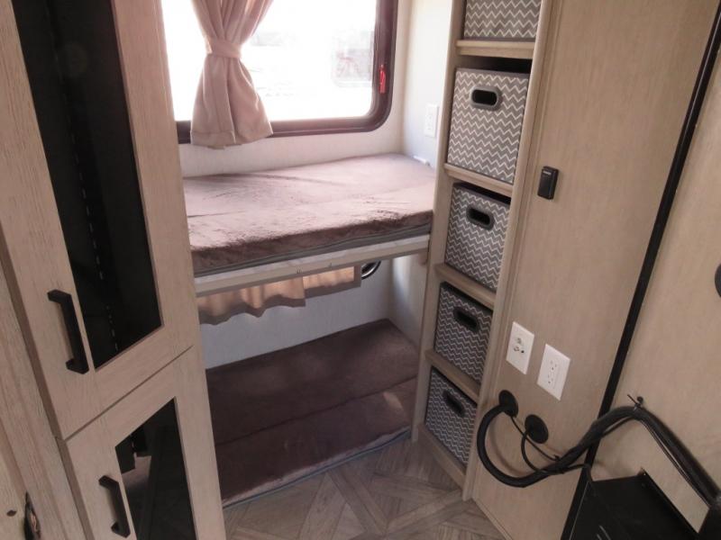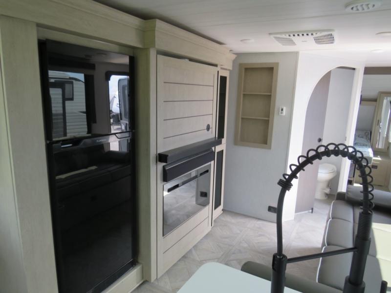 You're going to fall in love with this travel trailer that can sleep five to six each night. The front private bedroom includes a Versa-Tilt custom king bed and dual wardrobes to keep your things tidy. In the living room, a swiveling entertainment center hides the hinged mattress with a mattress below, along with a desk beneath the mattress pad and storage cubbies, making this space a hidden bunkhouse or office space! The L-shaped sofa is right across from the fireplace so you can enjoy your evenings, and the rear kitchen is sure to be a big hit with the cook. Here, you'll find wrap-around counter space with a flip-up table, two stools, plus all the appliances to cook and store food.