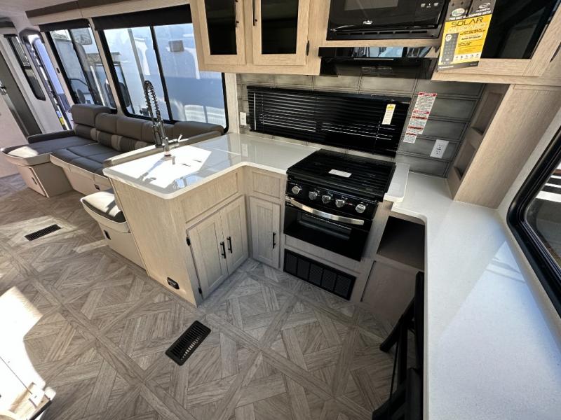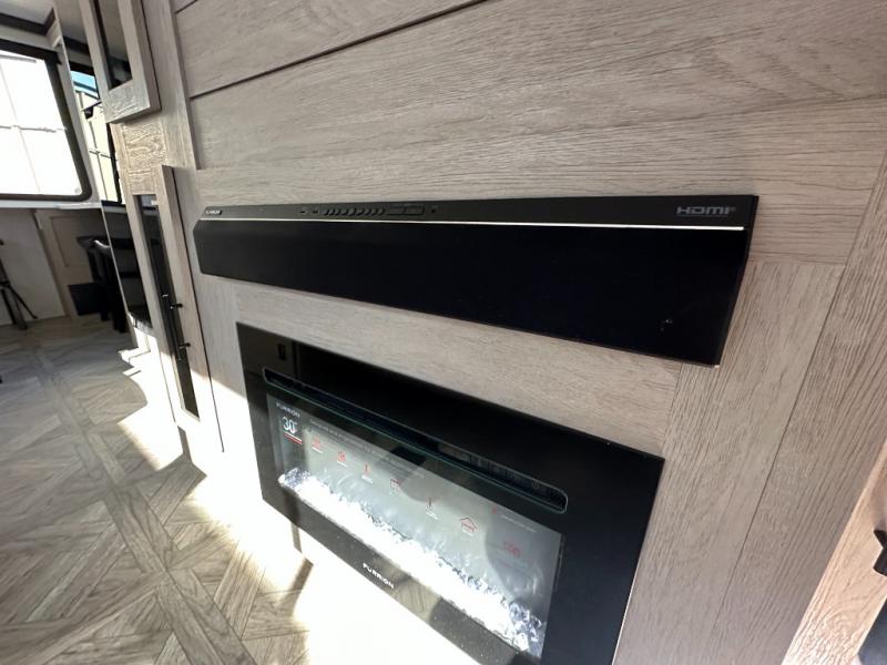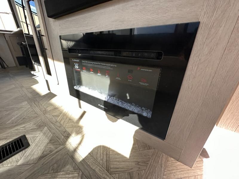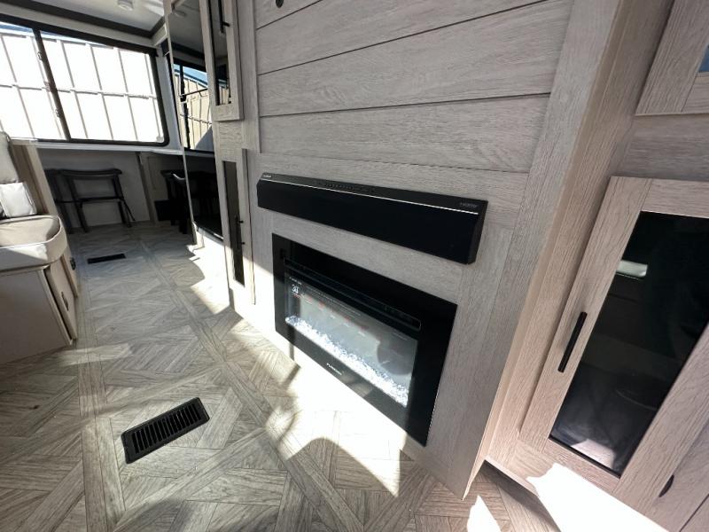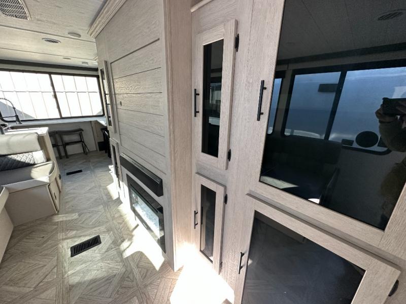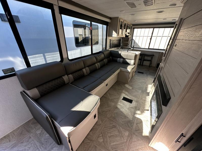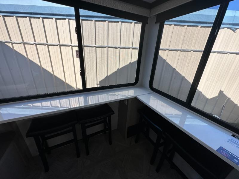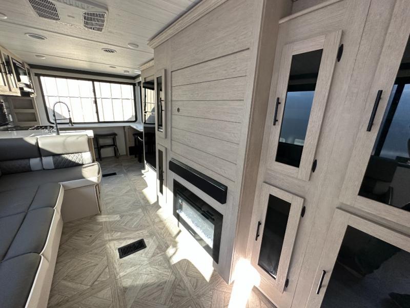 Your family of four or will enjoy this Wildwood View bunk model featuring 104.5 square feet of window space for unbelievable views of your surroundings. The Versa Slide features a refrigerator, pantry, and entertainment center with a door leading to a bunk space including a set of 30" x 70" bunks with top flip-up bunk, storage cubbies for your things, and a desk with bar stool for any office work that you may need to do while you travel. All is neatly tucked away within the slide behind an entertainment wall with fireplace opposite the sectional sofa which is great for relaxing and entertaining family and friends indoors. The rear kitchen area offers 18 linear feet of countertop space with four bar stools, plus a three burner range and double sink. Your refrigerator and pantry will hold all of your perishables and dry goods, and those are nearby within the Versa slide. Up front, a private bedroom with Versa-Tilt custom king bed which provides 14-1/2" of additional walking around space, plus you will find a wardrobe that has been prepped for a washer and dryer if you choose to add, as well as dual nightstands beneath wardrobes on either side of the bed. A large pass-through storage compartment offers plenty of storage for your outdoor gear, and if you enjoy outdoor cooking, you might want to add the outside kitchen option as well.
