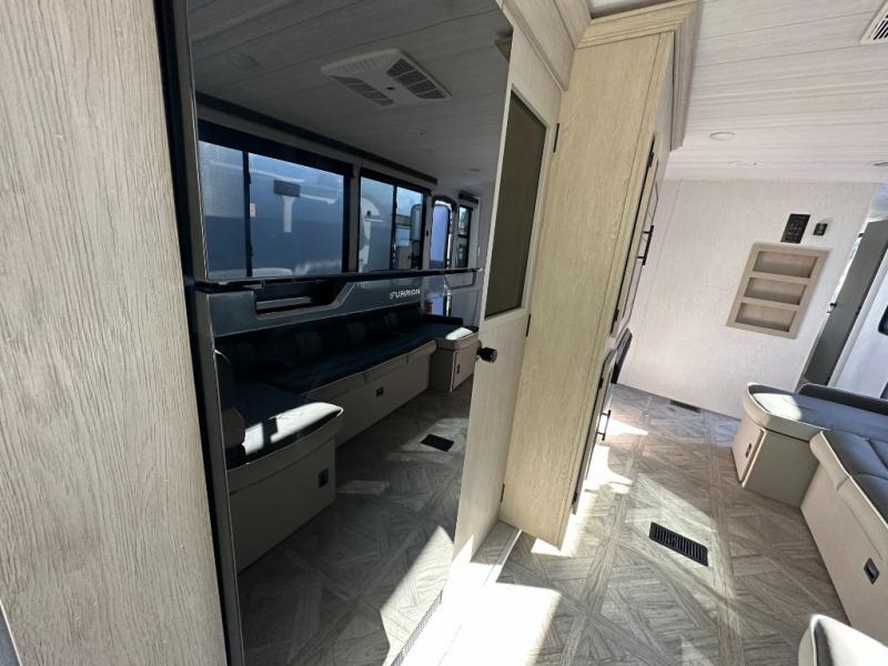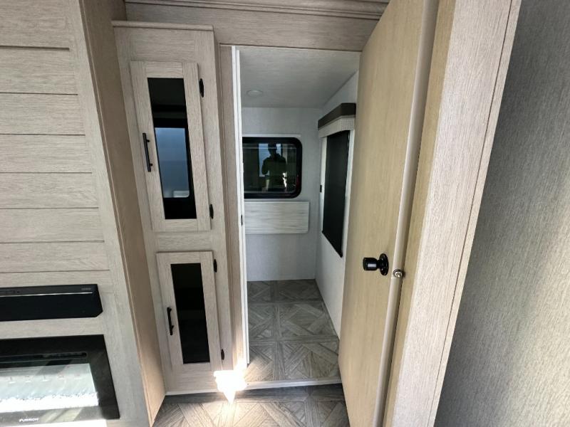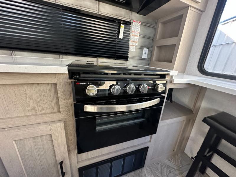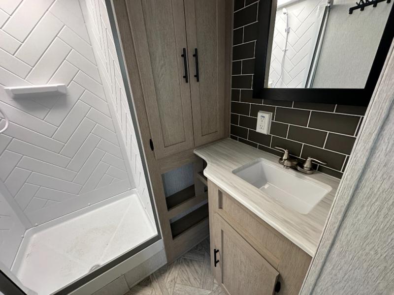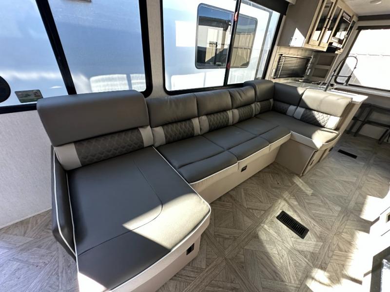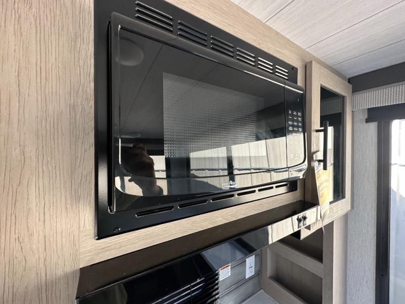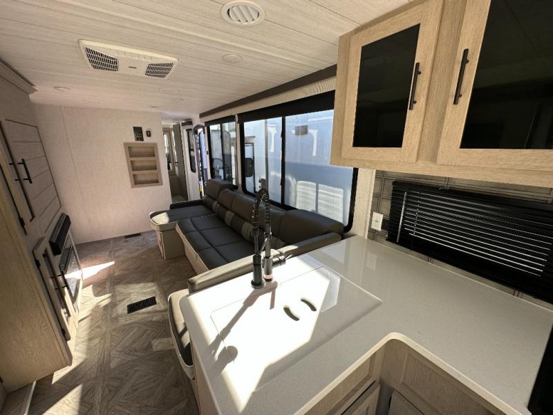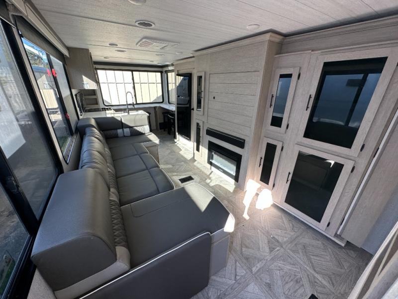 Your family of four or will enjoy this Wildwood View bunk model featuring 104.5 square feet of window space for unbelievable views of your surroundings. The Versa Slide features a refrigerator, pantry, and entertainment center with a door leading to a bunk space including a set of 30" x 70" bunks with top flip-up bunk, storage cubbies for your things, and a desk with bar stool for any office work that you may need to do while you travel. All is neatly tucked away within the slide behind an entertainment wall with fireplace opposite the sectional sofa which is great for relaxing and entertaining family and friends indoors. The rear kitchen area offers 18 linear feet of countertop space with four bar stools, plus a three burner range and double sink. Your refrigerator and pantry will hold all of your perishables and dry goods, and those are nearby within the Versa slide. Up front, a private bedroom with Versa-Tilt custom king bed which provides 14-1/2" of additional walking around space, plus you will find a wardrobe that has been prepped for a washer and dryer if you choose to add, as well as dual nightstands beneath wardrobes on either side of the bed. A large pass-through storage compartment offers plenty of storage for your outdoor gear, and if you enjoy outdoor cooking, you might want to add the outside kitchen option as well.