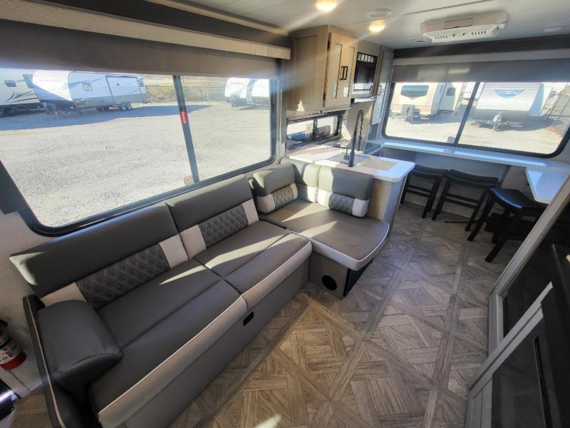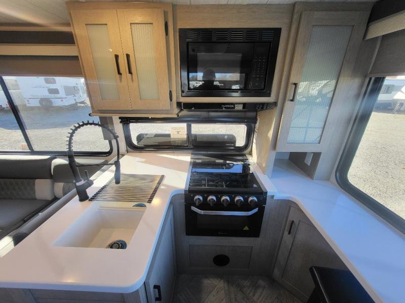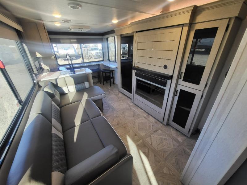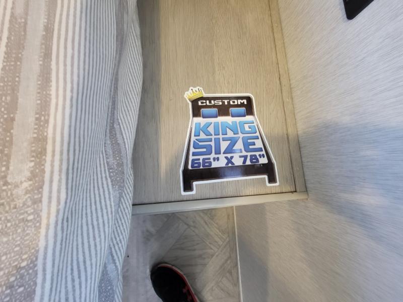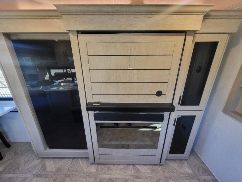Enjoy your surroundings with 64 square feet of windows! So, no matter where you park, you can easily bring the outdoors right inside. The rear kitchen features 18 linear feet of wrap-around counter space including a double sink and a three burner cook-top with overhead microwave oven. There are bar stools for dining inside along the rear counter, and an L-shaped sofa for additional seating in the open living area. Here, behind the entertainment center, is a multi-purpose space hidden behind the shiplap feature wall insert with fireplace including a hinged top mattress above a lower bunk, a desk beneath the mattress if you need office space during the day, along with storage cubbies for your things, all within the Versa-Slide that also houses an oversized refrigerator for all of your perishables. The front private bedroom features a Versa-Tilt custom king bed with dual nightstands and closets, plus overhead storage. You will also find additional storage in a large pass-through beneath on the exterior, and the exterior camp kitchen is sure to be a big hit with the cook!