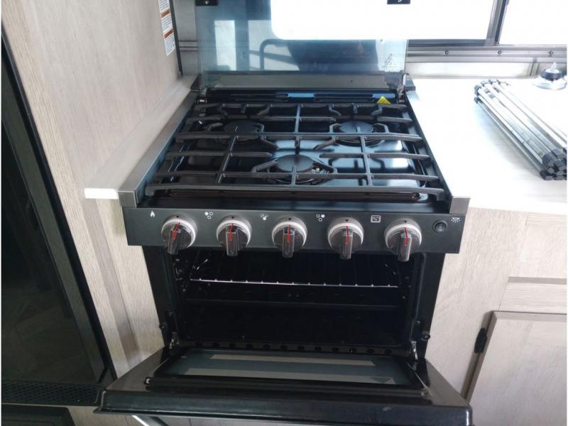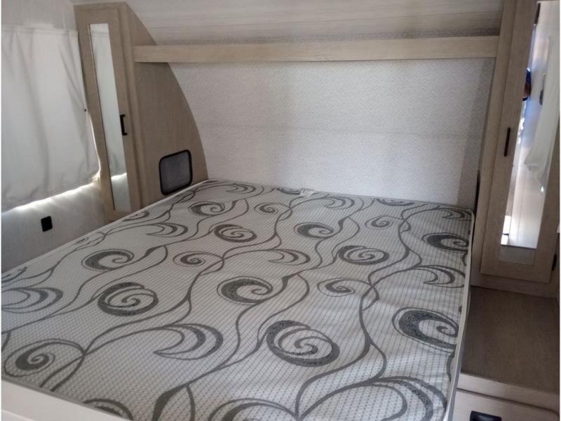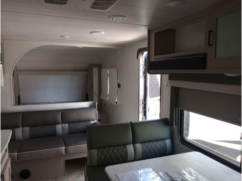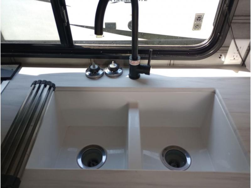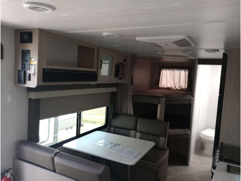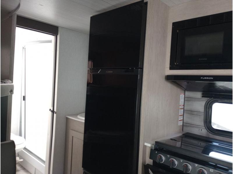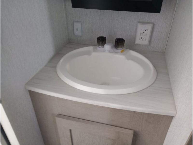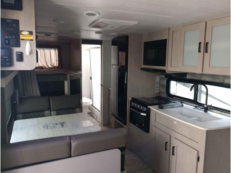 This Wildwood X-Lite travel trailer is packed with features! There is a walk-around custom king bed with Versa-Tilt up at the front that can be sectioned off from the rest of the trailer with a privacy curtain, and the double-size bunks in the back of this trailer will provide you with a compact sleeping space for your little ones. The booth dinette is going to be a great place to sit down together and have a meal when the bugs are too bad outside to sit at the picnic table, and there is also a sofa for relaxation while inside. You will also appreciate the look and function of the seamless countertops in the kitchen, and the 11-cubic foot refrigerator will easily keep your perishable items fresh. There is also an outside camp kitchen option for more choices when cooking for the family.