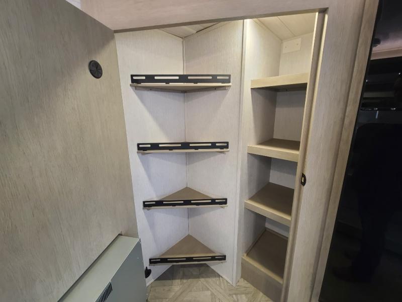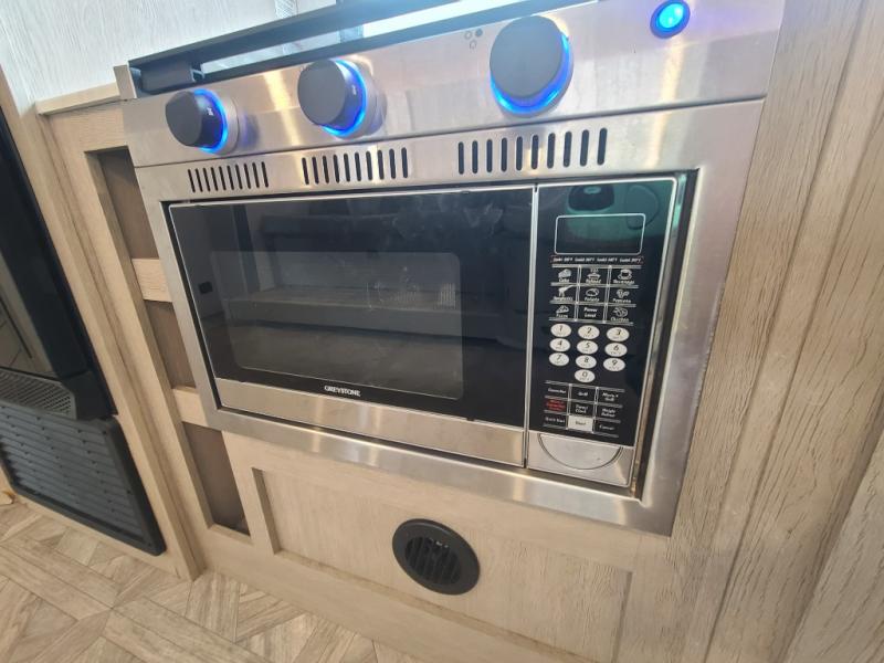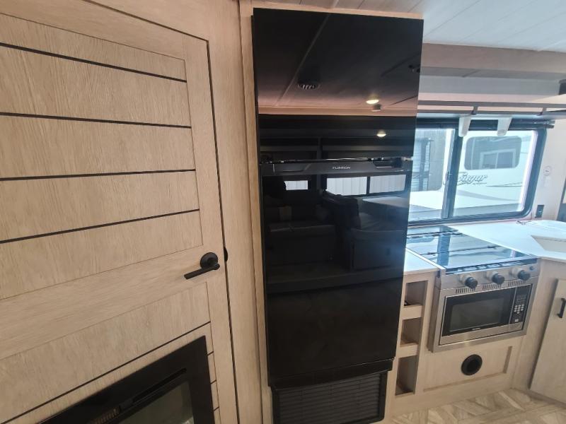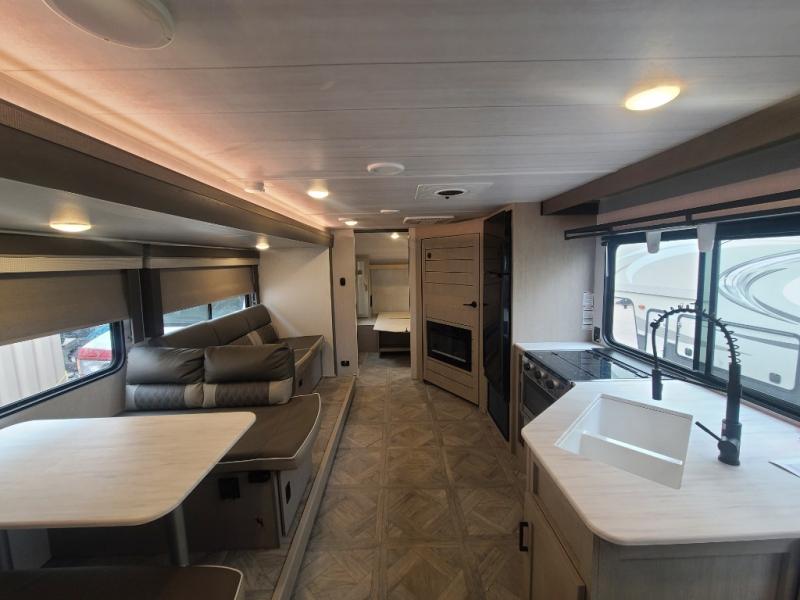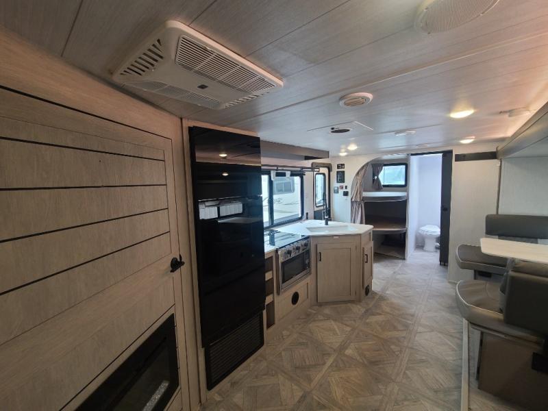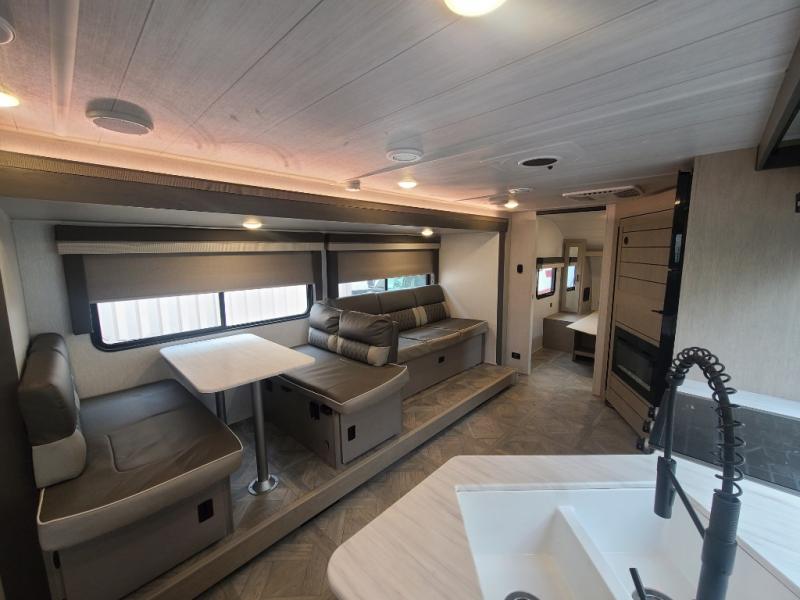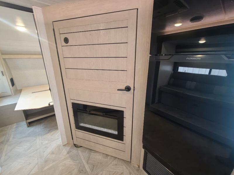 You're sure to make camping memories in this spacious travel trailer! You can easily sleep eight people each night thanks to the double-size bunks, the custom king bed with Versa Tilt in the front bedroom plus the Versa-Lounge within the large slide out! The three burner cooktop and microwave oven will let you make meals each day, and you'll appreciate the hidden pantry with shelves behind the fireplace. There is also a booth dinette where you can dine together or play a game of cards after dinner is cleaned up, or you may just find yourselves outdoors under the 16' power awning with LED lights. And don't overlook the full bath, complete with a tub/shower that will make bath time easier if you have little ones.
